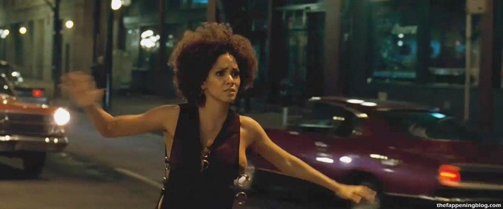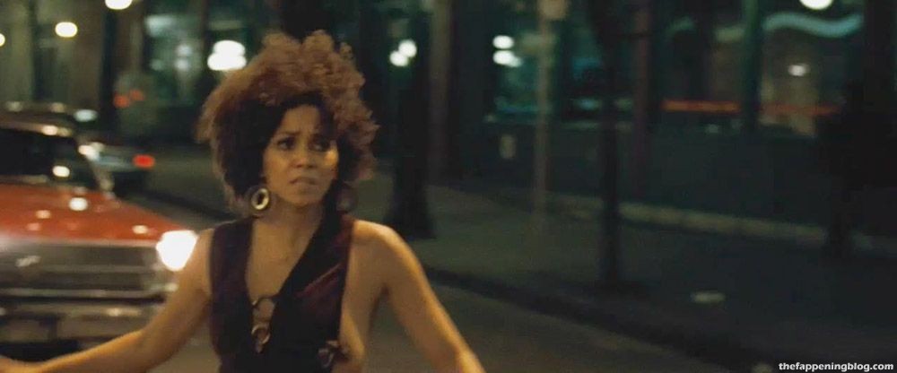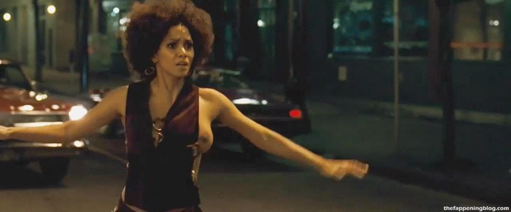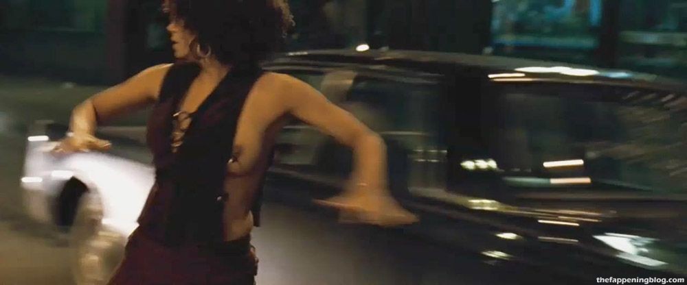 Check out Halle Berry in a scene from ‘Frankie & Alice’. She is stumbling down a sidewalk and into the middle of a street at night; her top getting pulled to the side to expose her boobs.