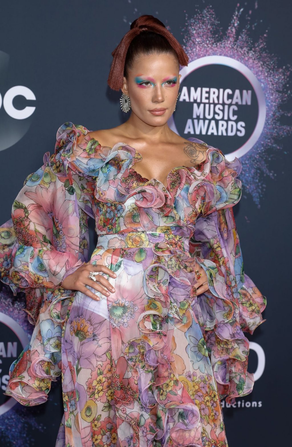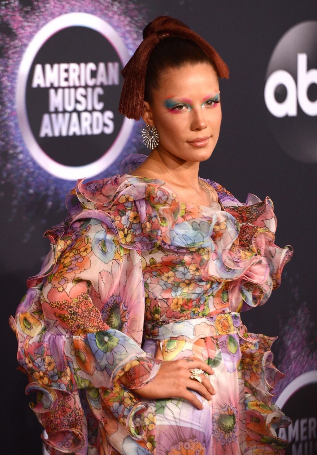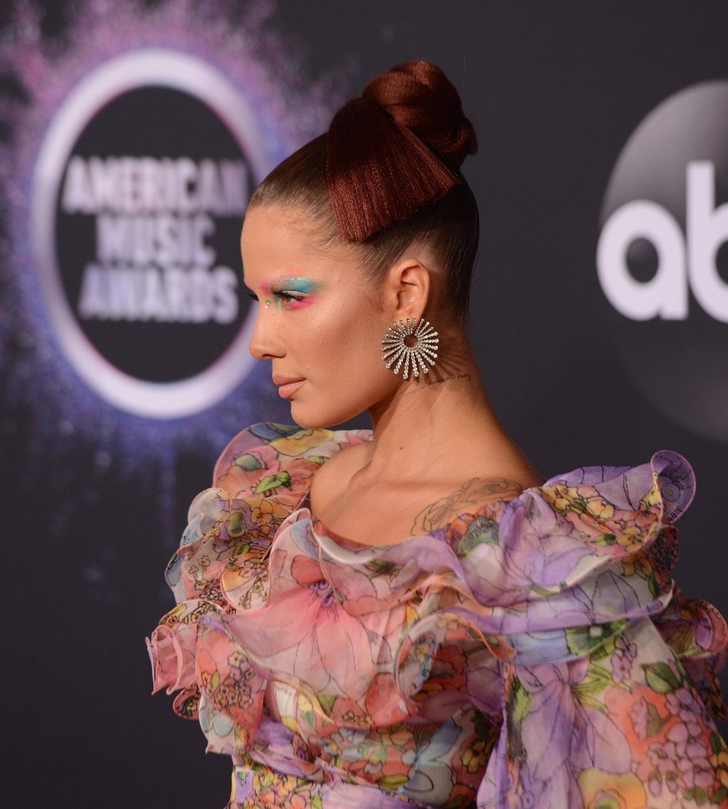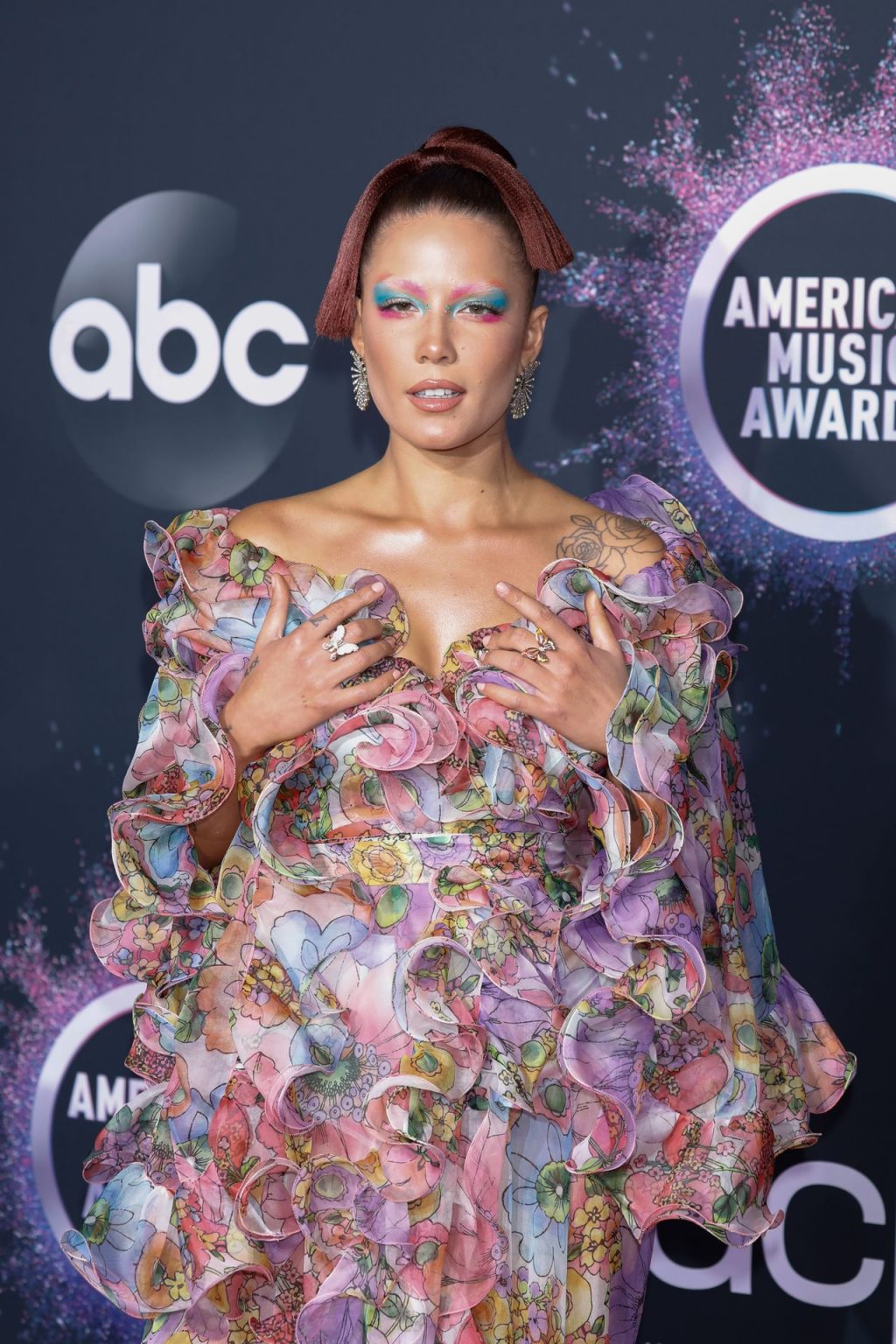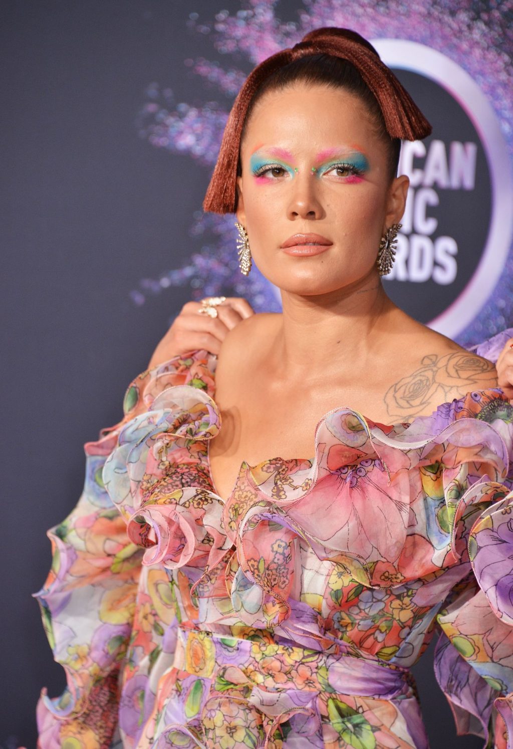 Halsey была сфотографирована на церемонии American Music Awards 2019, которая проходила в Microsoft Theater в Лос-Анджелесе, 24.11.2019. Она была самой креативной на мероприятии. Певица появилась с прической самурая, без бровей, с сине-розовыми тенями и стразами в внутренних уголках глаз.
