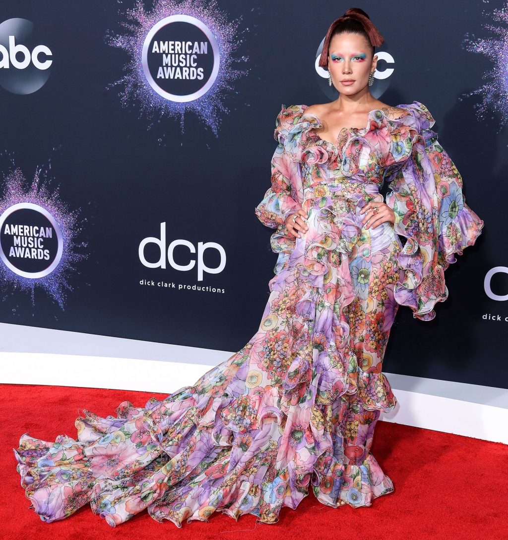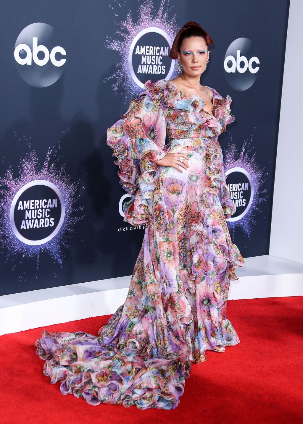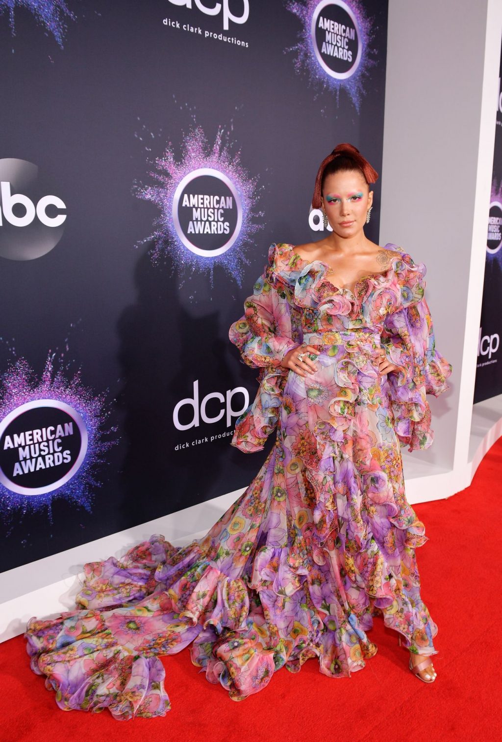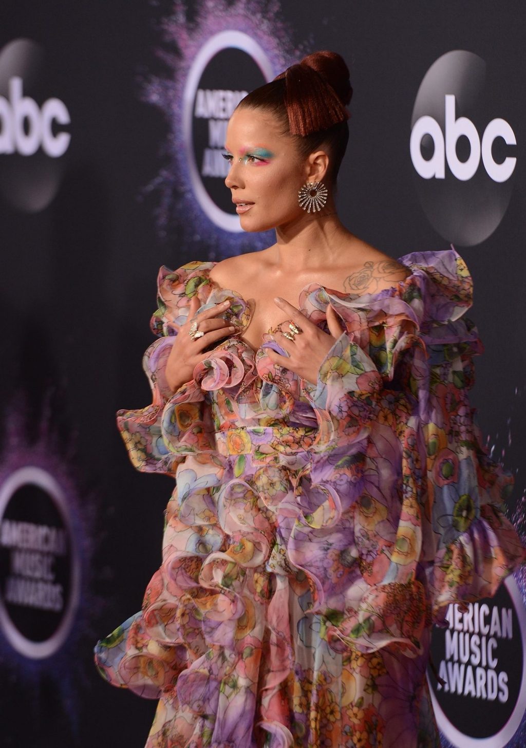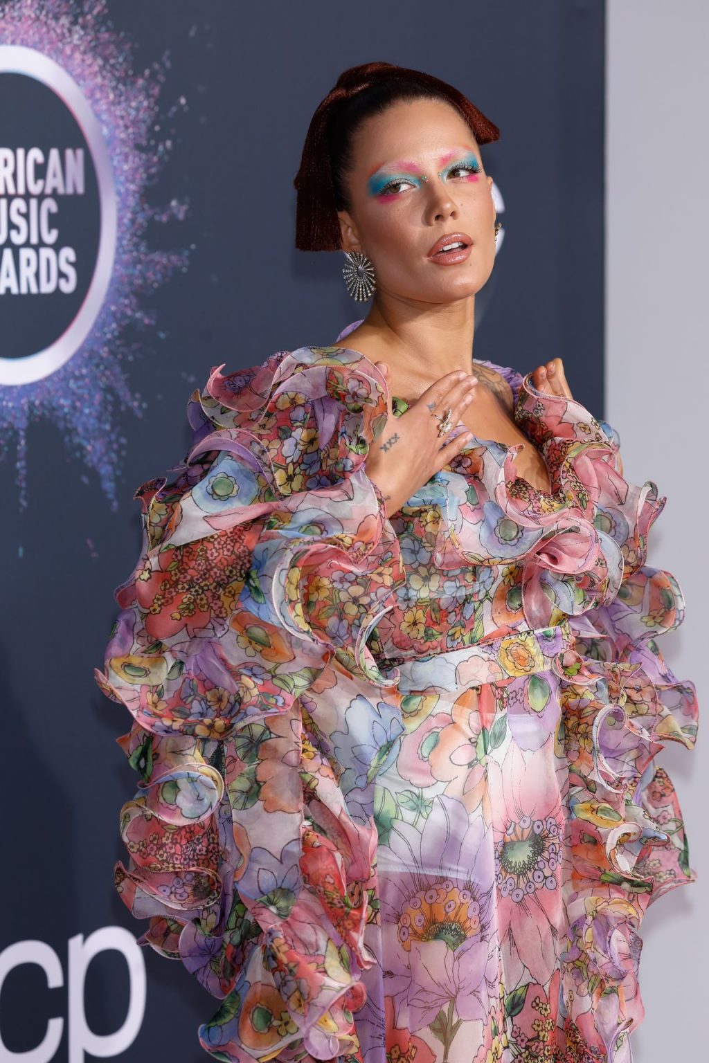 Halsey была сфотографирована на церемонии American Music Awards 2019, которая проходила в Microsoft Theater в Лос-Анджелесе, 24.11.2019. Она была самой креативной на мероприятии. Певица появилась с прической самурая, без бровей, с сине-розовыми тенями и стразами в внутренних уголках глаз.