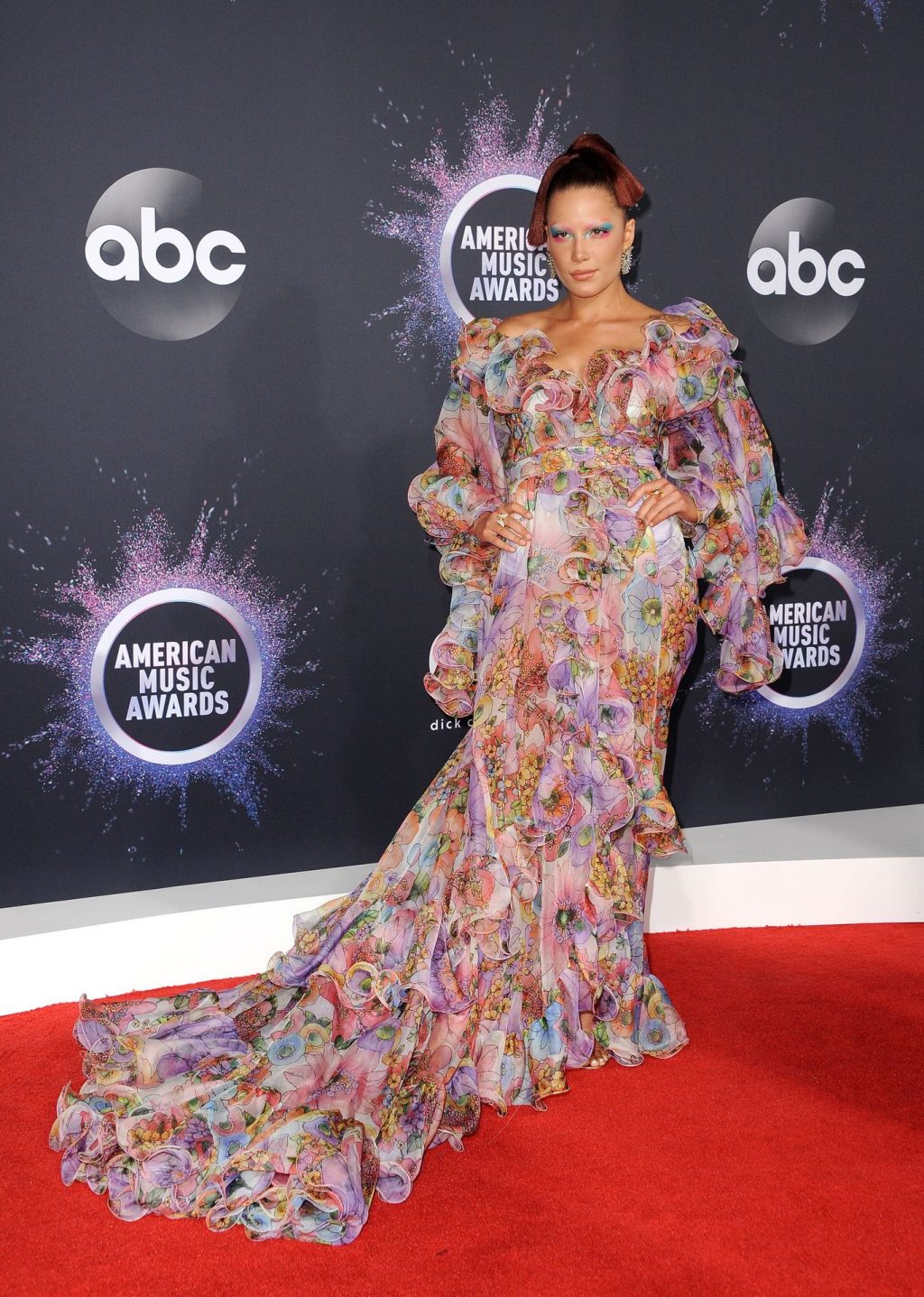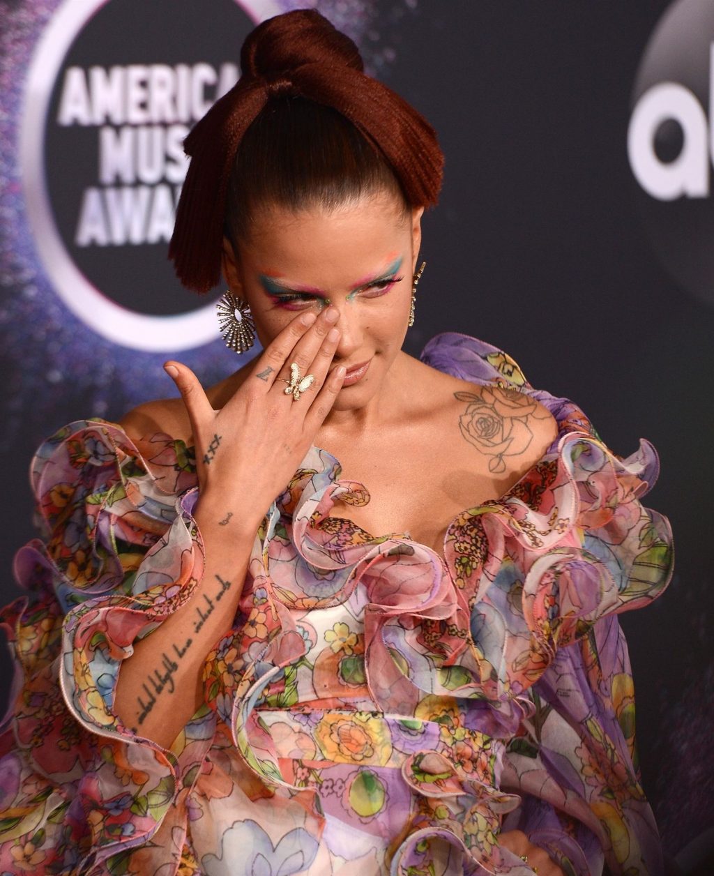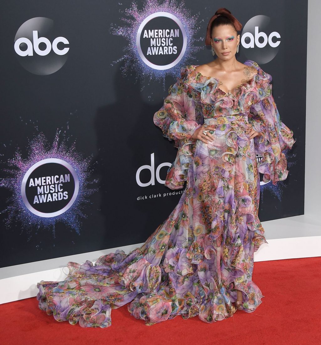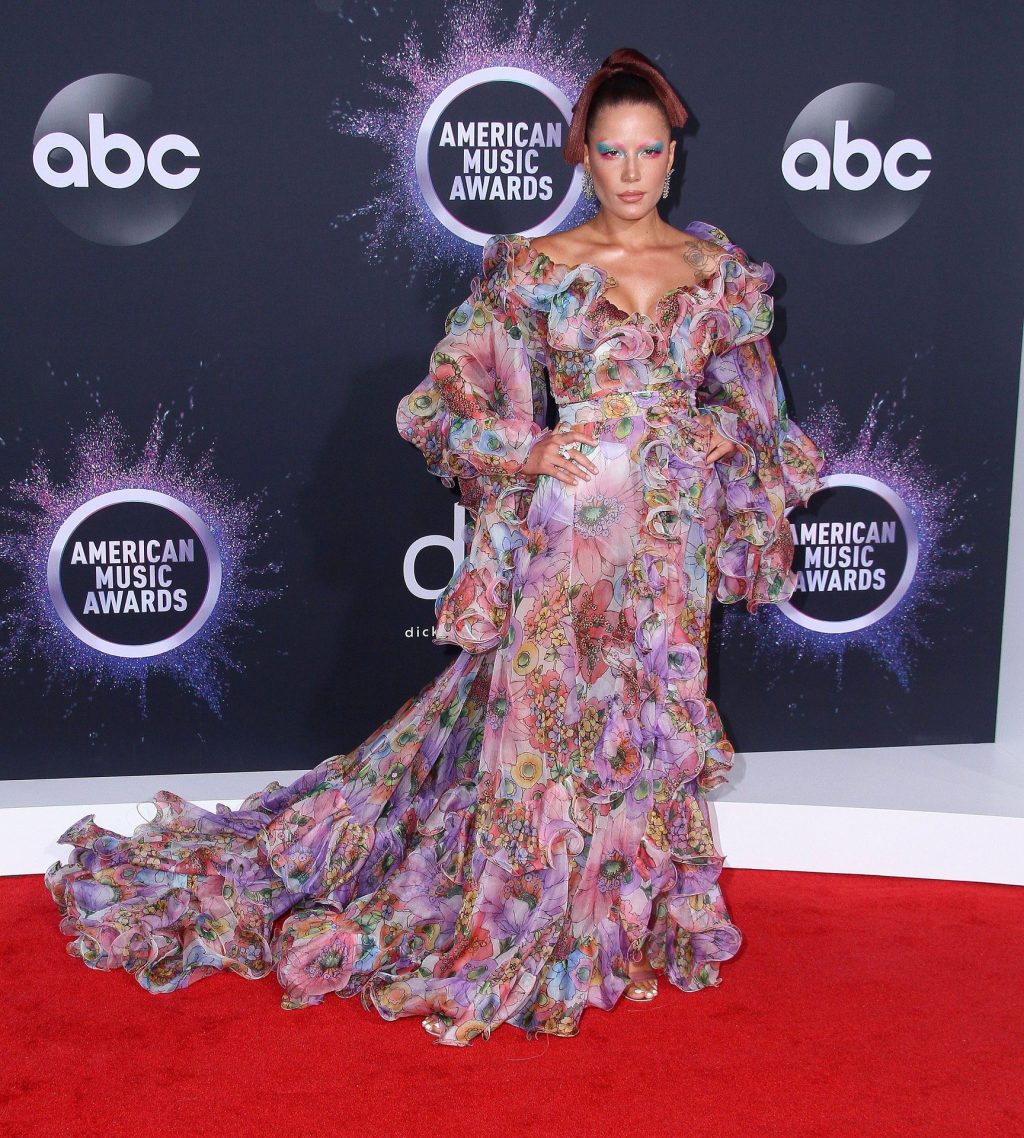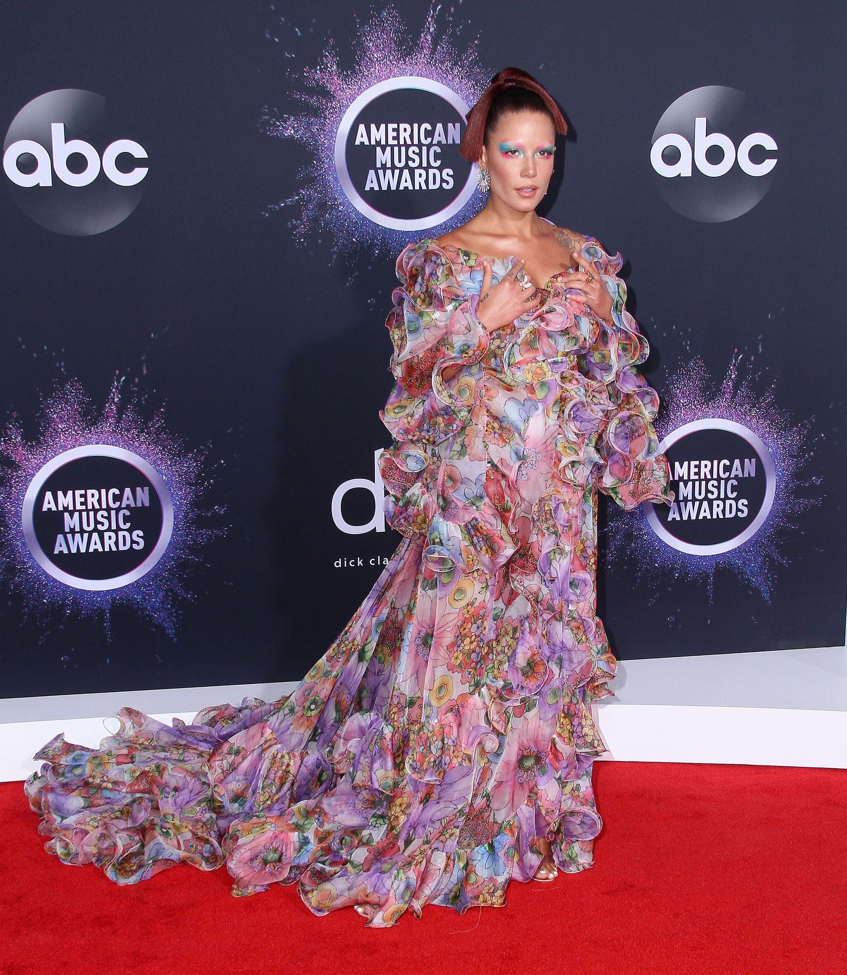 Halsey была сфотографирована на церемонии American Music Awards 2019, которая проходила в Microsoft Theater в Лос-Анджелесе, 24.11.2019. Она была самой креативной на мероприятии. Певица появилась с прической самурая, без бровей, с сине-розовыми тенями и стразами в внутренних уголках глаз.