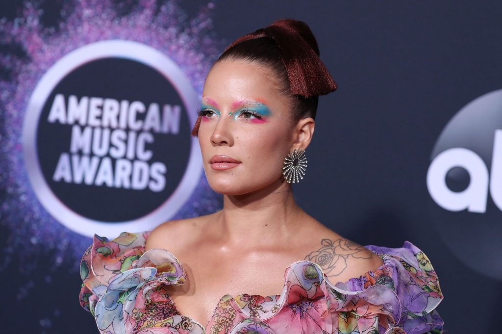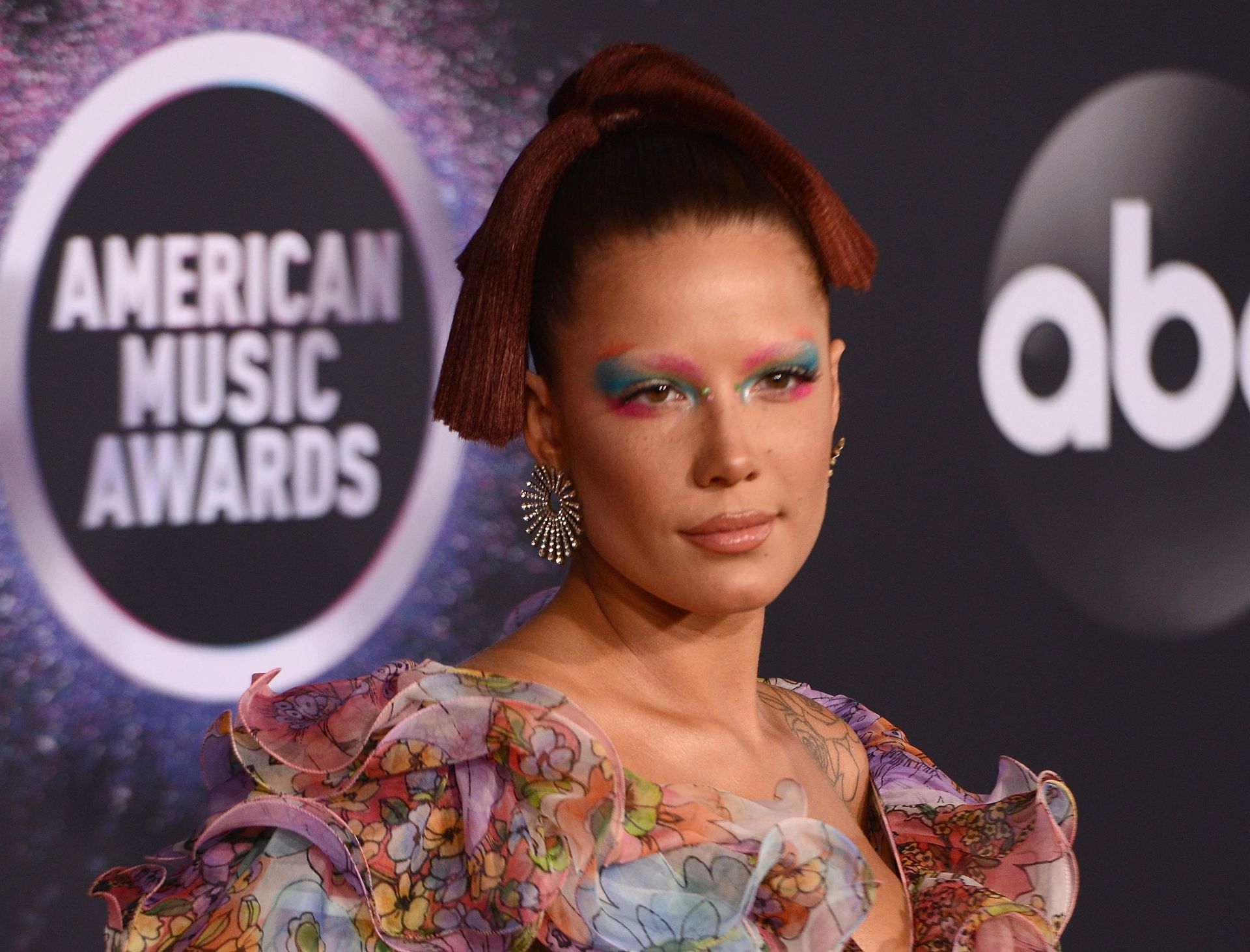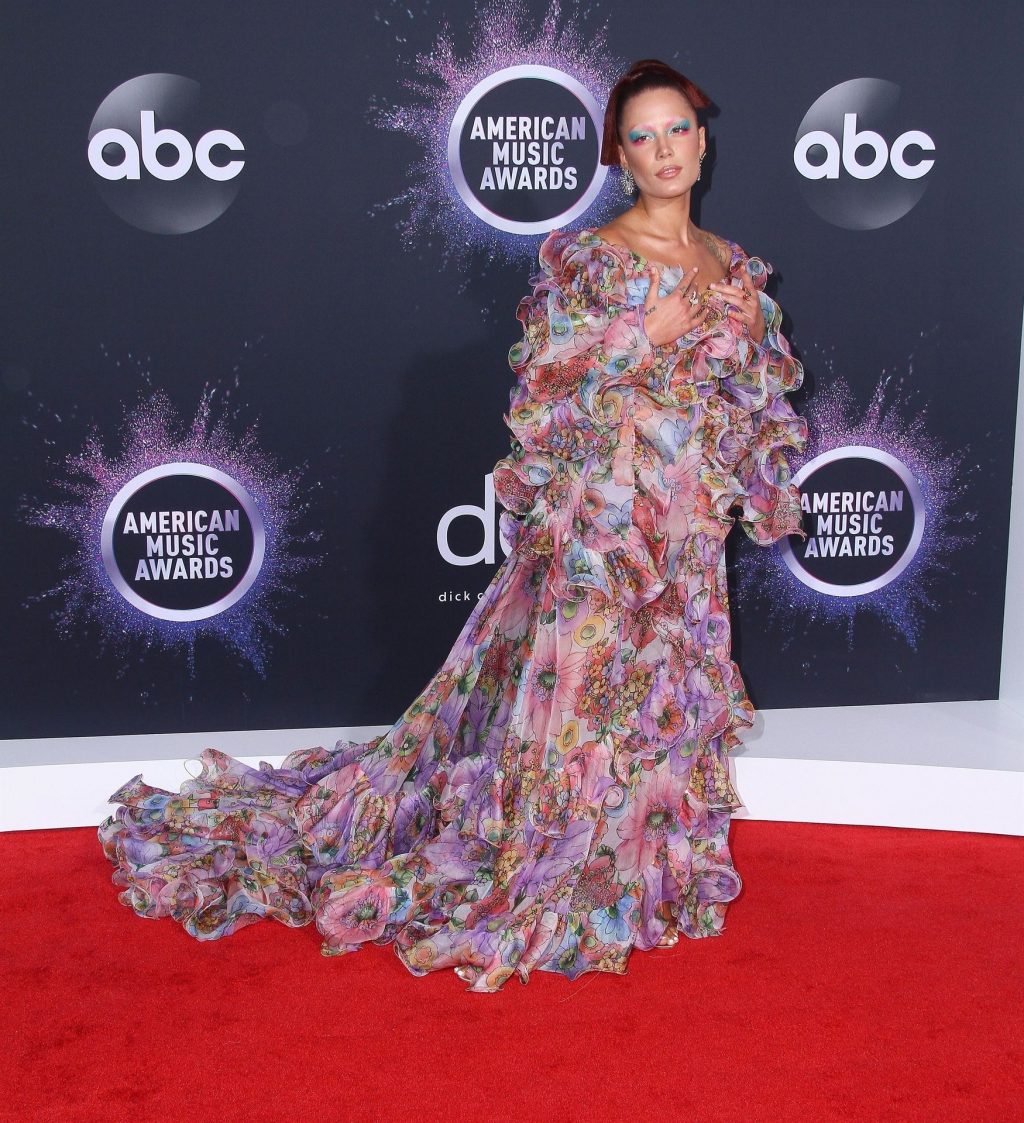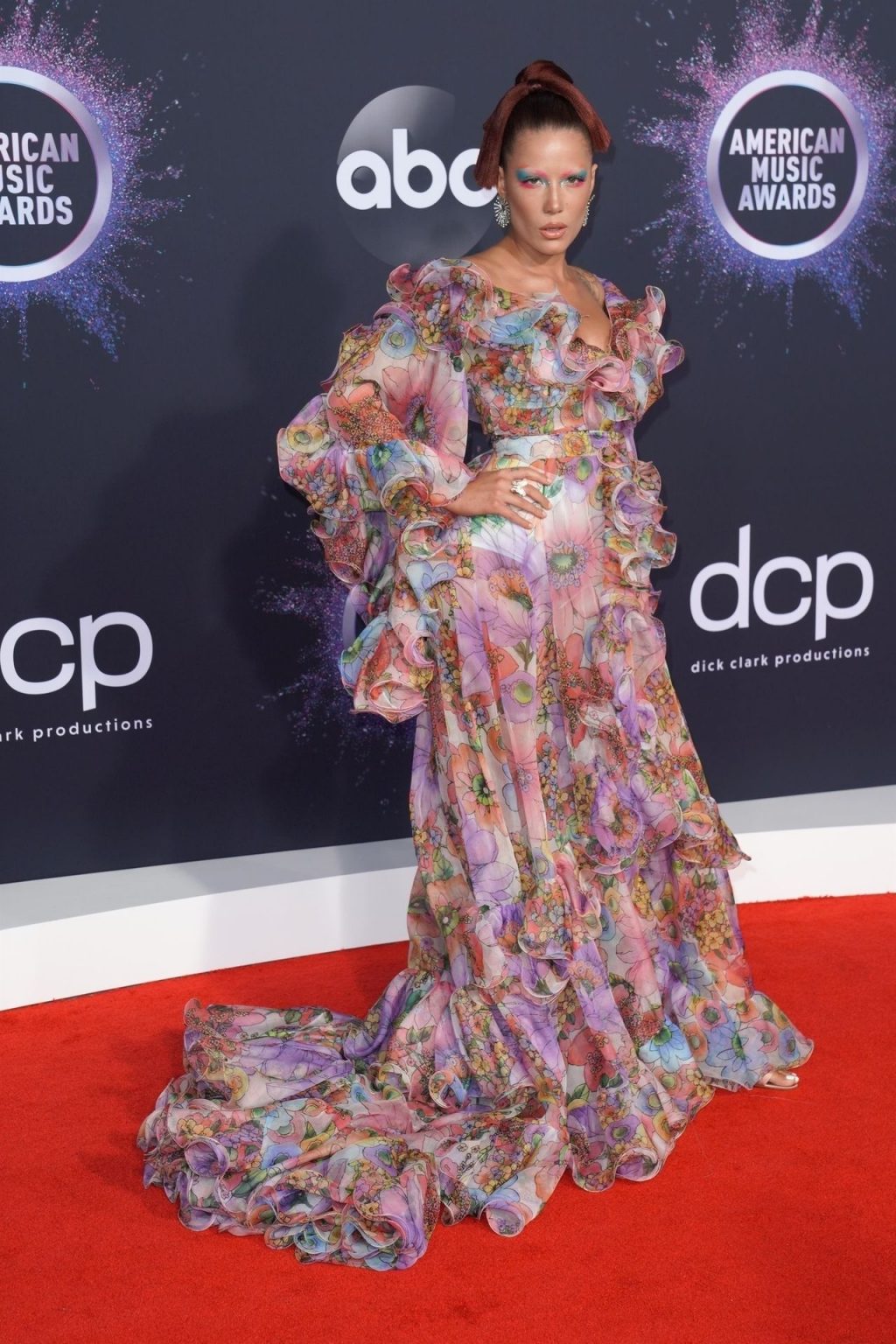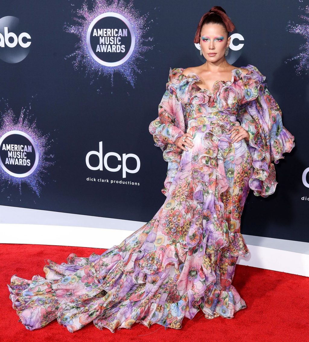 Halsey была сфотографирована на церемонии American Music Awards 2019, которая проходила в Microsoft Theater в Лос-Анджелесе, 24.11.2019. Она была самой креативной на мероприятии. Певица появилась с прической самурая, без бровей, с сине-розовыми тенями и стразами в внутренних уголках глаз.