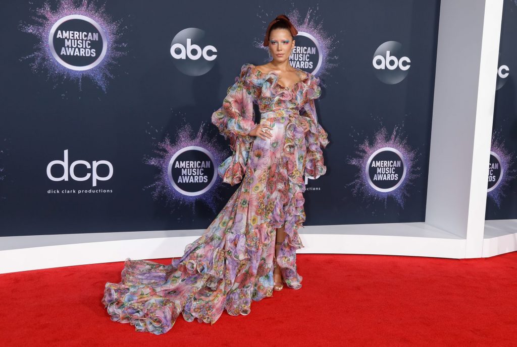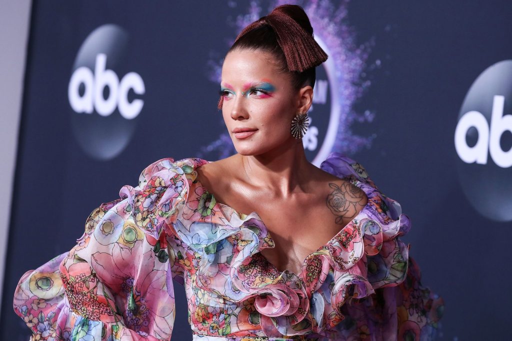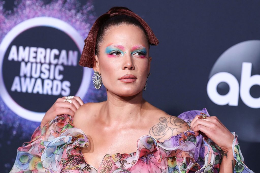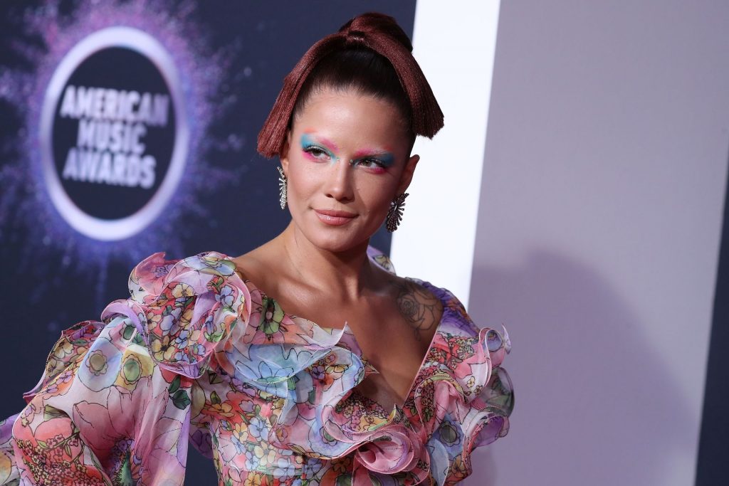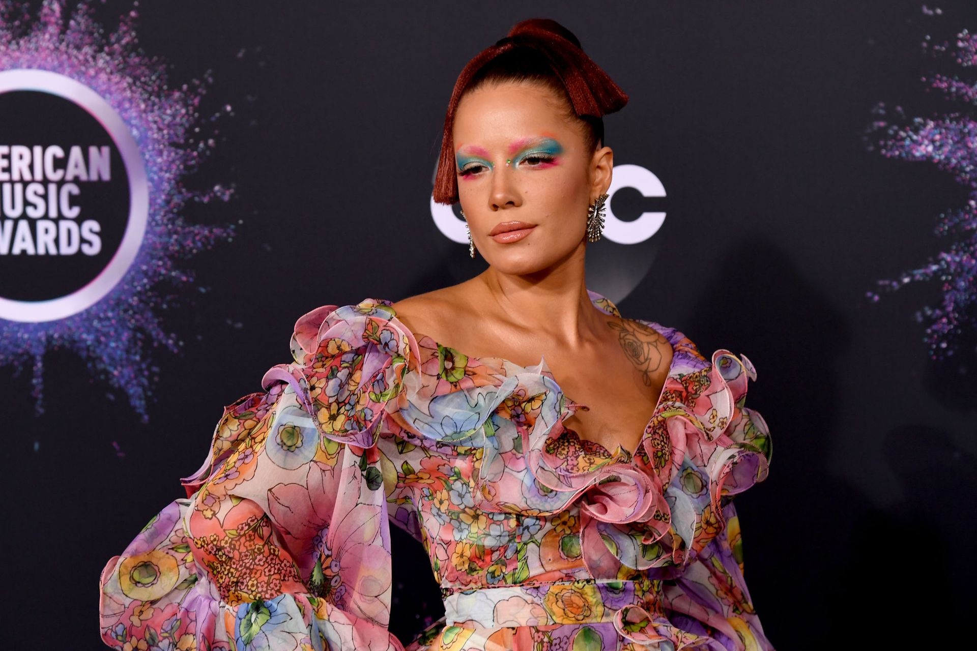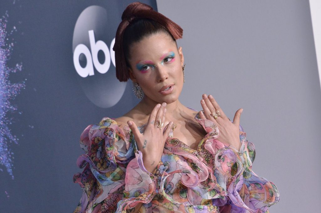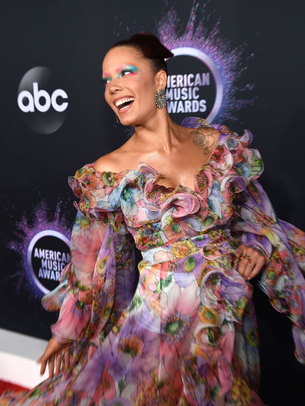 Halsey была сфотографирована на церемонии American Music Awards 2019, которая проходила в Microsoft Theater в Лос-Анджелесе, 24.11.2019. Она была самой креативной на мероприятии. Певица появилась с прической самурая, без бровей, с сине-розовыми тенями и стразами в внутренних уголках глаз.