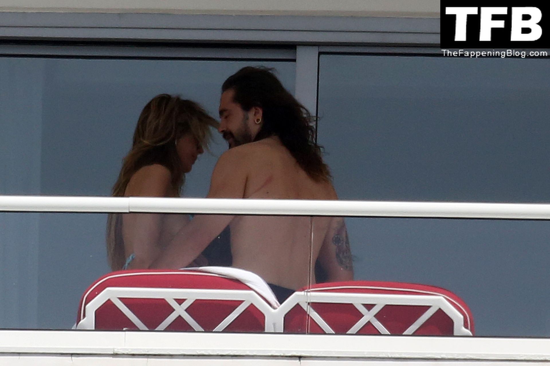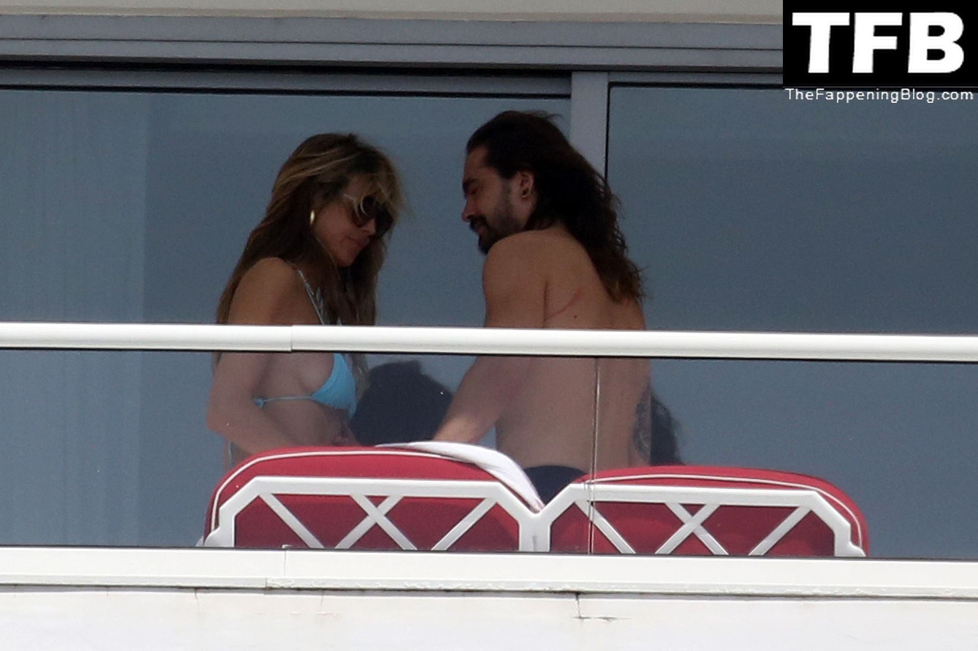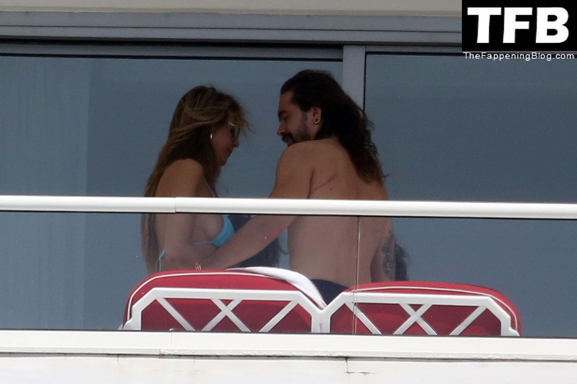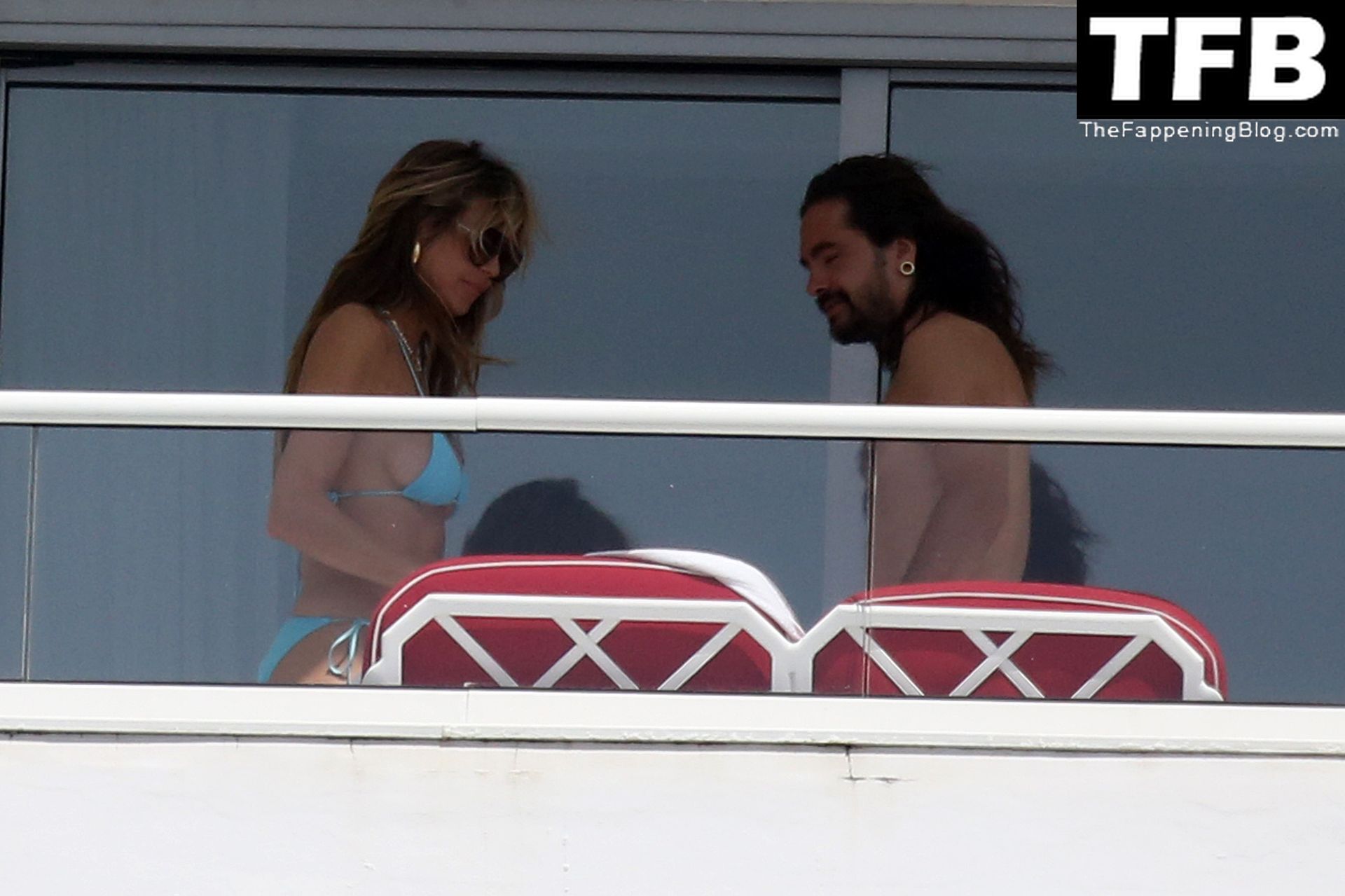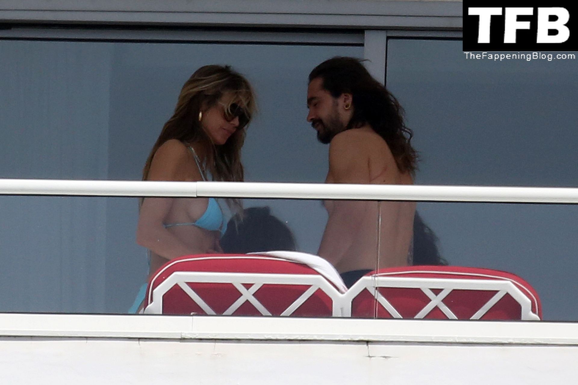 Хайди Клум и её муж Том Каулитц романтично прогуливаются по пляжу, прежде чем модель переодевается в синий стринг-бикини, чтобы отдохнуть на их балконе в Майами, 19.07.2022.