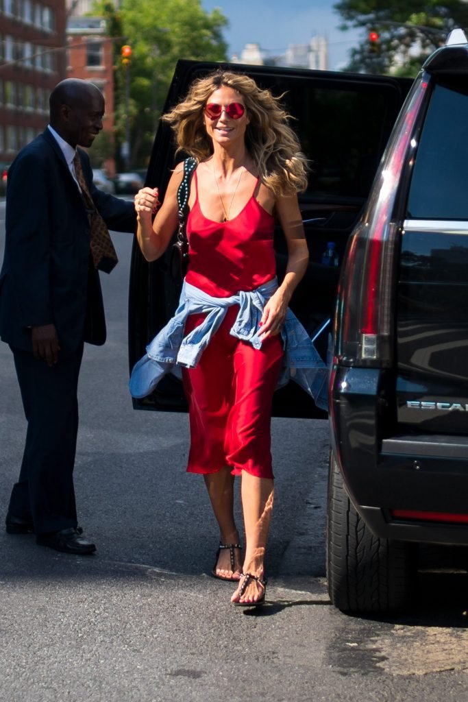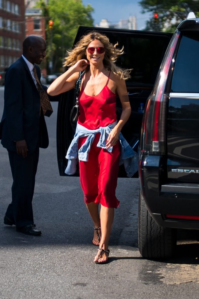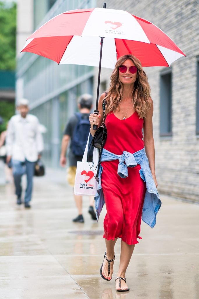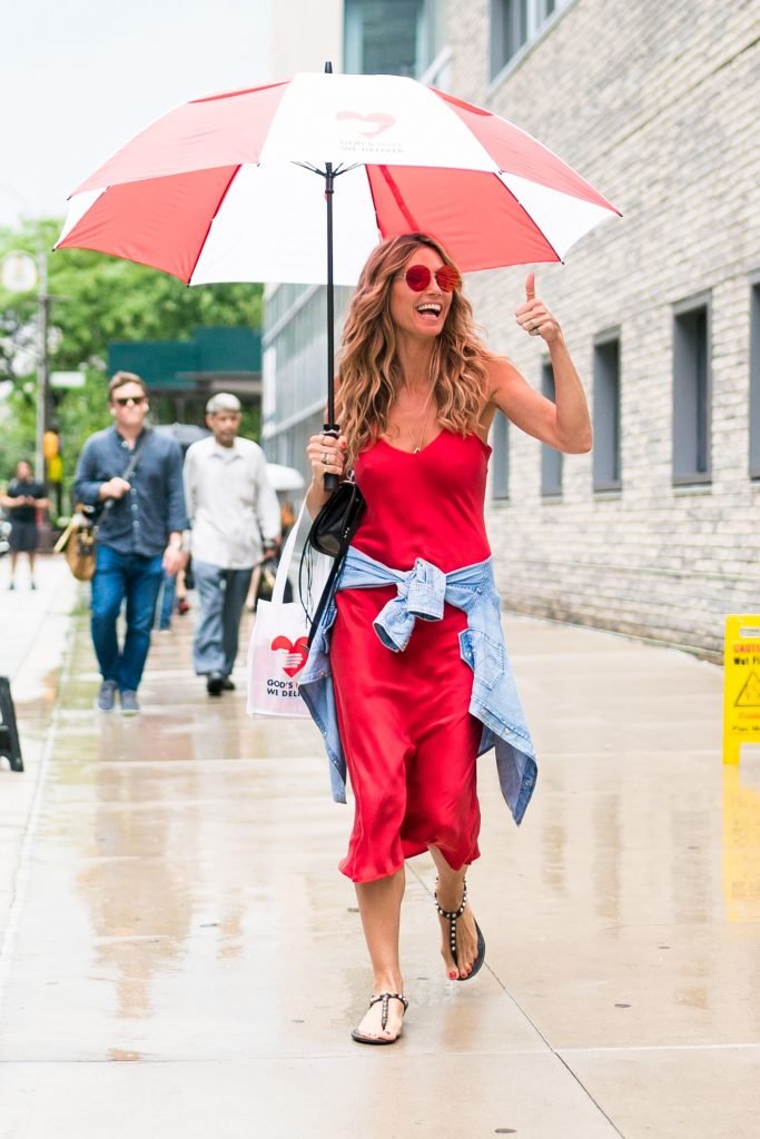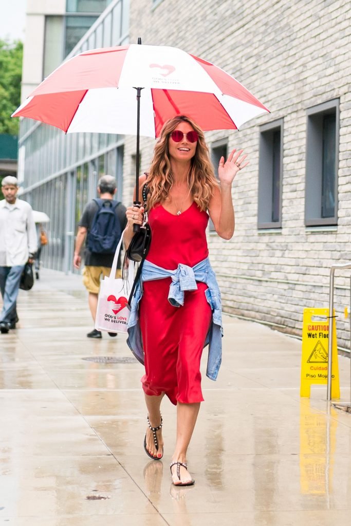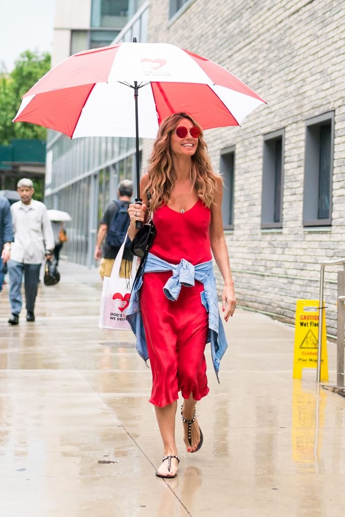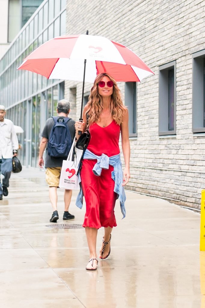 Безбюстгальтерная Хайди Клум (45) была замечена в красном платье под дождём во время визита в организацию Gods Love We Deliver в Нью-Йорке, 20.06.2018.