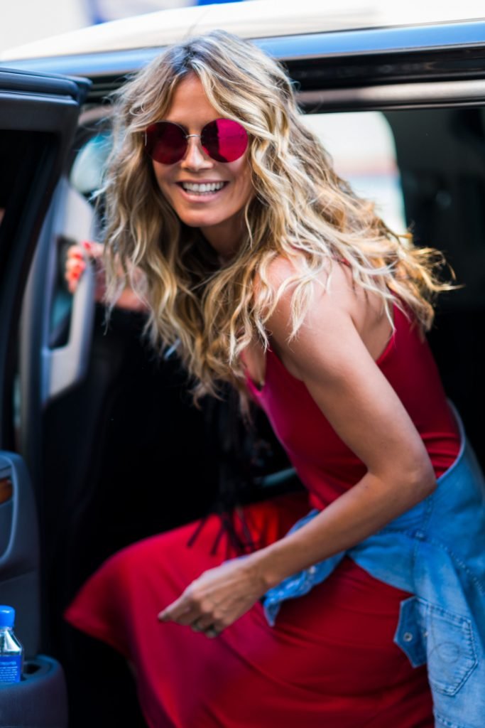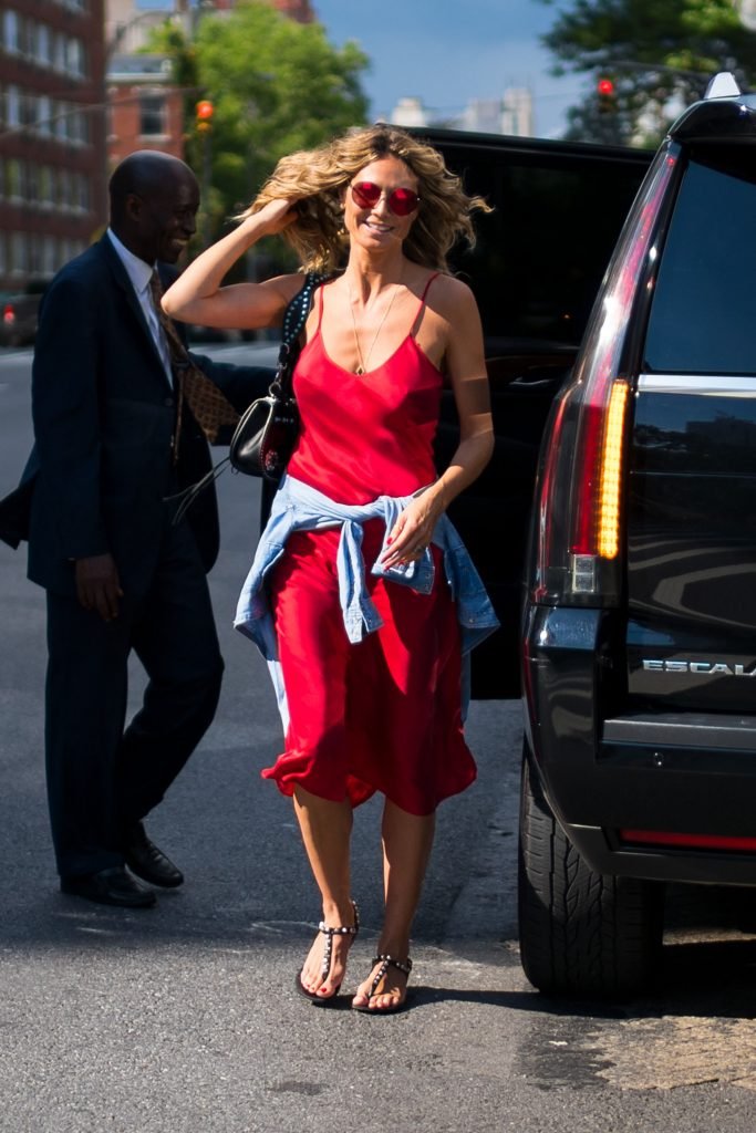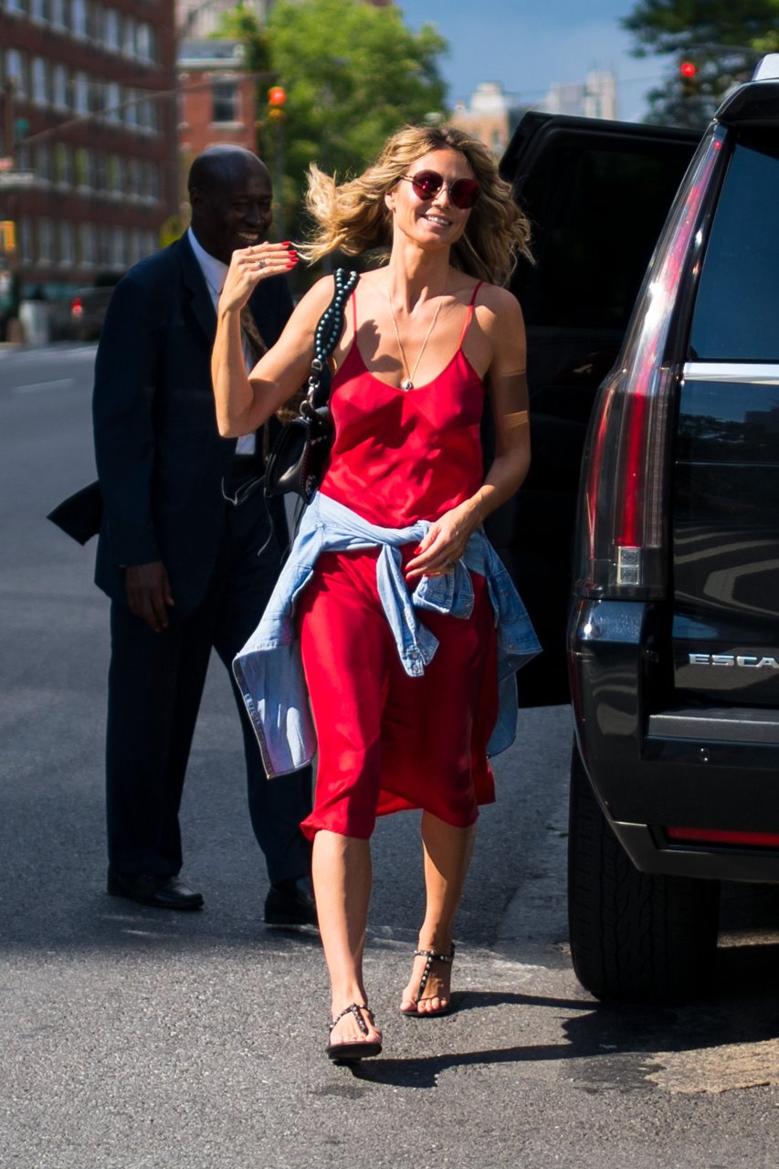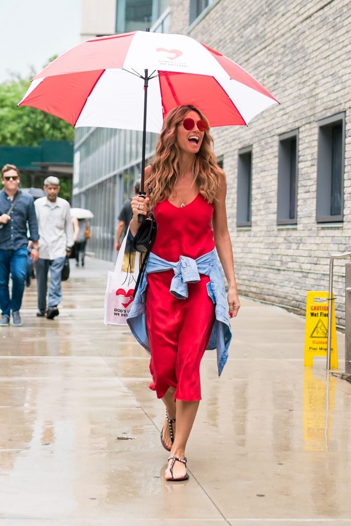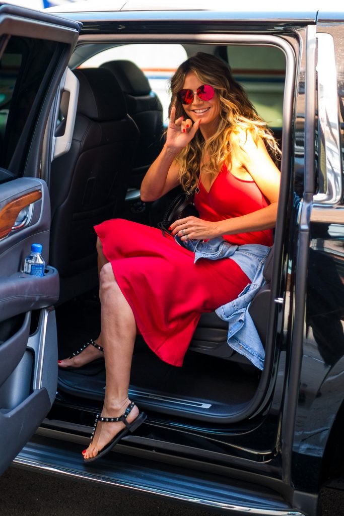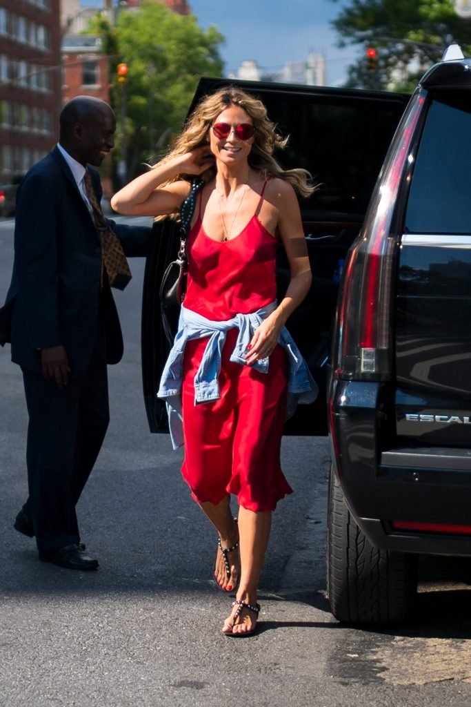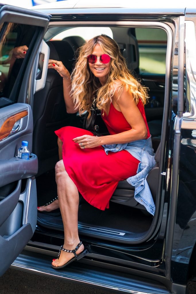 Безбюстгальтерная Хайди Клум (45) была замечена в красном платье под дождём во время визита в организацию Gods Love We Deliver в Нью-Йорке, 20.06.2018.