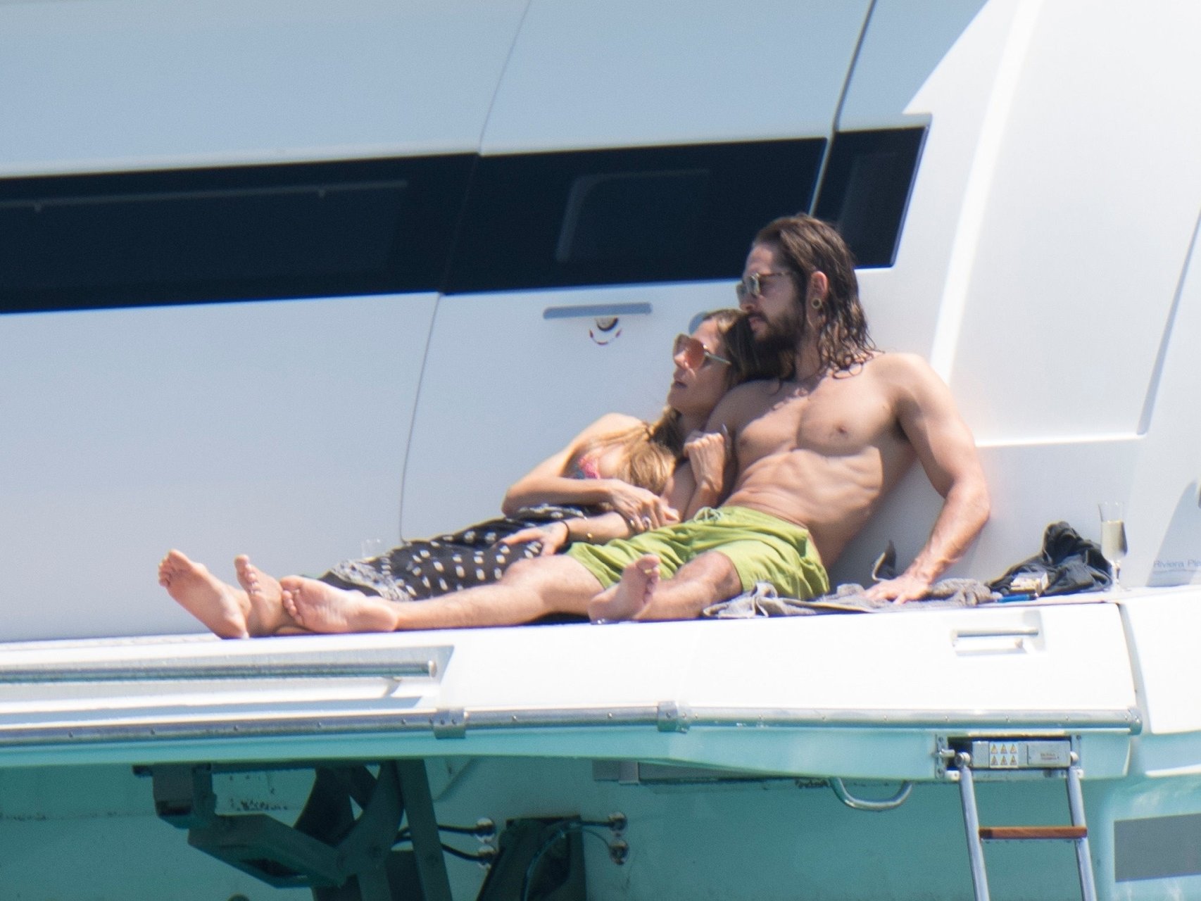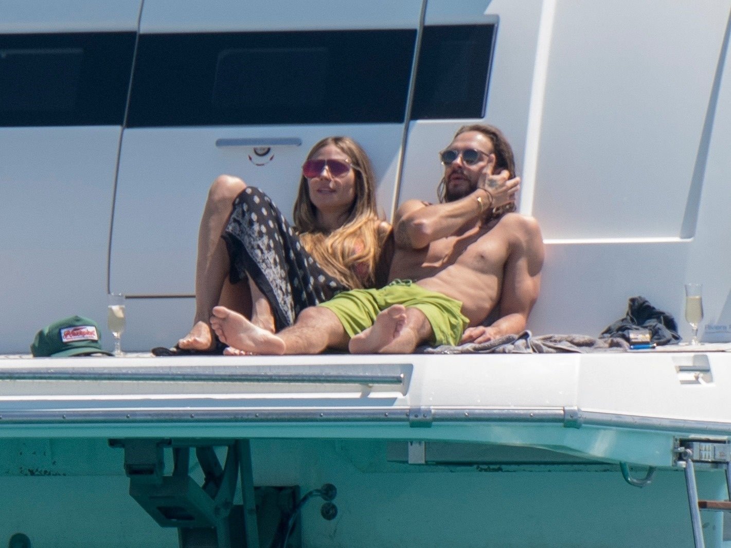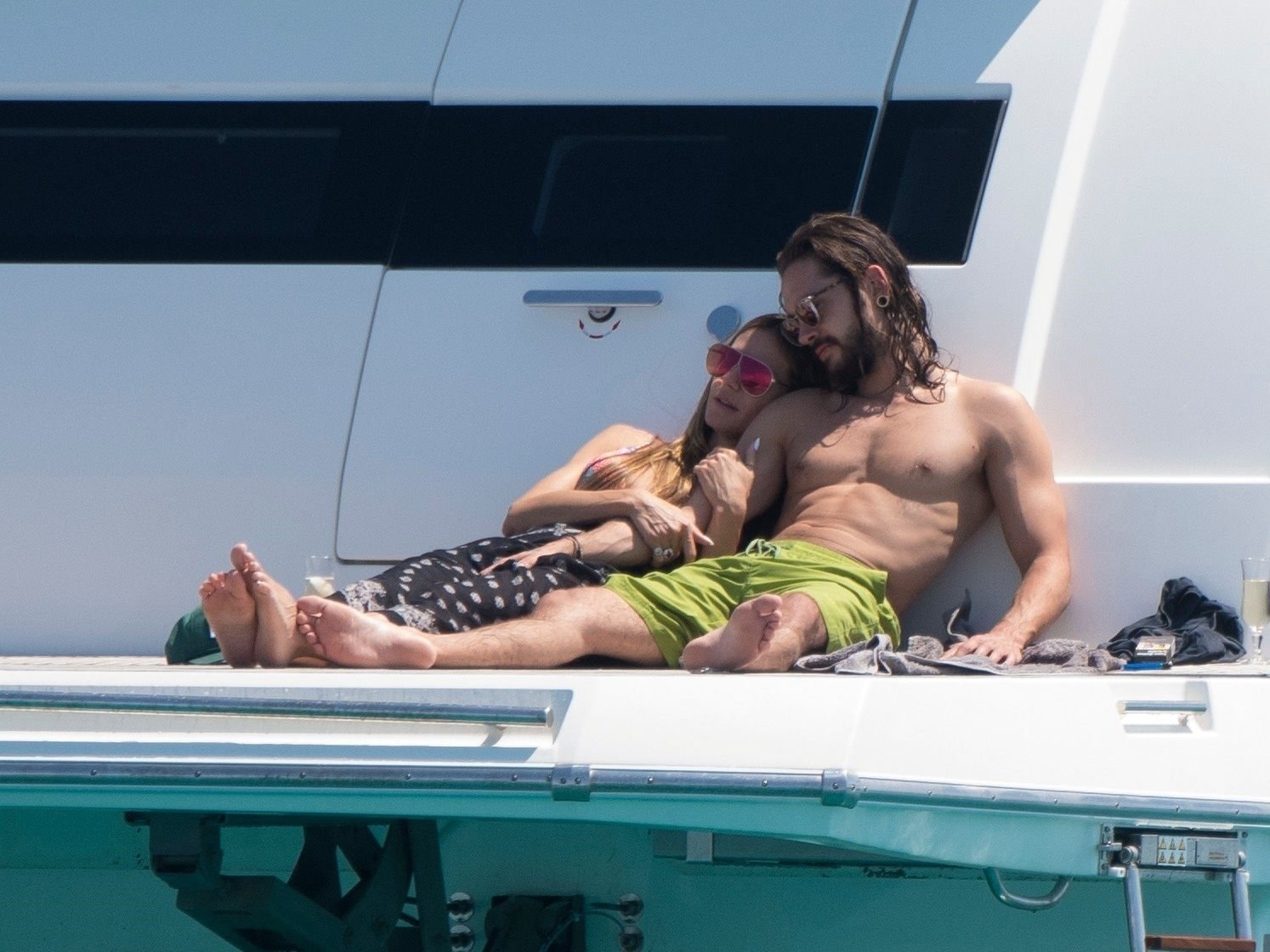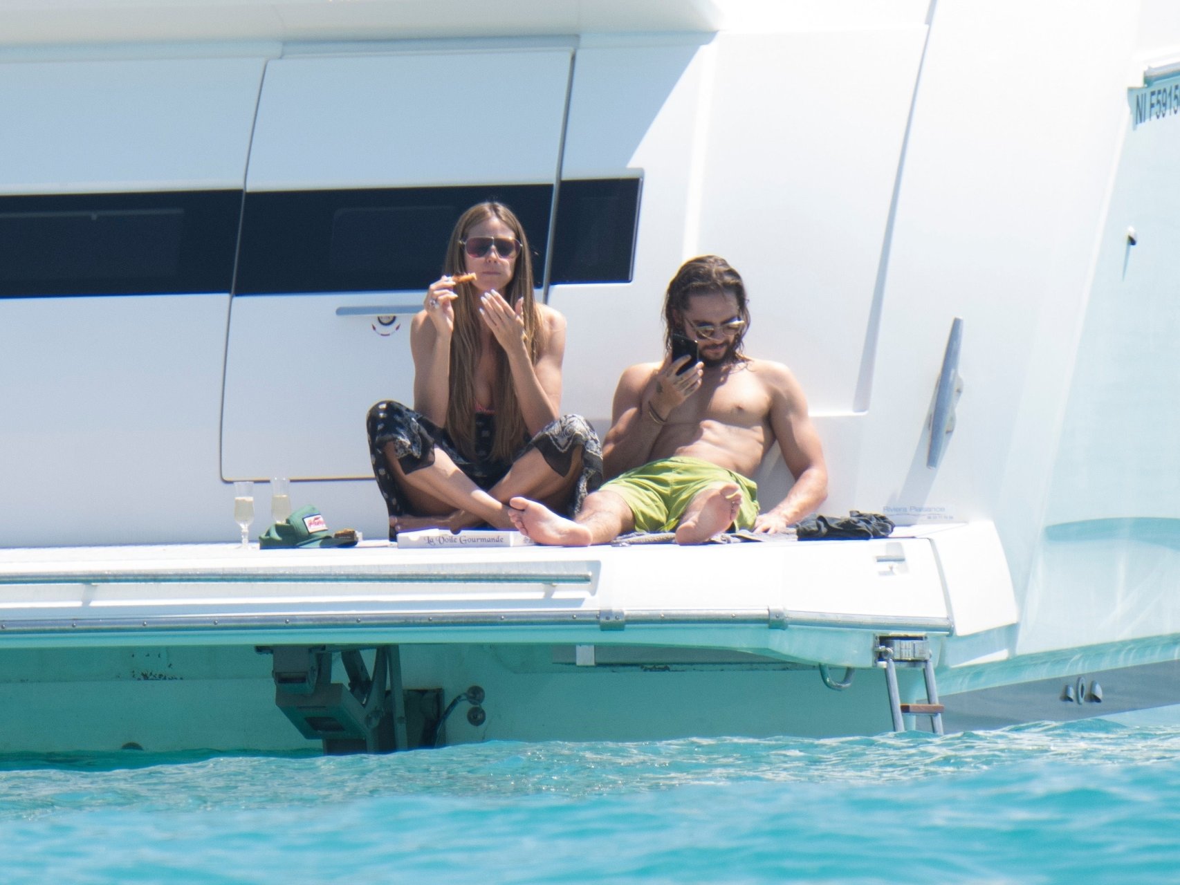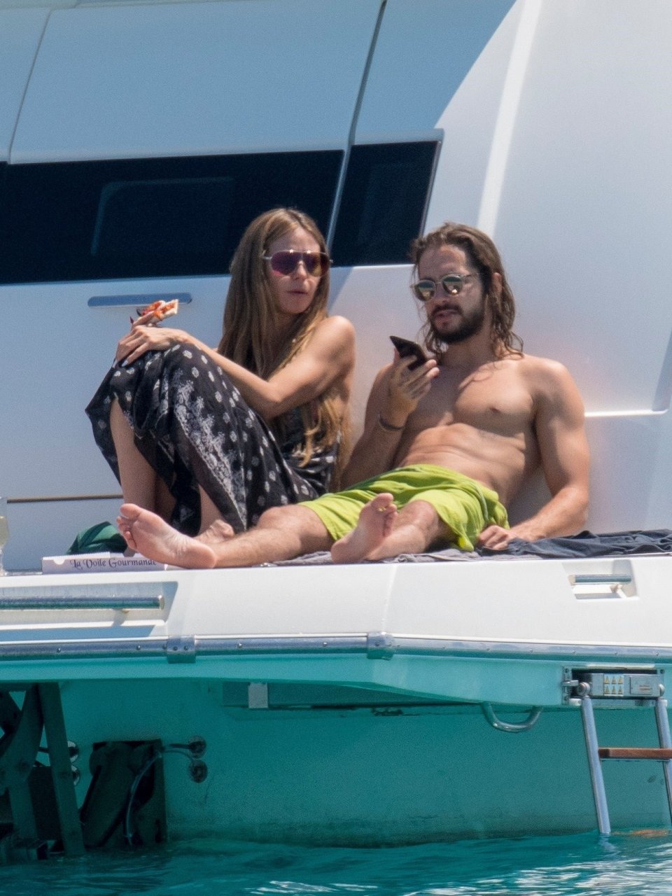 Немецкая супермодель и телеведущая Хайди Клум, 44 года, и её новый парень Том Каулитц заказывают пиццу на лодке в Каннах, 19.05.2018. Влюблённая пара целовалась, лежа на солнце.