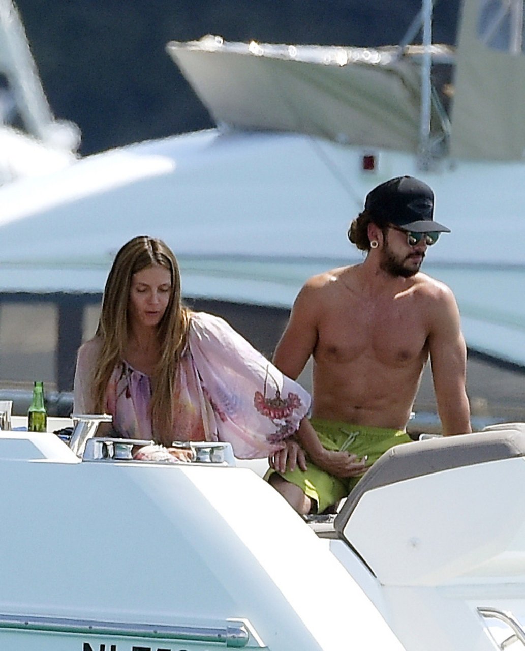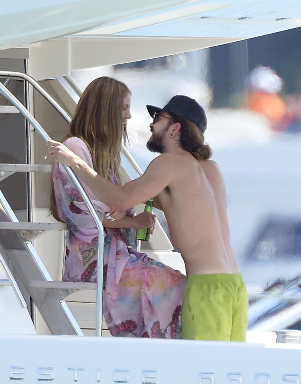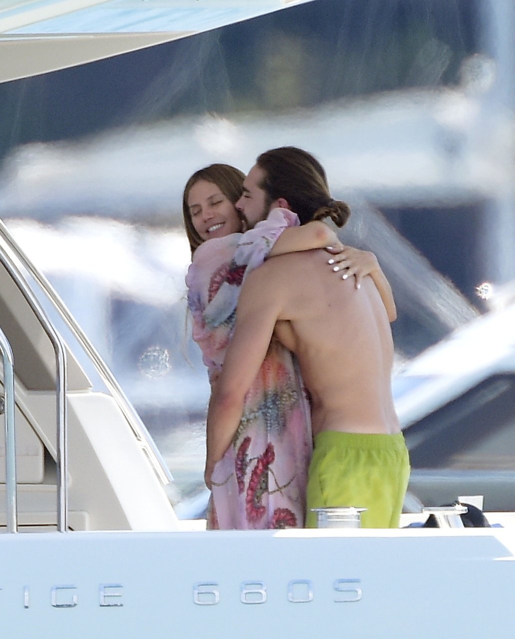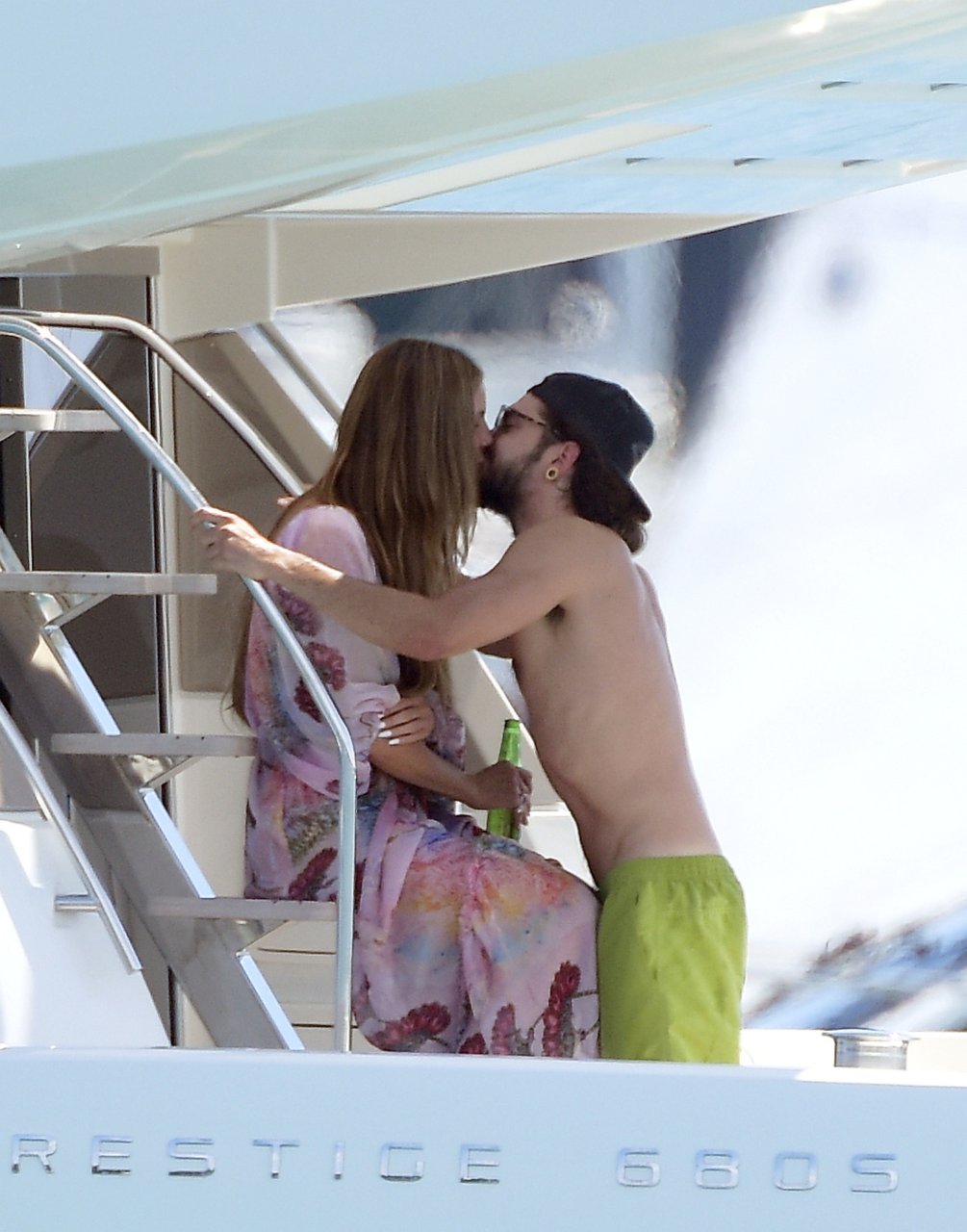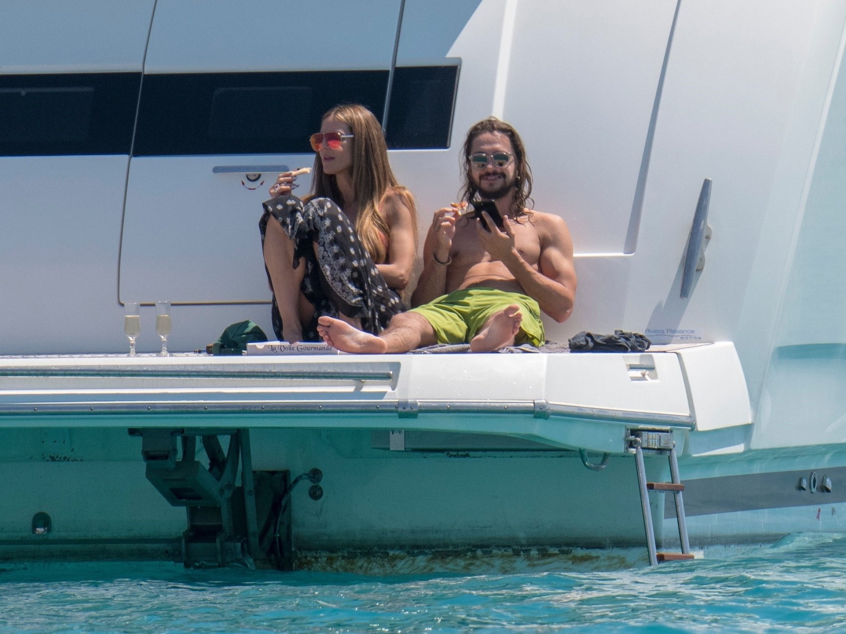 Немецкая супермодель и телеведущая Хайди Клум, 44 года, и её новый парень Том Каулитц заказывают пиццу на лодке в Каннах, 19.05.2018. Влюблённая пара целовалась, лежа на солнце.