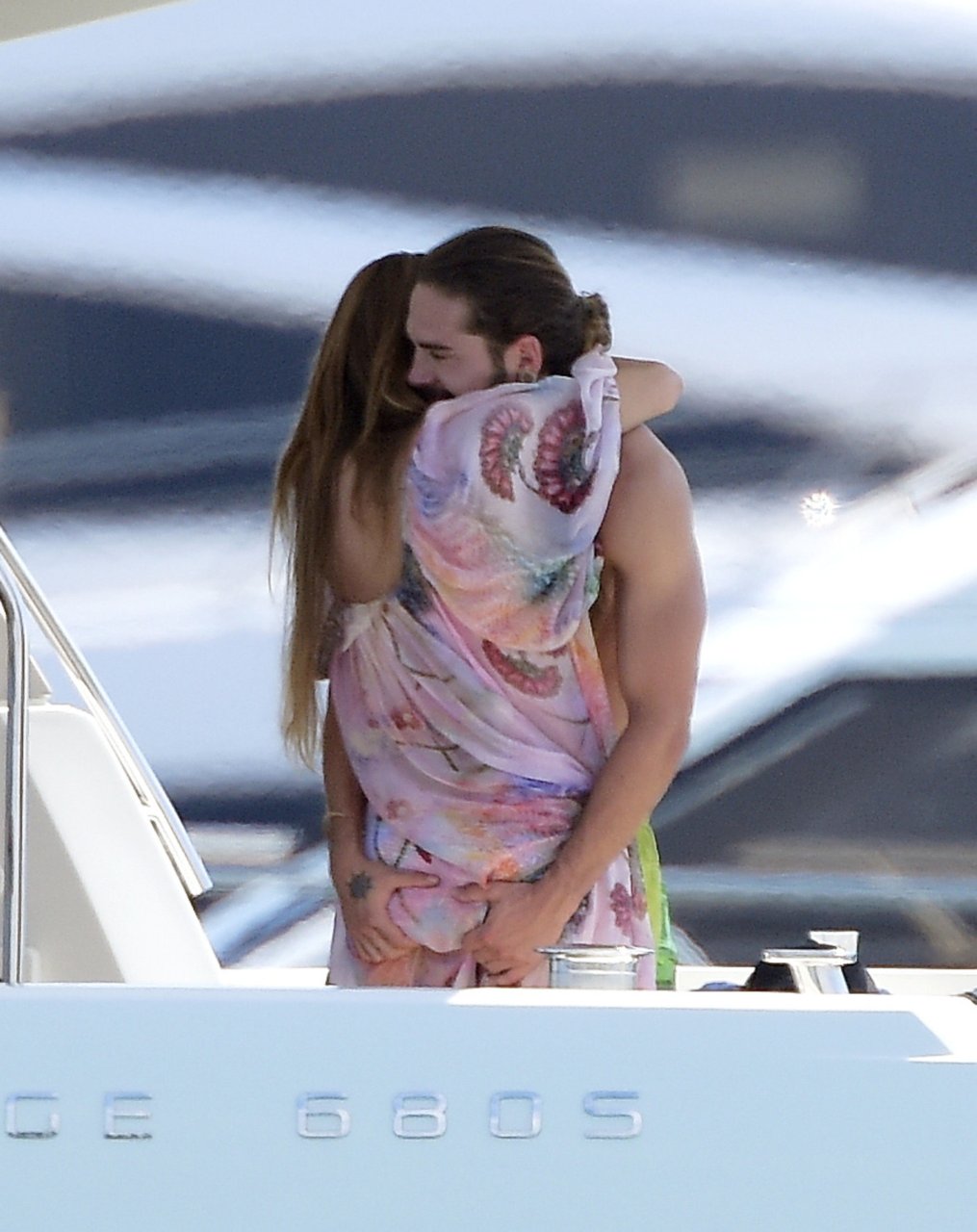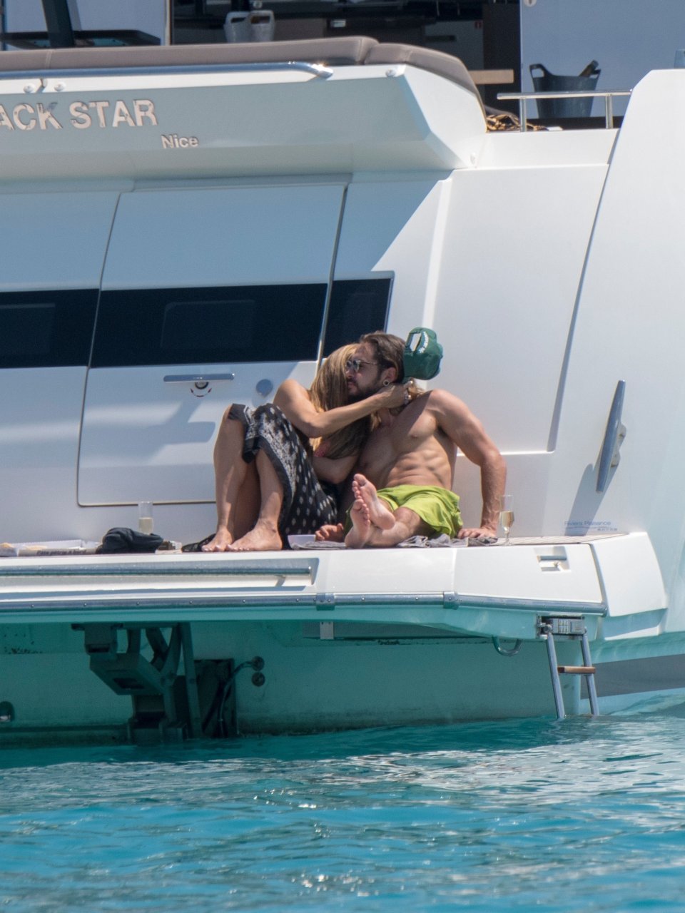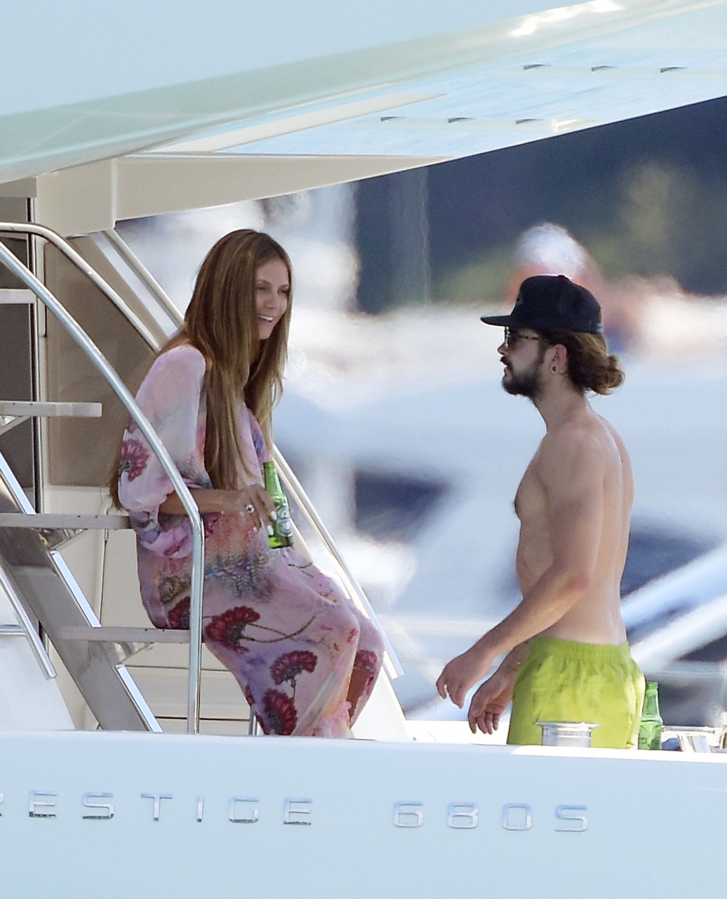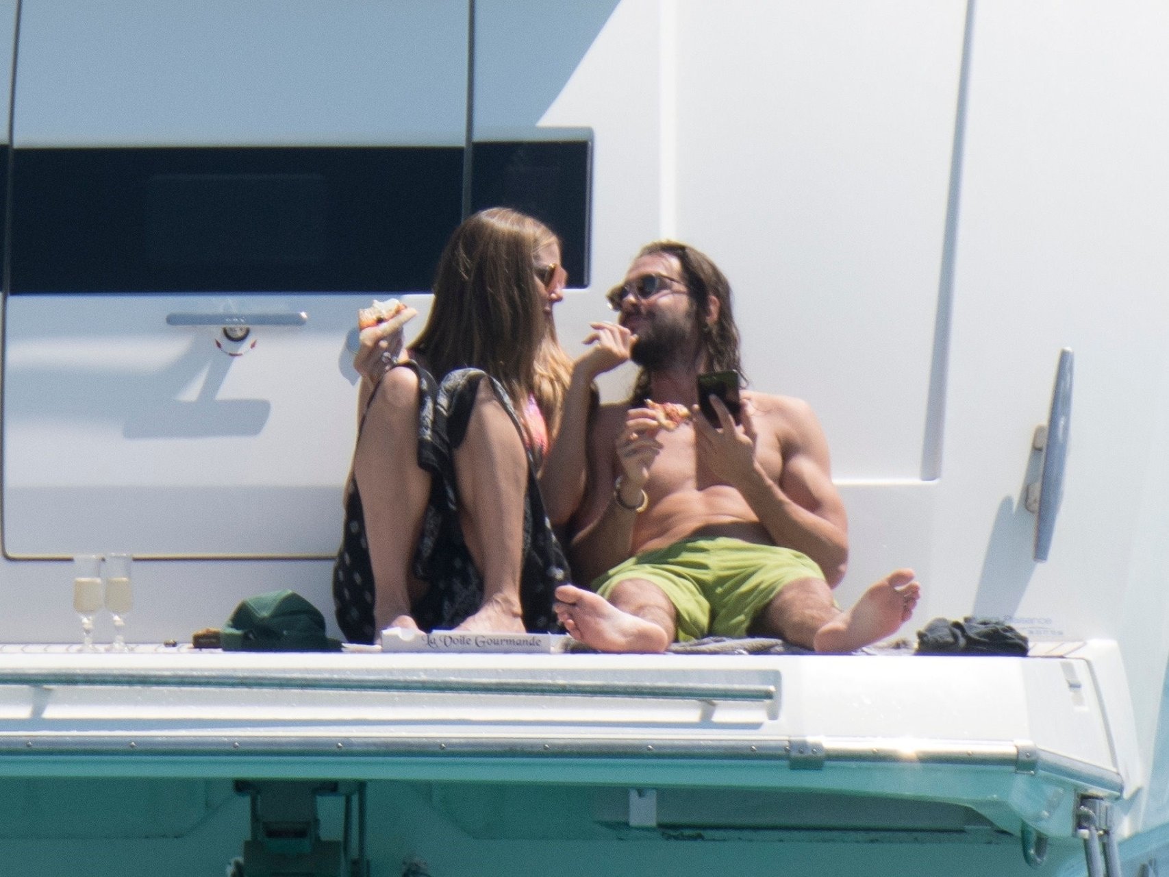 Немецкая супермодель и телеведущая Хайди Клум, 44 года, и её новый парень Том Каулитц заказывают пиццу на лодке в Каннах, 19.05.2018. Влюблённая пара целовалась, лежа на солнце.