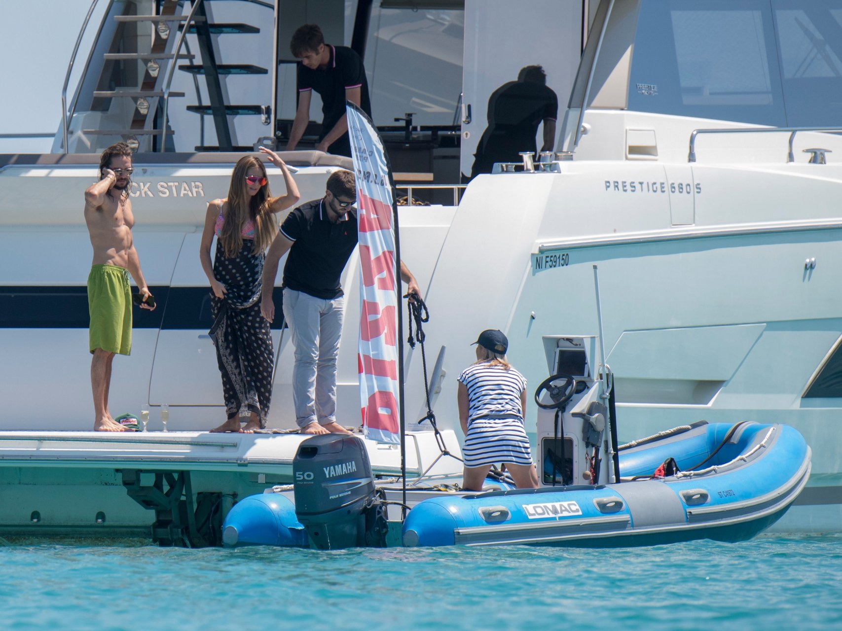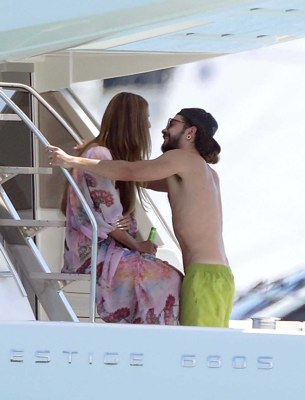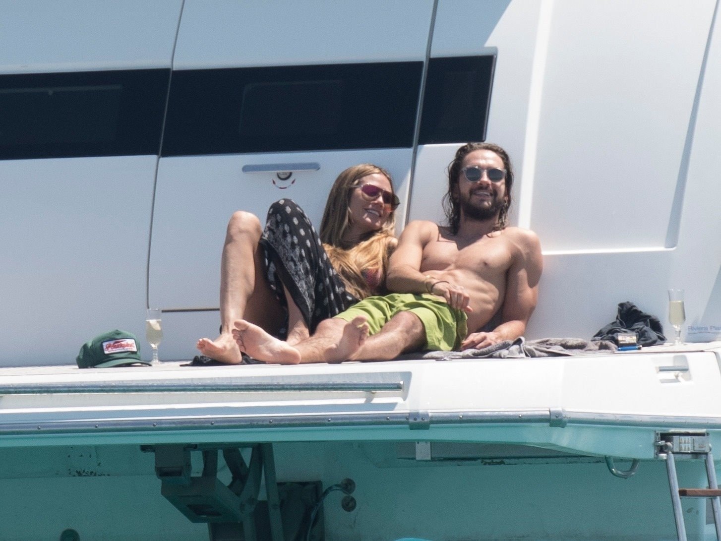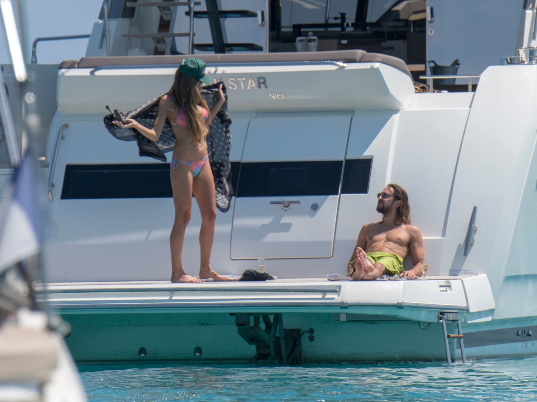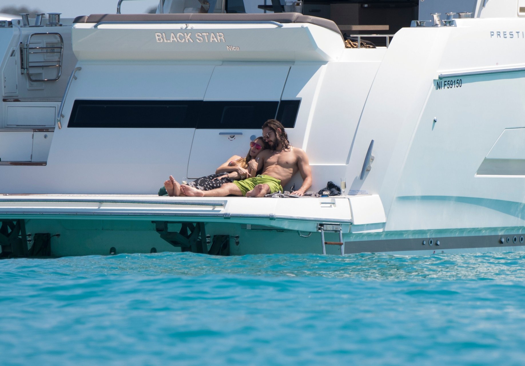Немецкая супермодель и телеведущая Хайди Клум, 44 года, и её новый парень Том Каулитц заказывают пиццу на лодке в Каннах, 19.05.2018. Влюблённая пара целовалась, лежа на солнце.