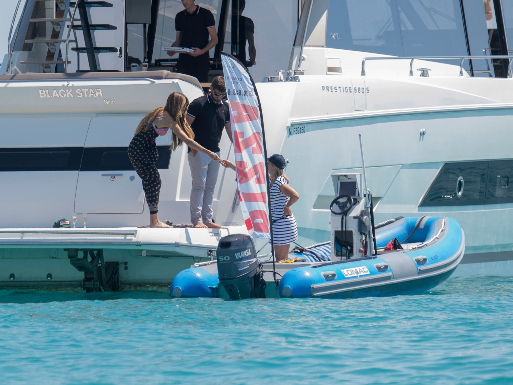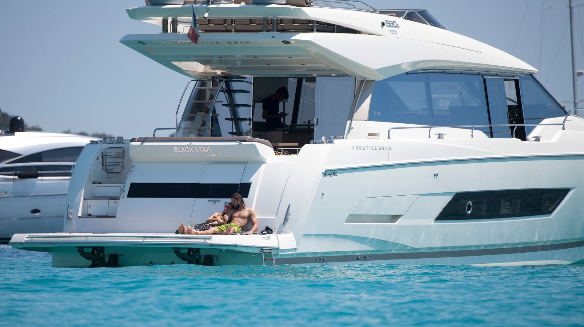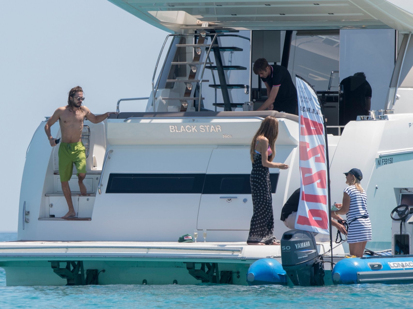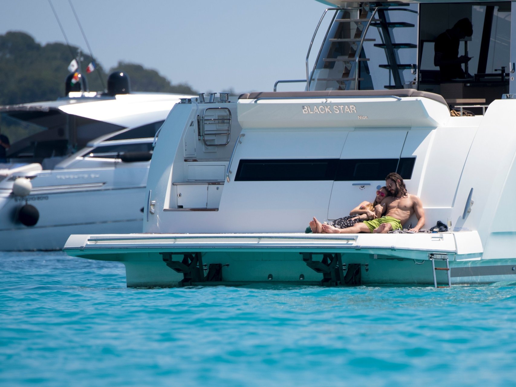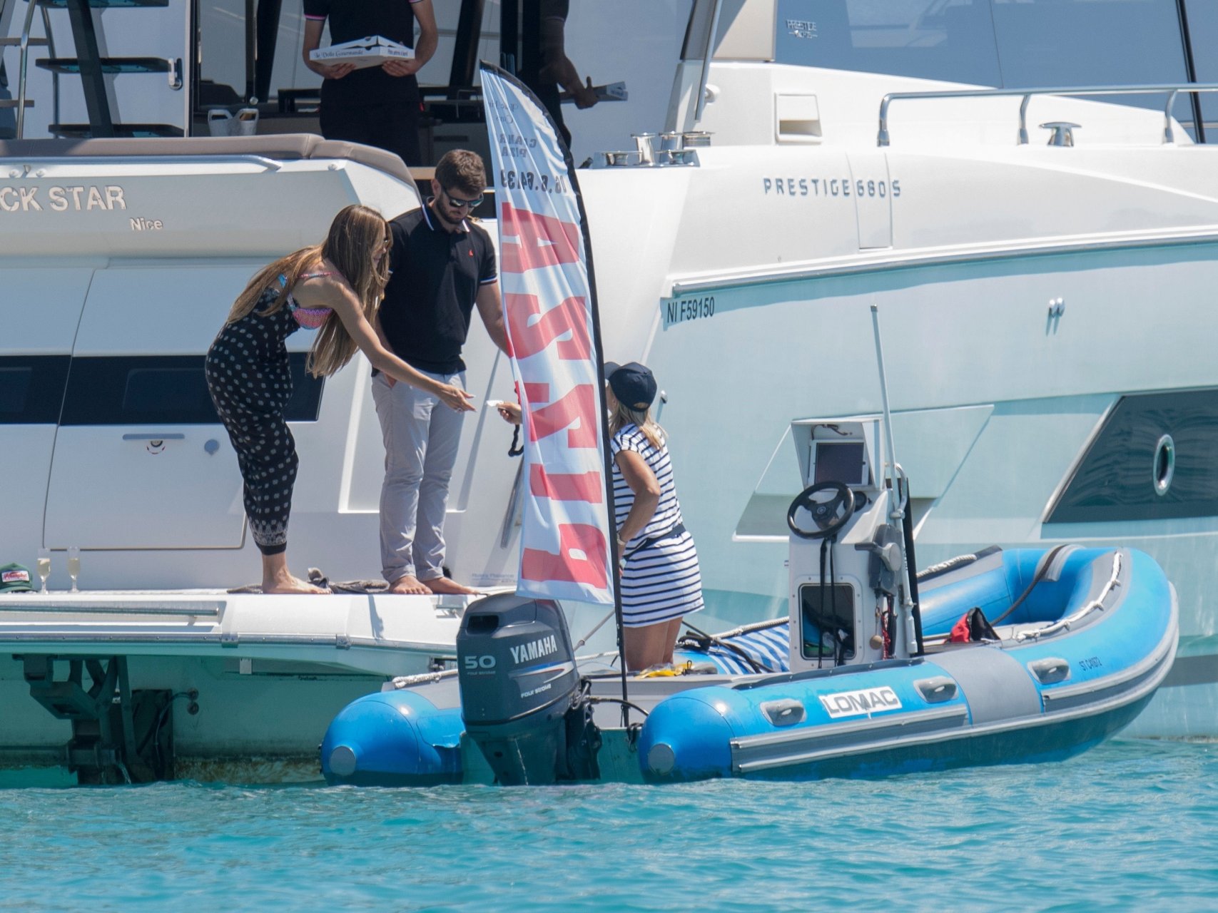 Немецкая супермодель и телеведущая Хайди Клум, 44 года, и её новый парень Том Каулитц заказывают пиццу на лодке в Каннах, 19.05.2018. Влюблённая пара целовалась, лежа на солнце.