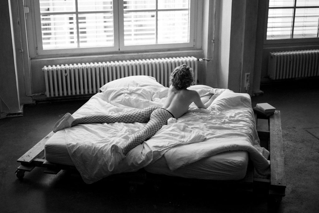 Взрослая модель Хайди Романова позирует обнажённой в сетчатых колготках и кроссовках в фотосессии Сачи Лейендека (2019).