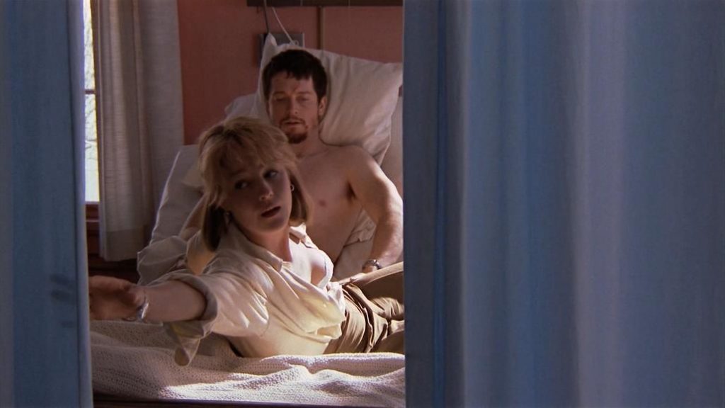 Хелен Хант в бюстгальтере с открытой рубашкой, целуется с парнем в больничной койке, и он расстегивает её юбку, чтобы показать трусики, а затем ласкает её пальцами.
