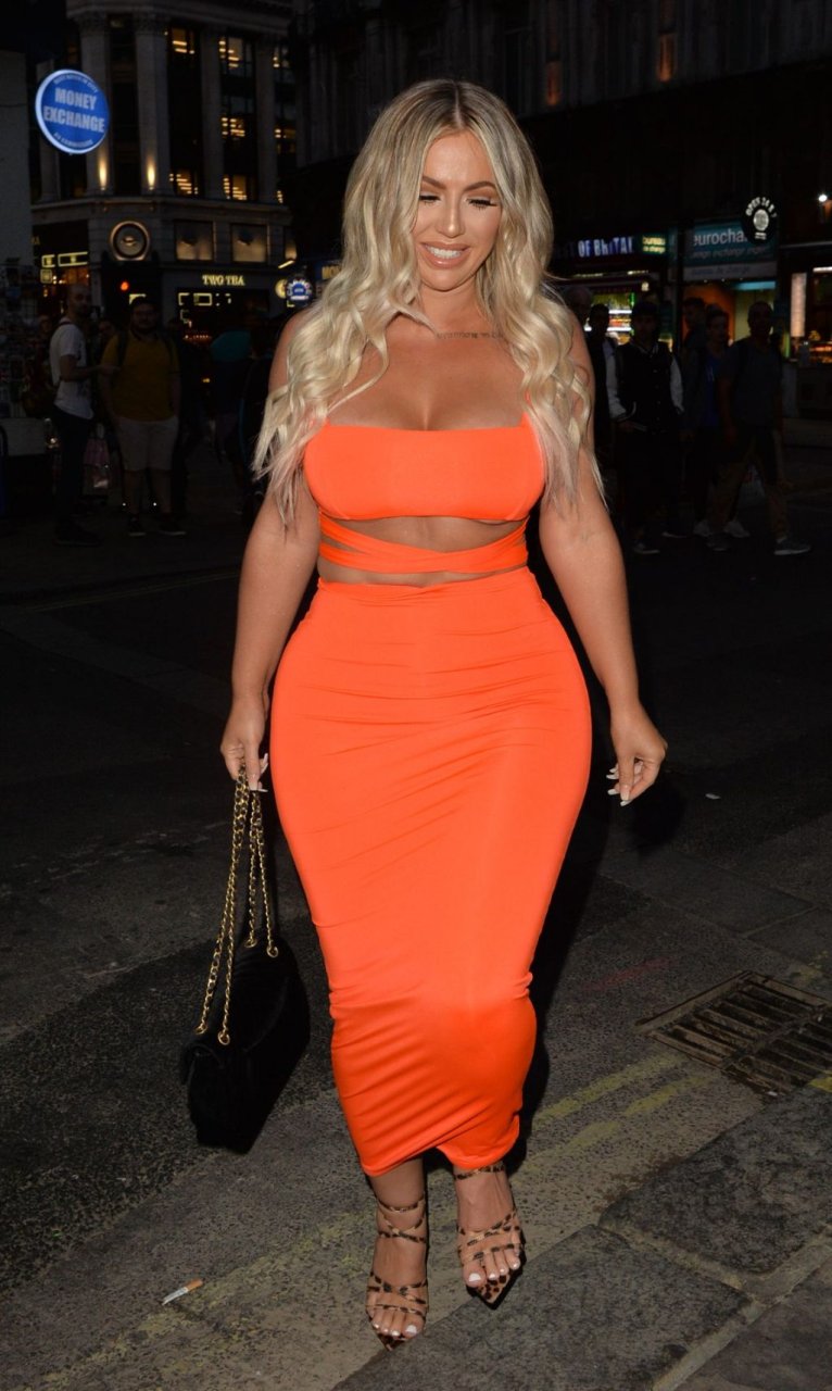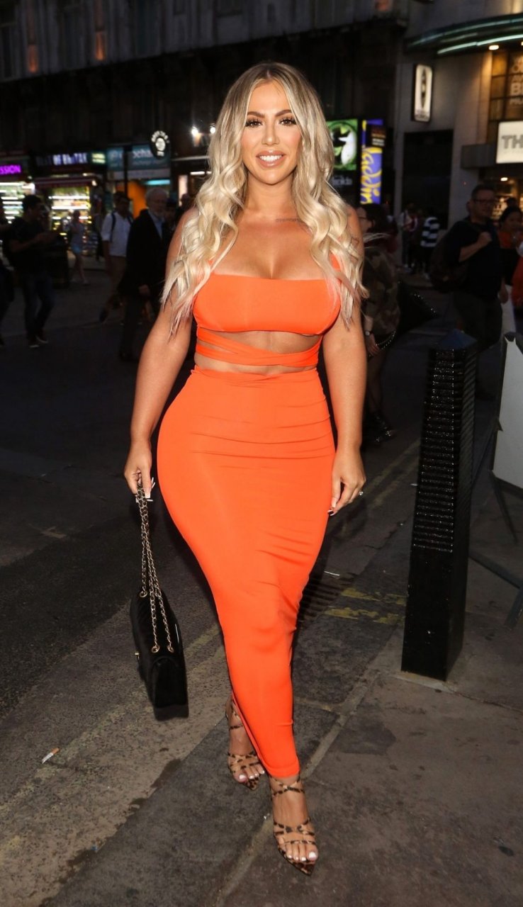 Holly Hagan демонстрирует свои изгибы в неоново-оранжевом, покидая ночной клуб Opium в Лондоне после празднования окончания съемок шоу Celebs Go Dating, 08/07/2019.