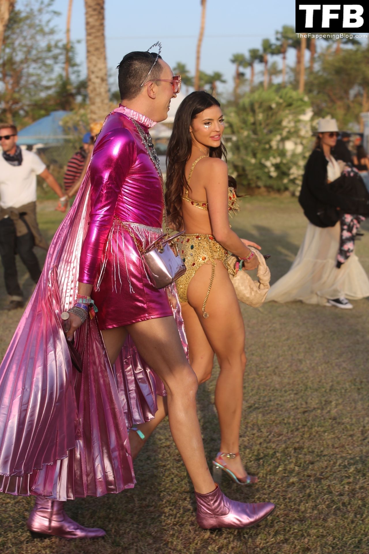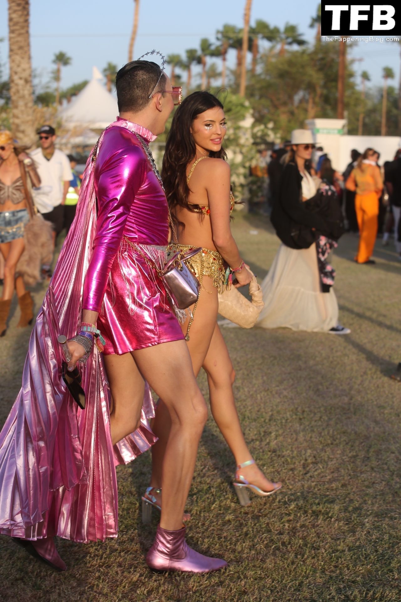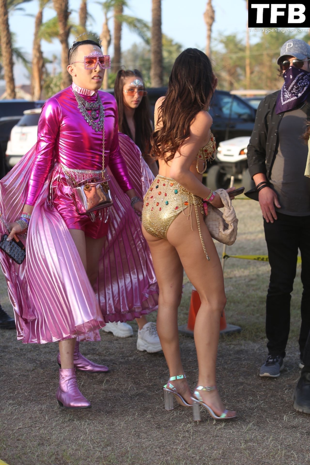 Модель Холли Скарфоне демонстрирует сексуальный образ, прибывая на Coachella в сексуальном золотом двухчастном бикини, 16.04.2022.