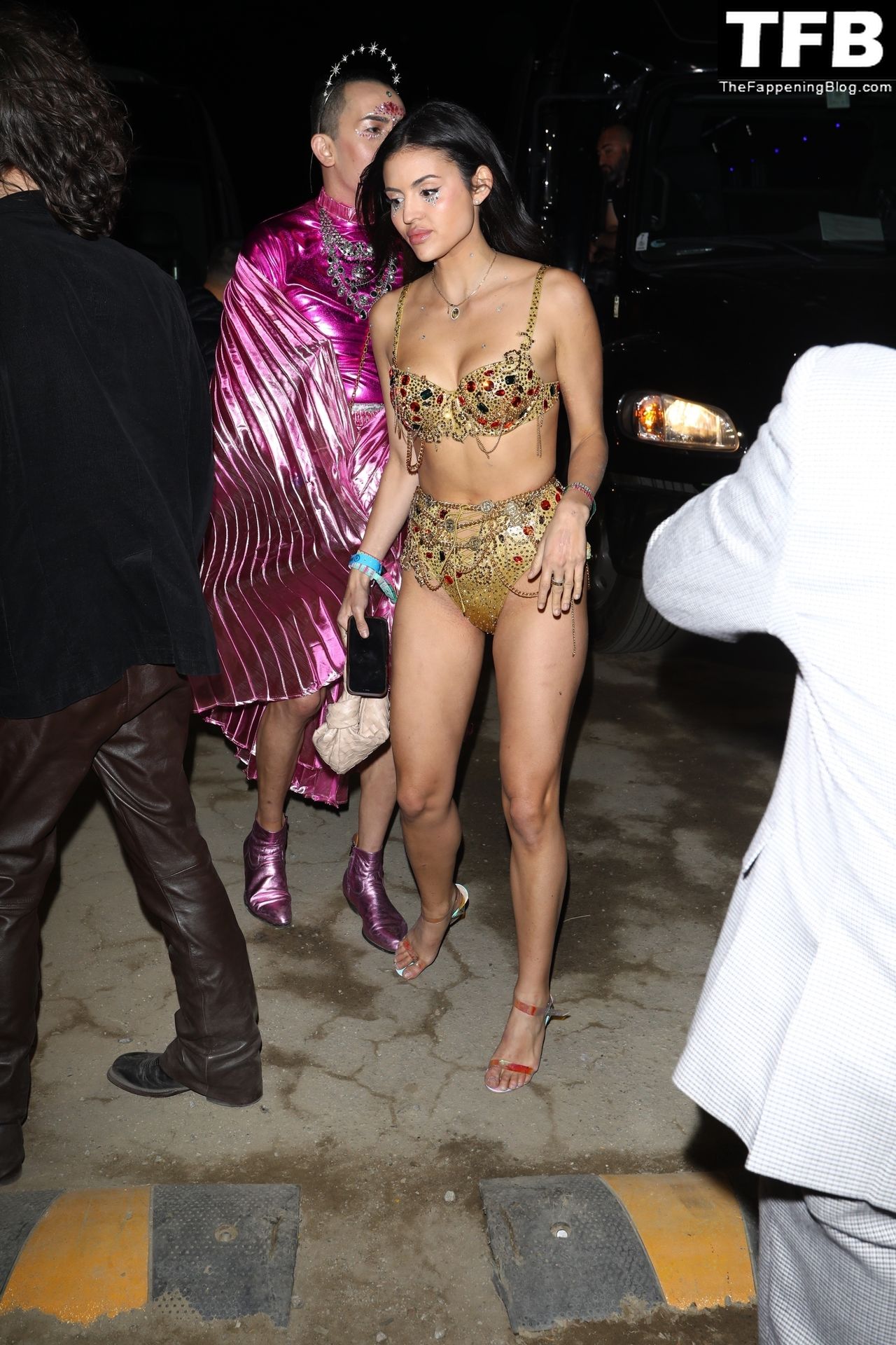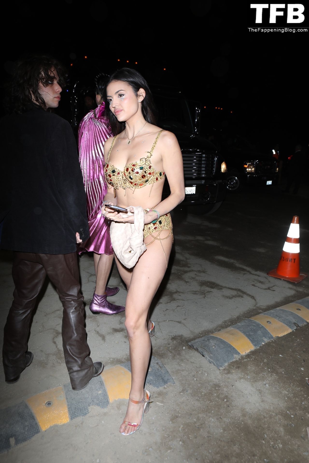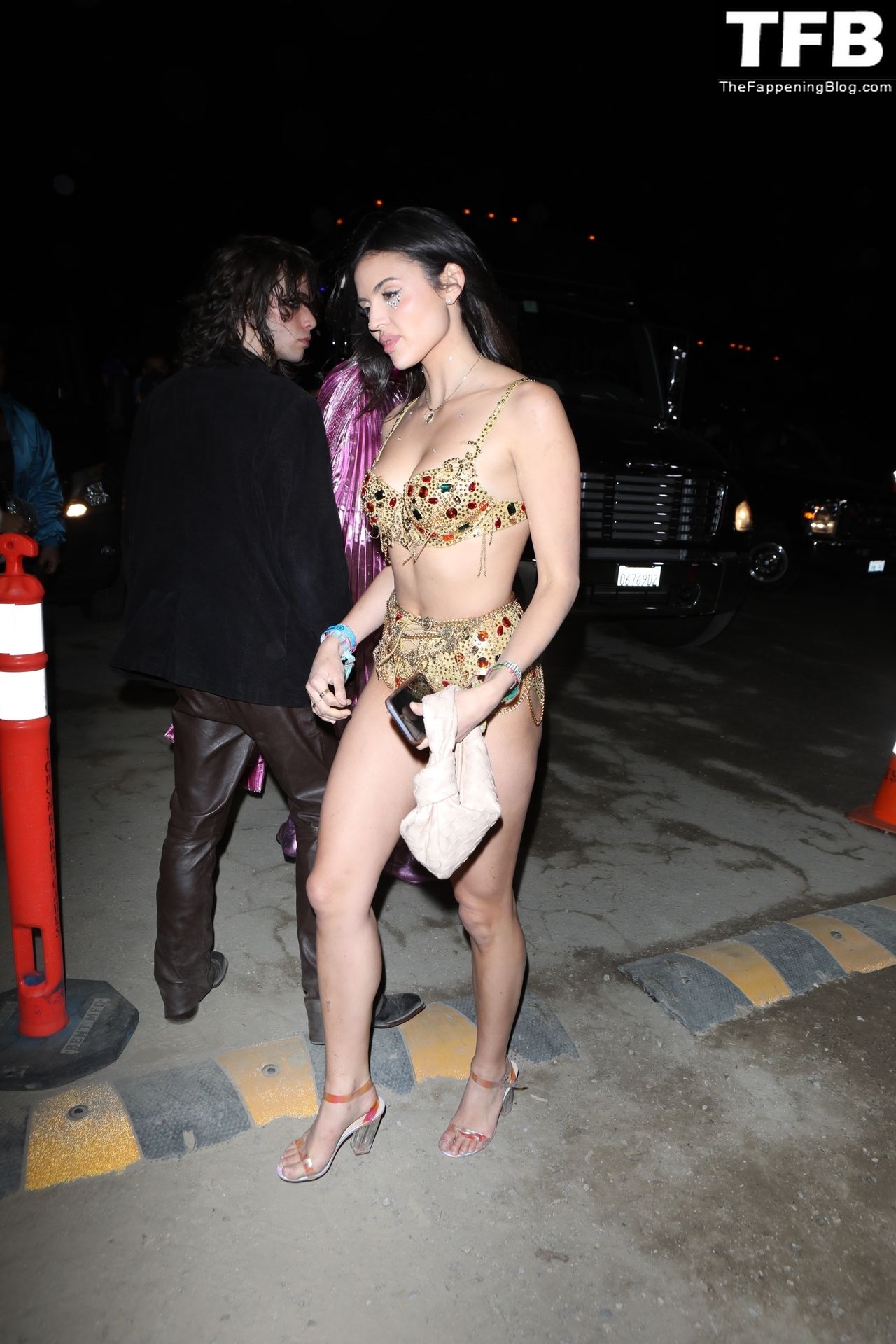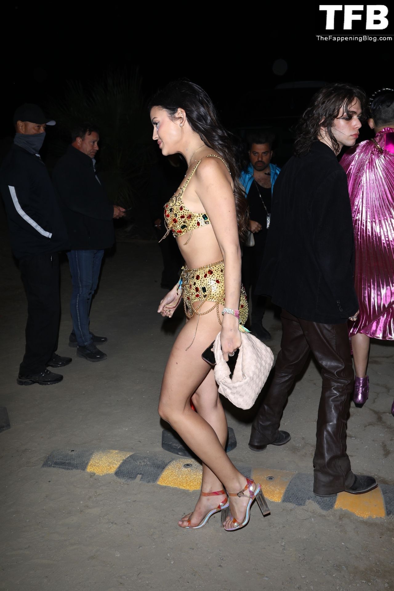 Модель Холли Скарфоне демонстрирует сексуальный образ, прибывая на Coachella в сексуальном золотом двухчастном бикини, 16.04.2022.