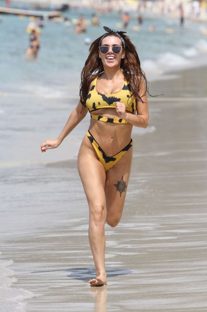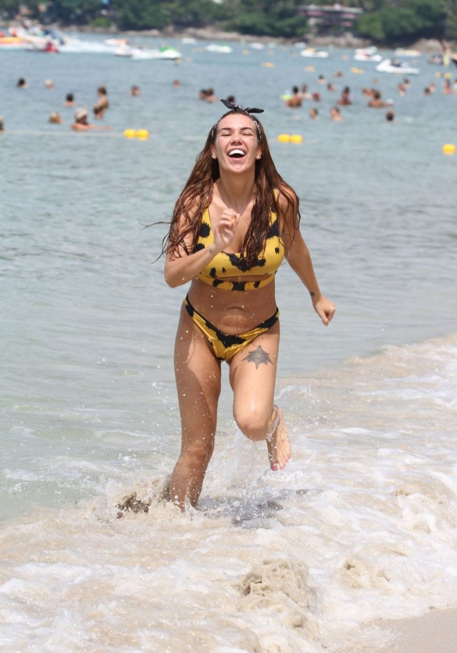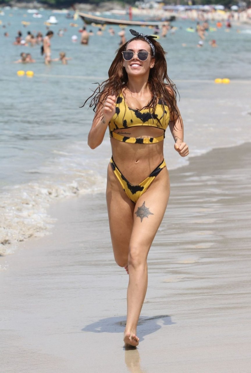 Ливерпульская красавица и звезда “Ibiza Weekender” Имоджен Таунли зажигает на пляжах Таиланда в желтом купальнике с животным принтом в горошек.