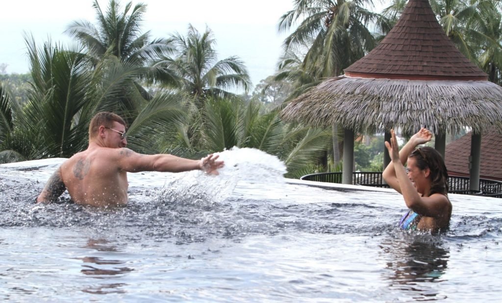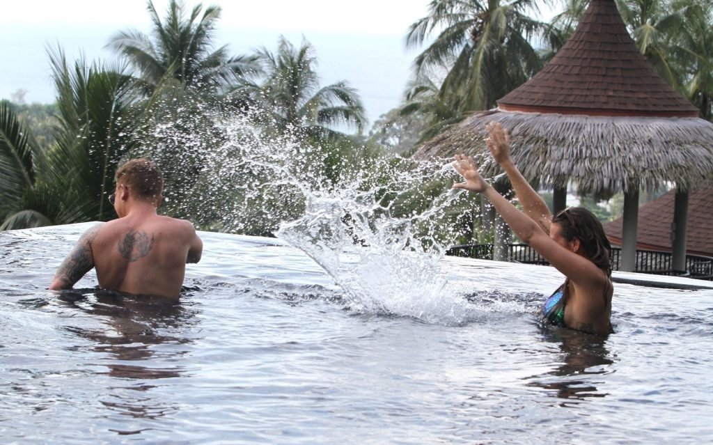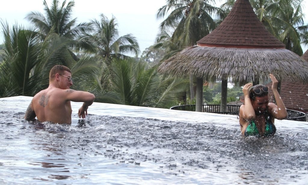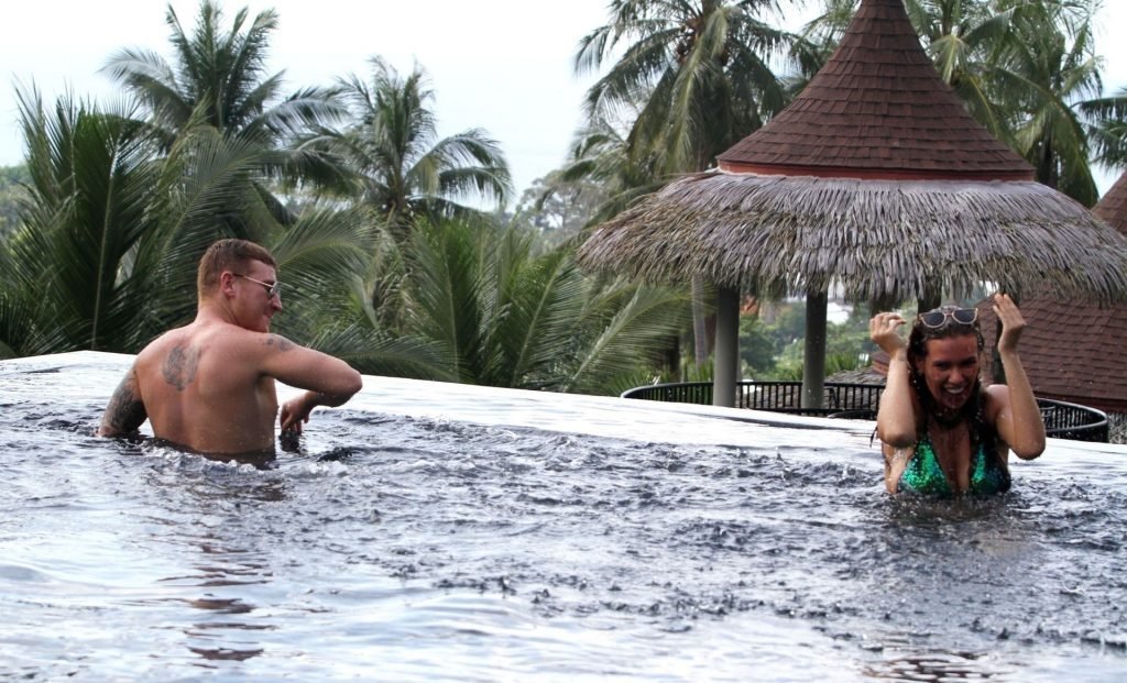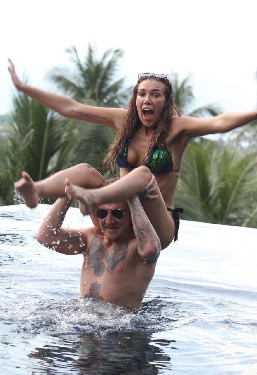 Имоджен, которая уже сбросила 3 стоуна веса, и похоже, что новая программа дает результаты, так как звезда выглядела потрясающе в своем многоцветном бикини на отдыхе у бассейна в Таиланде (апрель 2019).