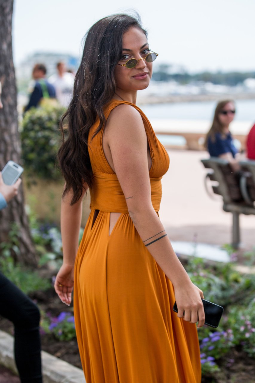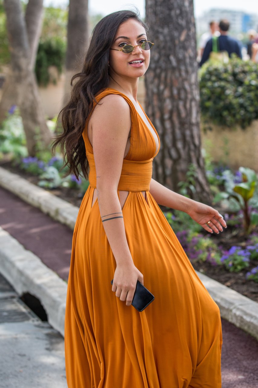 Inanna Sarkis одета в оранжевое платье на Круазетте в Каннах, Франция, 10.05.2018. Обладательница пышной груди, актриса, блогер и звезда социальных сетей продемонстрировала глубокое декольте и послала поцелуй папарацци.