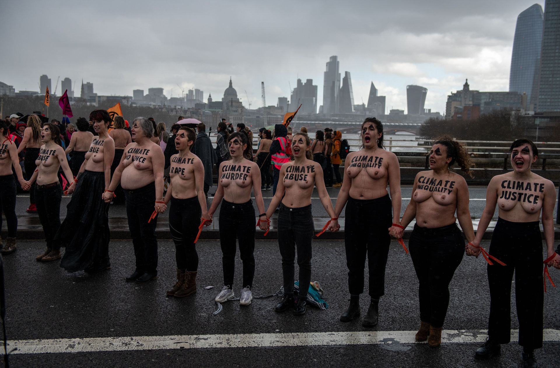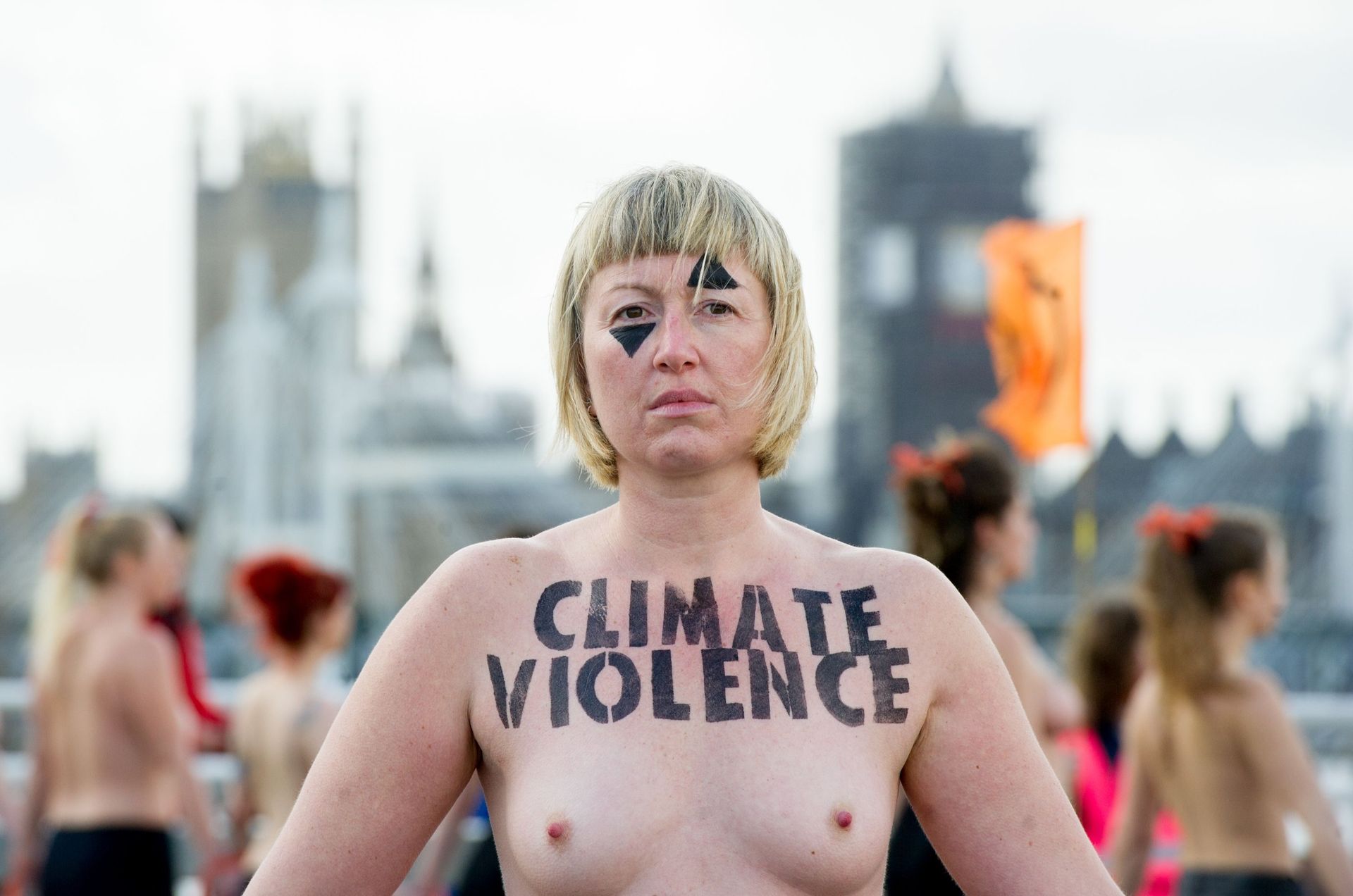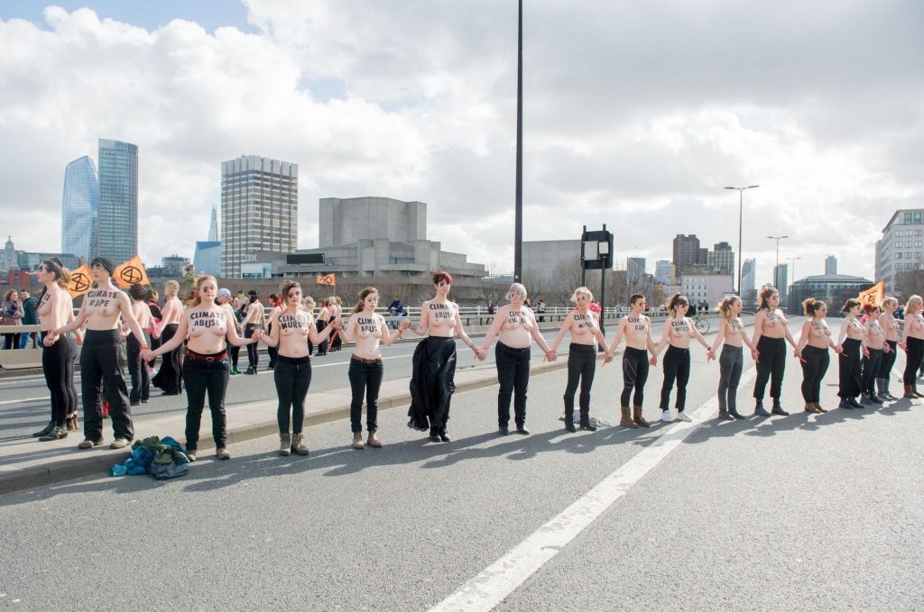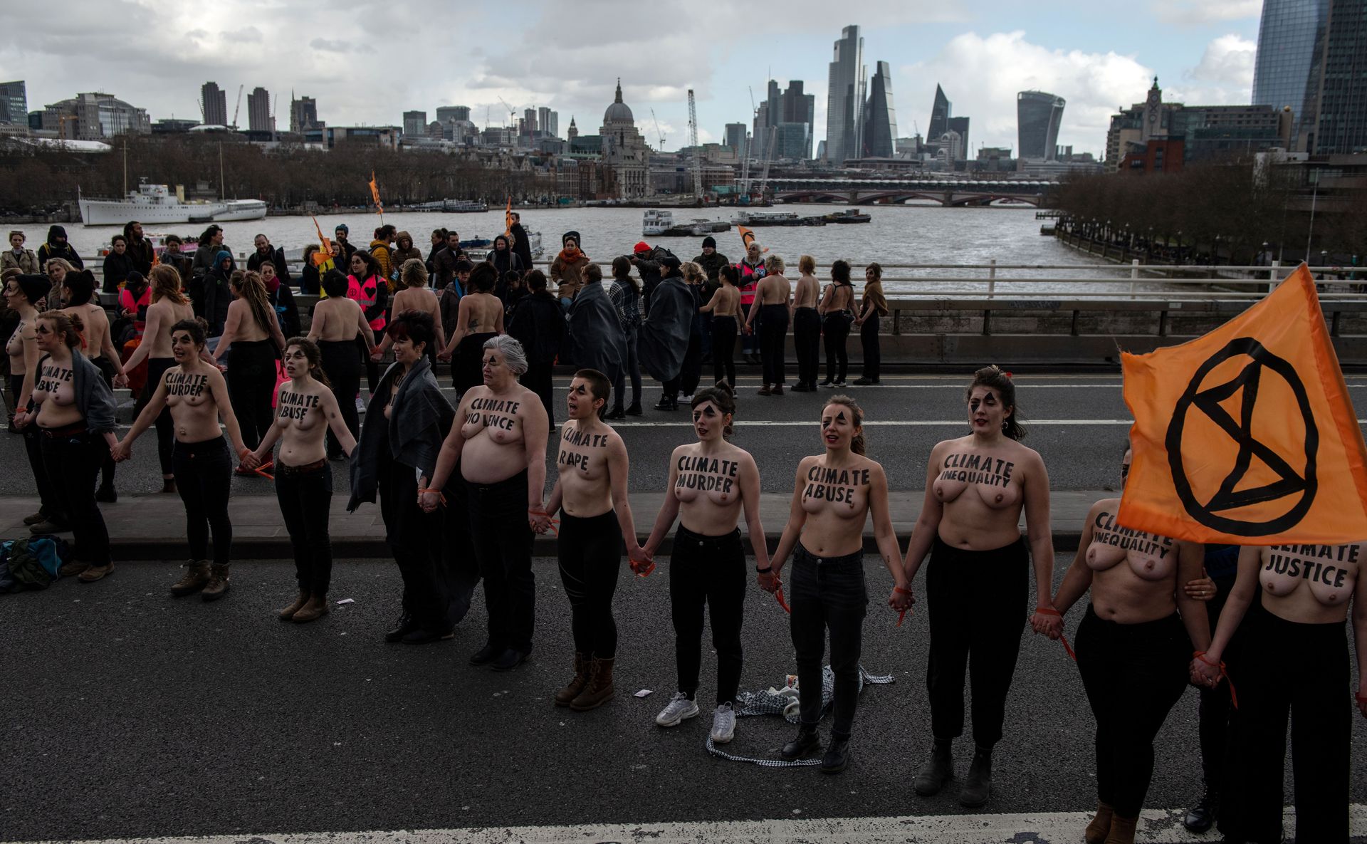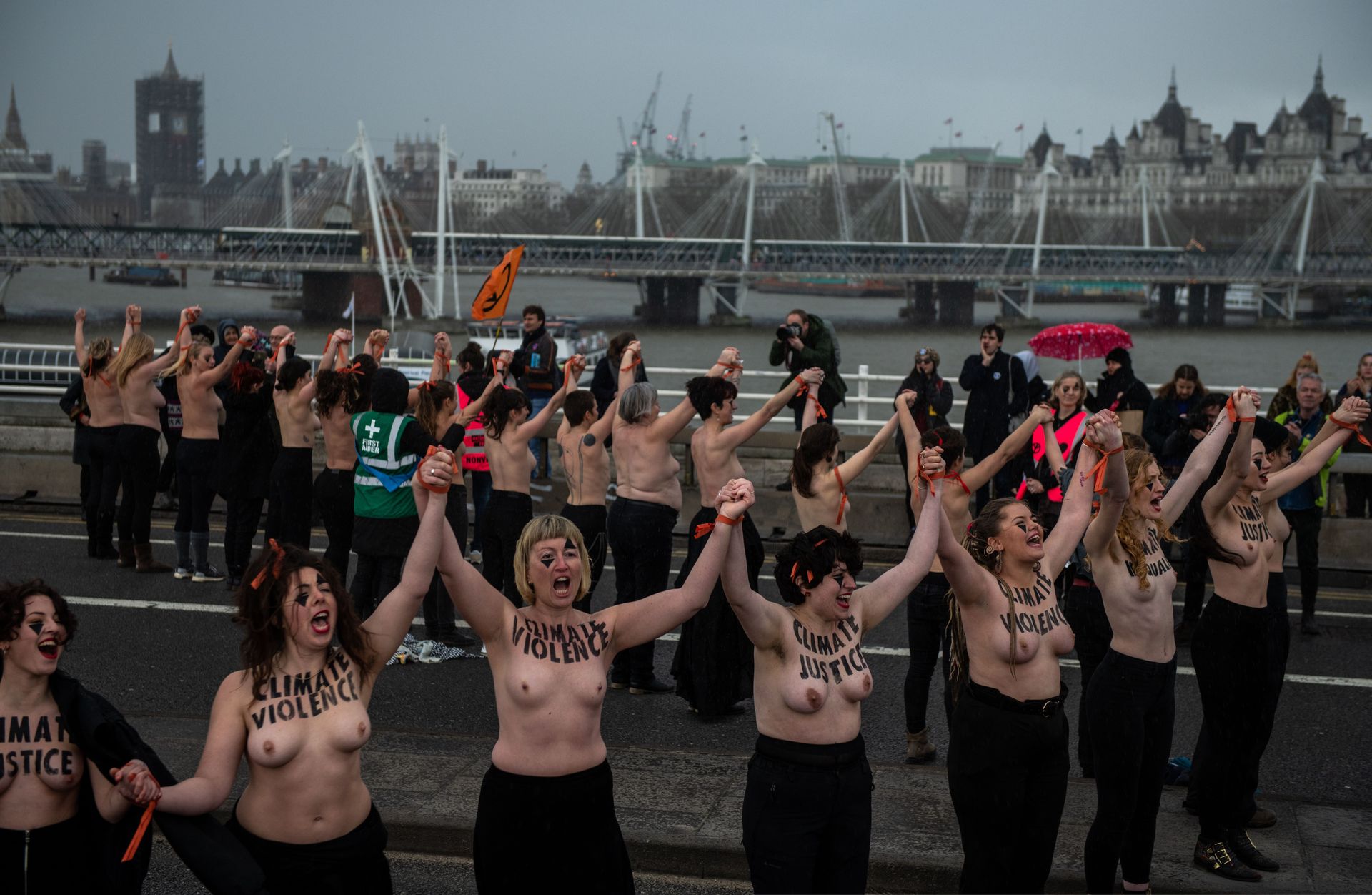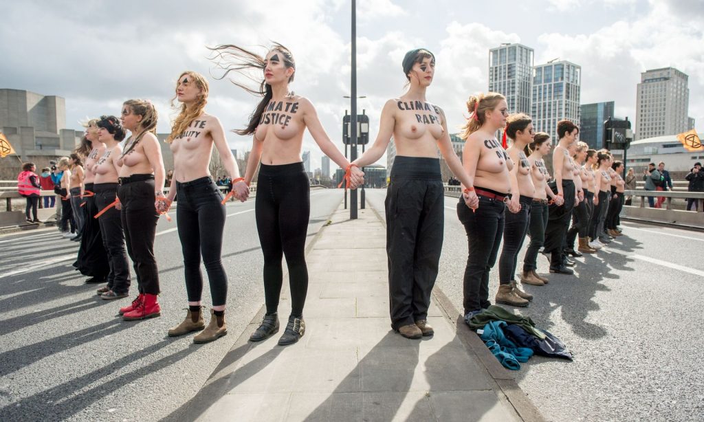 Женщины-активистки группы Extinction Rebellion Climate Crisis протестуют топлесс, блокируя весь транспорт в знак солидарности с женщинами по всему миру, которые непропорционально пострадали от климатического и экологического кризиса. С надписями на груди, включая Climate Justice, Climate Rape, Climate Murder и Climate inequality, акция является одной из многих по всему миру сегодня, включая действия в Колумбии, Испании, Турции, Гамбии, Пакистане, Нигерии, Уганде, ДРК, Бельгии, Израиле, Швеции и Аргентине.