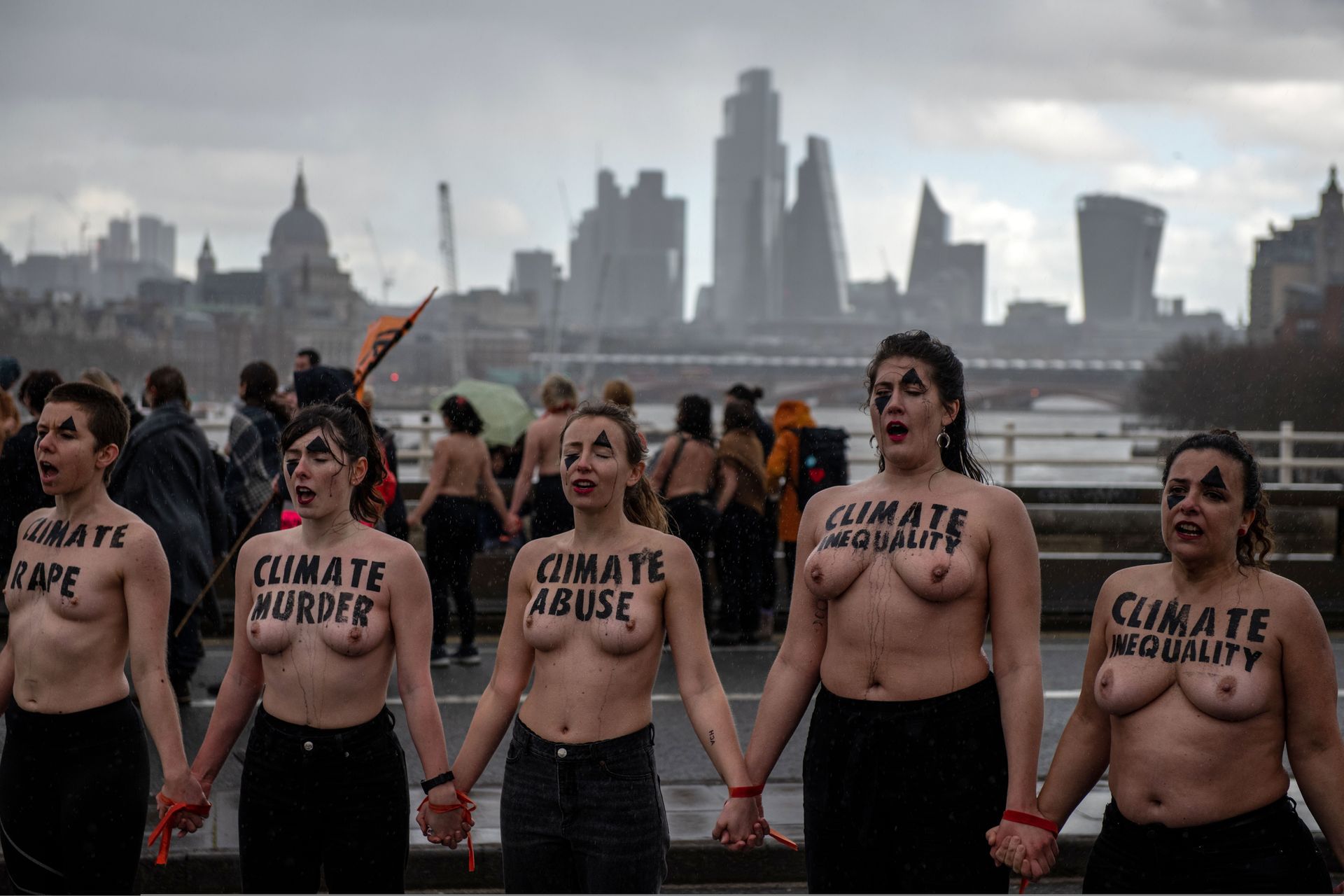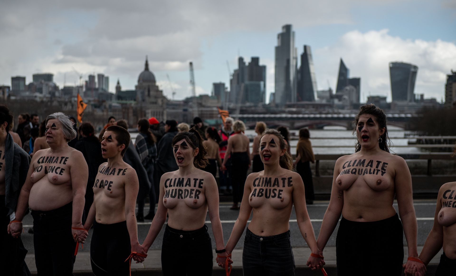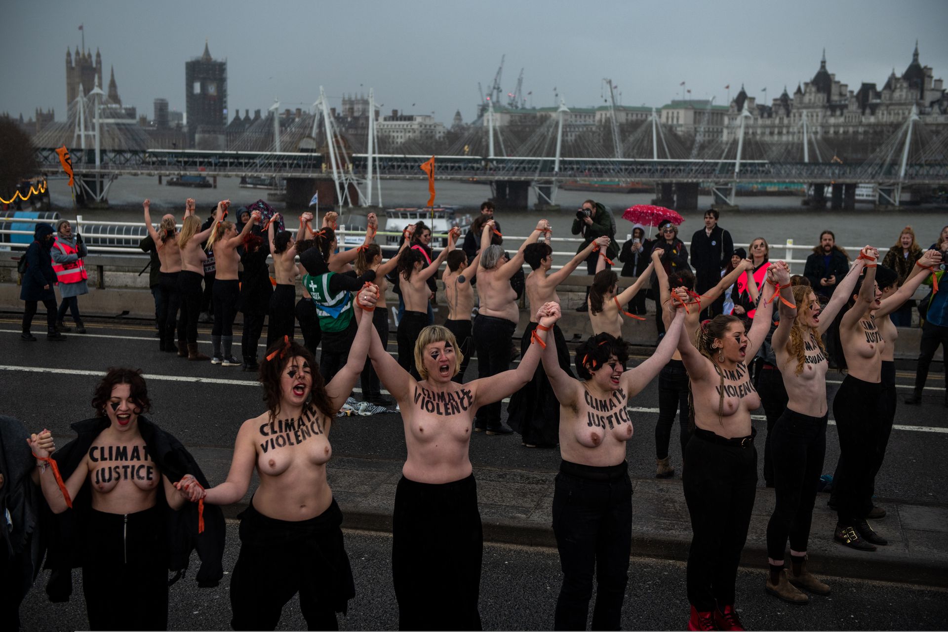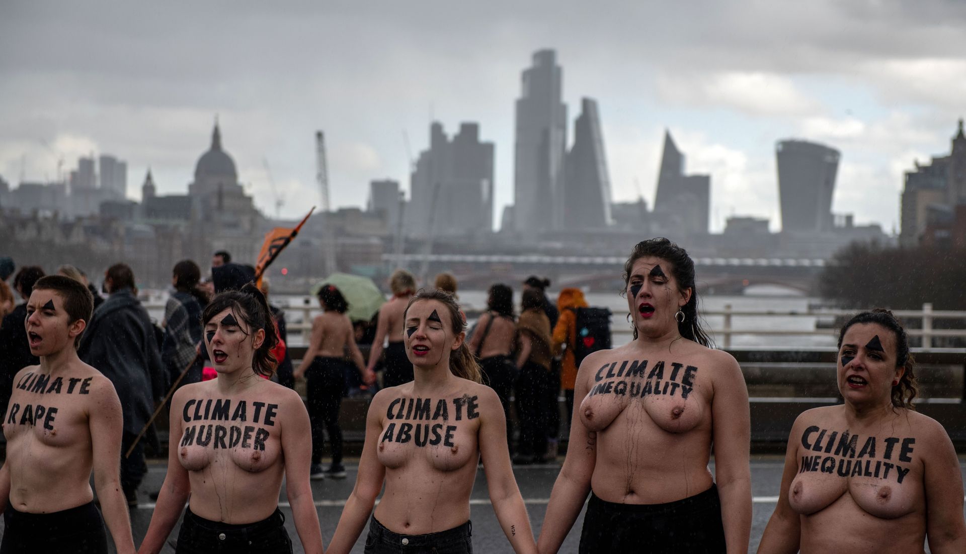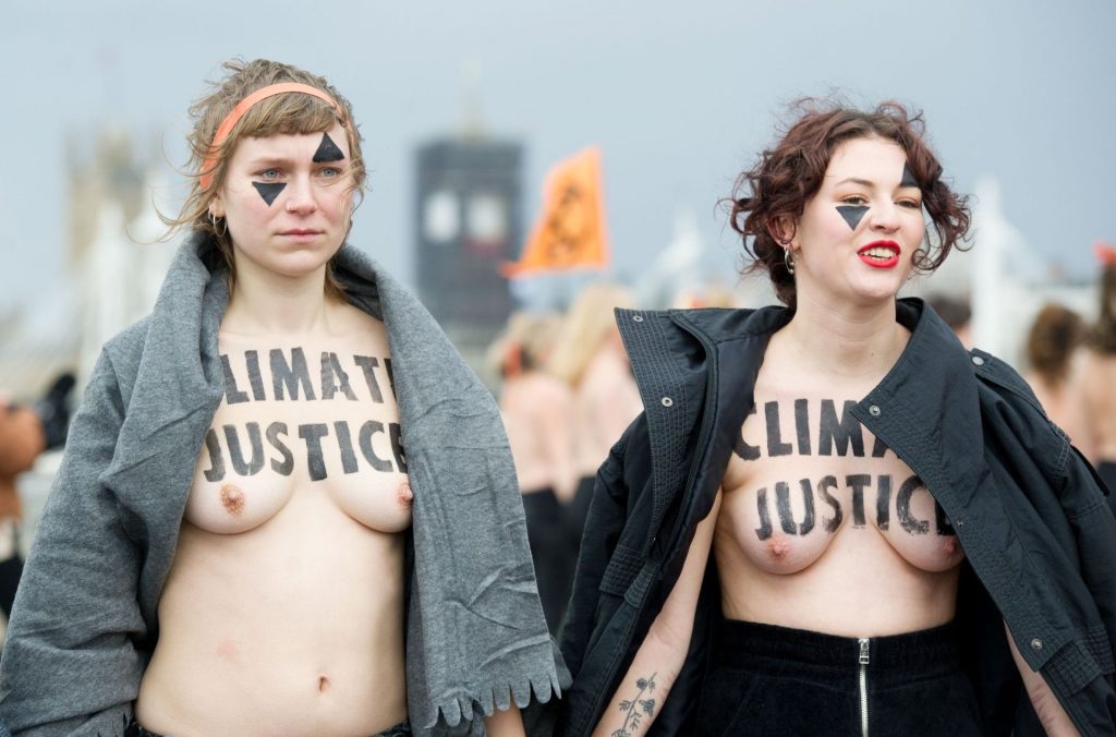 Женщины-активистки группы Extinction Rebellion Climate Crisis протестуют топлесс, блокируя весь транспорт в знак солидарности с женщинами по всему миру, которые непропорционально пострадали от климатического и экологического кризиса. С надписями на груди, включая Climate Justice, Climate Rape, Climate Murder и Climate inequality, акция является одной из многих по всему миру сегодня, включая действия в Колумбии, Испании, Турции, Гамбии, Пакистане, Нигерии, Уганде, ДРК, Бельгии, Израиле, Швеции и Аргентине.