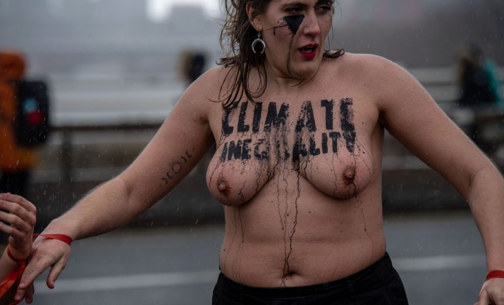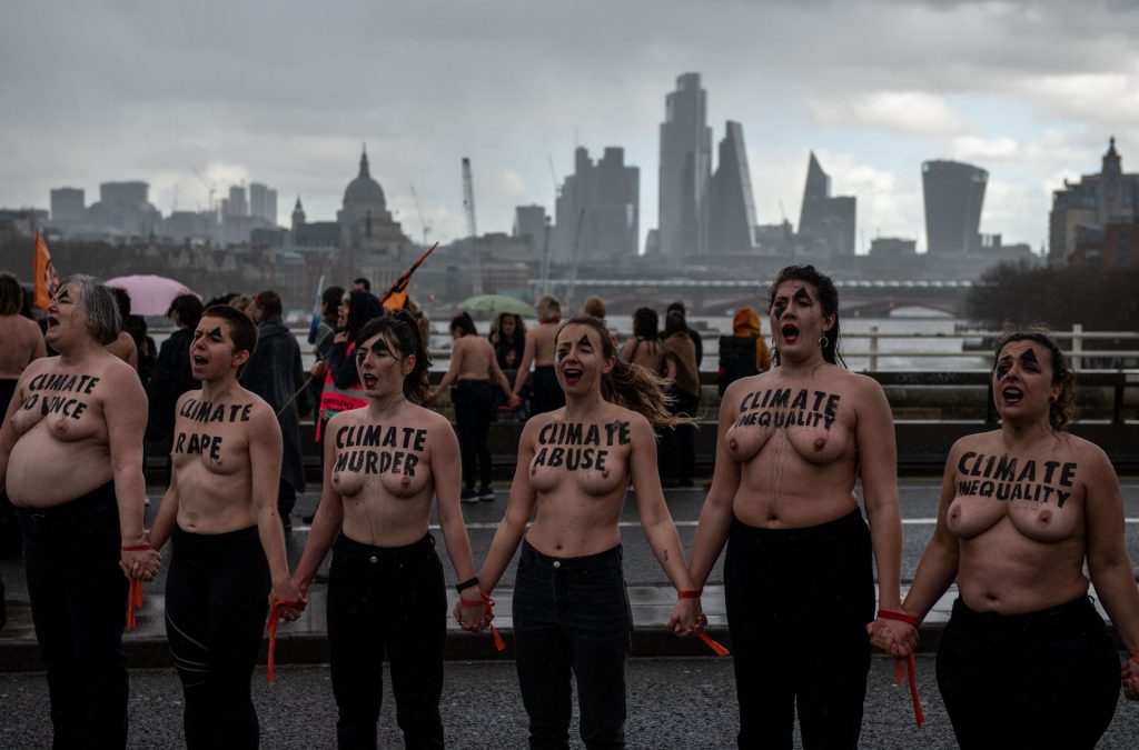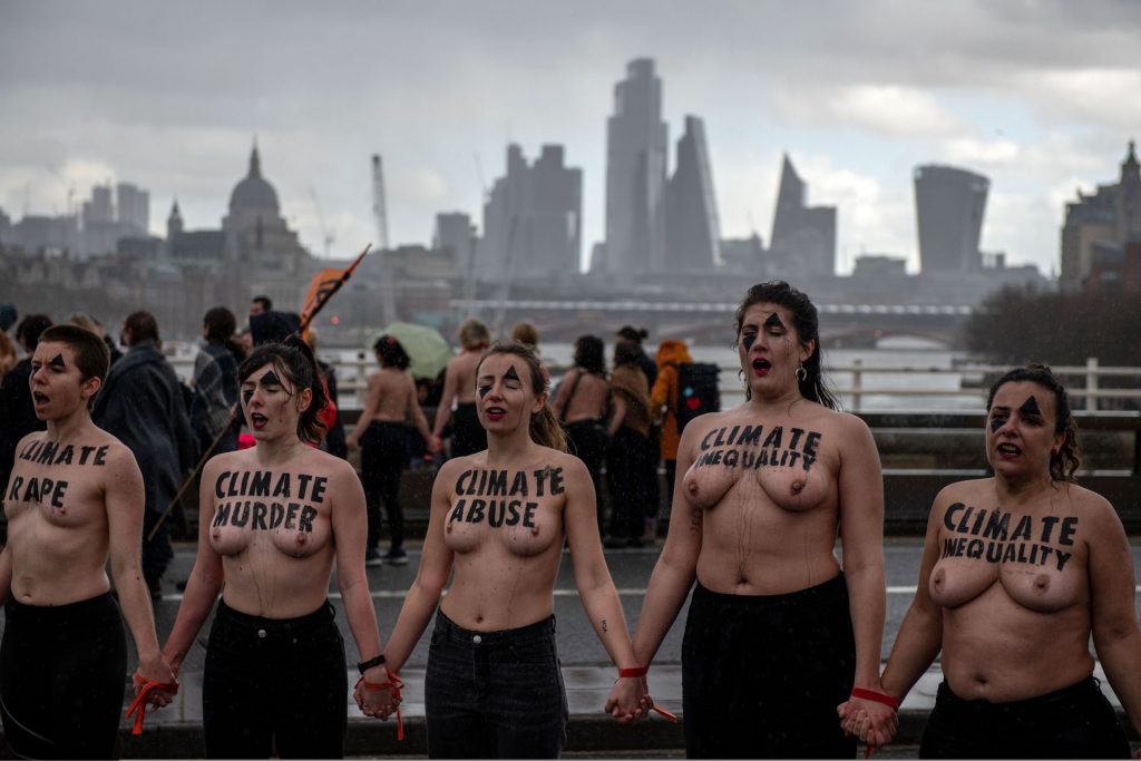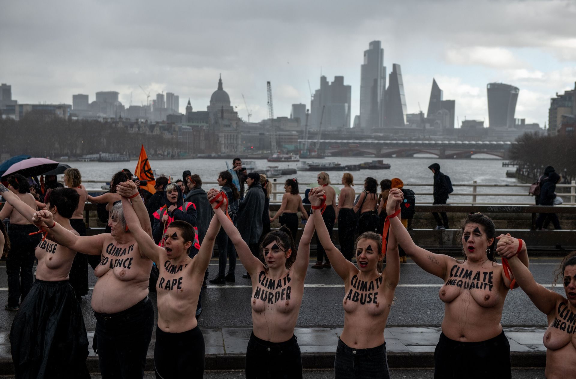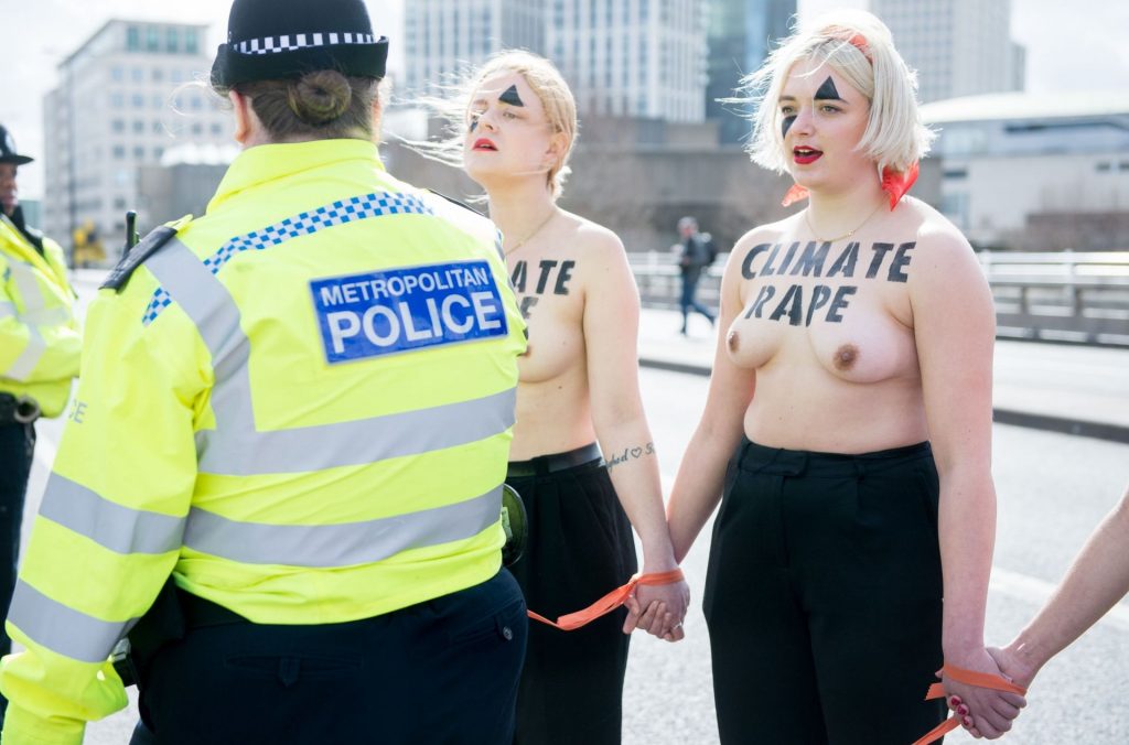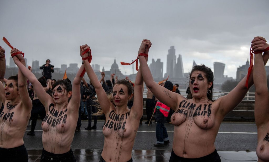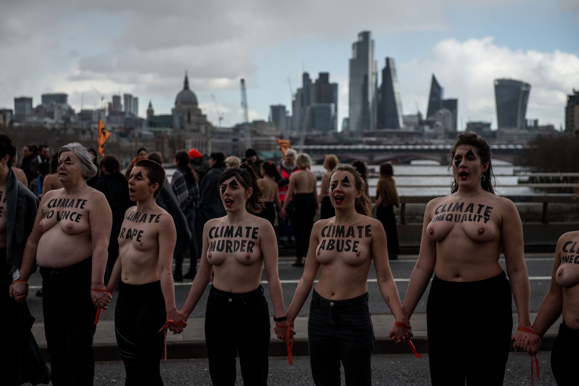 Женщины-активистки группы Extinction Rebellion Climate Crisis протестуют топлесс, блокируя весь транспорт в знак солидарности с женщинами по всему миру, которые непропорционально пострадали от климатического и экологического кризиса. С надписями на груди, включая Climate Justice, Climate Rape, Climate Murder и Climate inequality, акция является одной из многих по всему миру сегодня, включая действия в Колумбии, Испании, Турции, Гамбии, Пакистане, Нигерии, Уганде, ДРК, Бельгии, Израиле, Швеции и Аргентине.