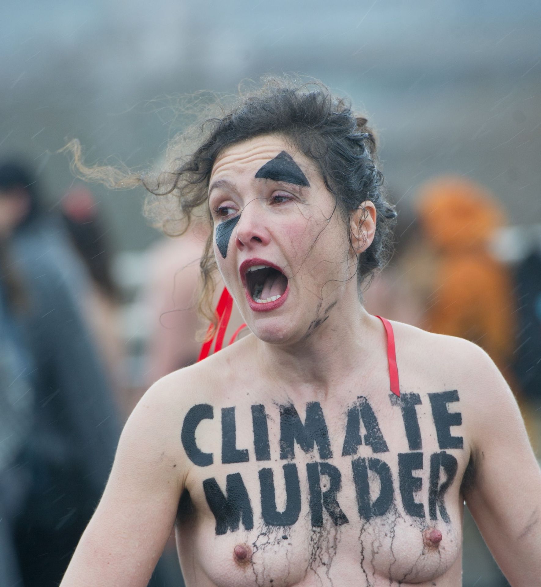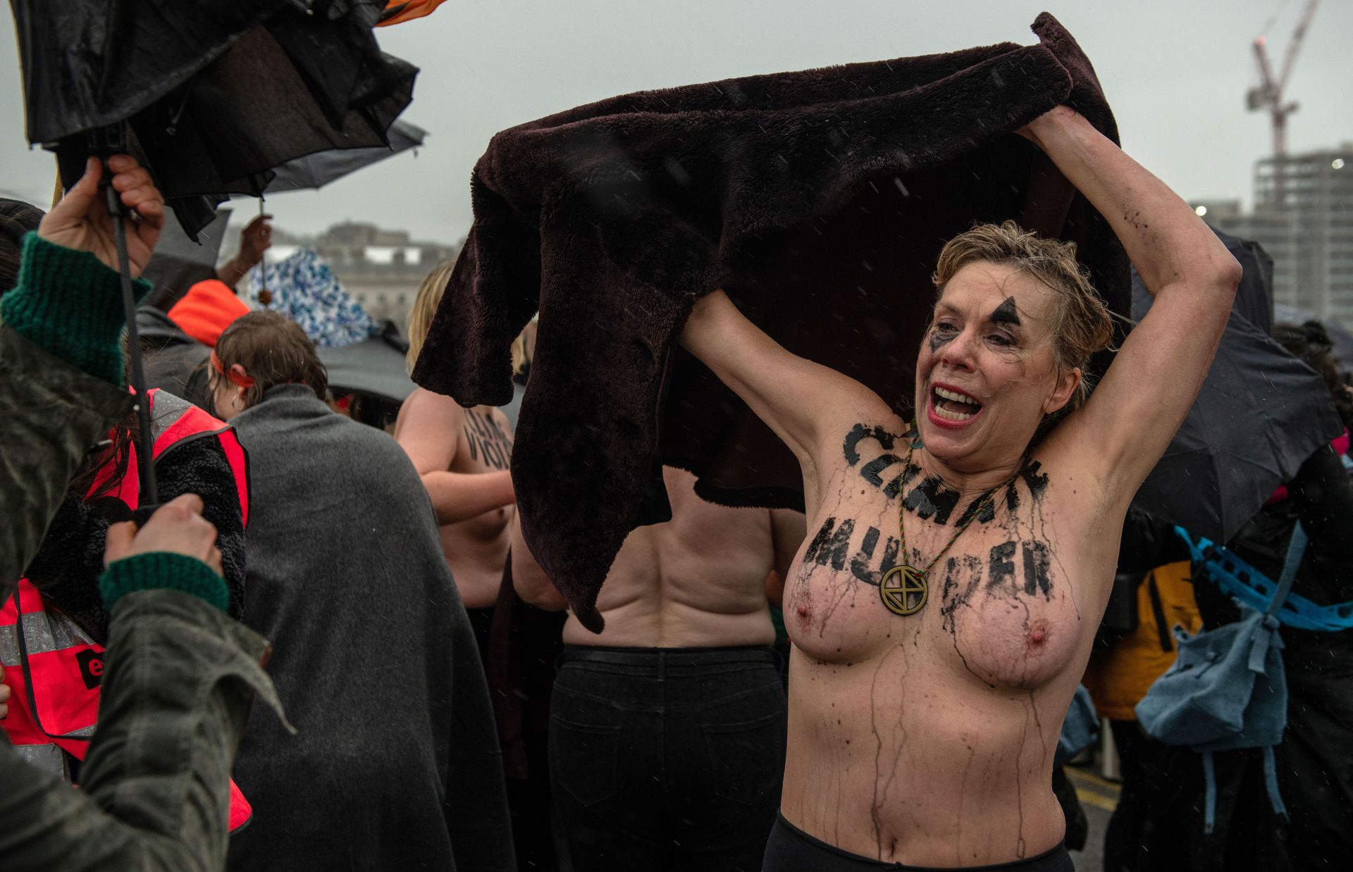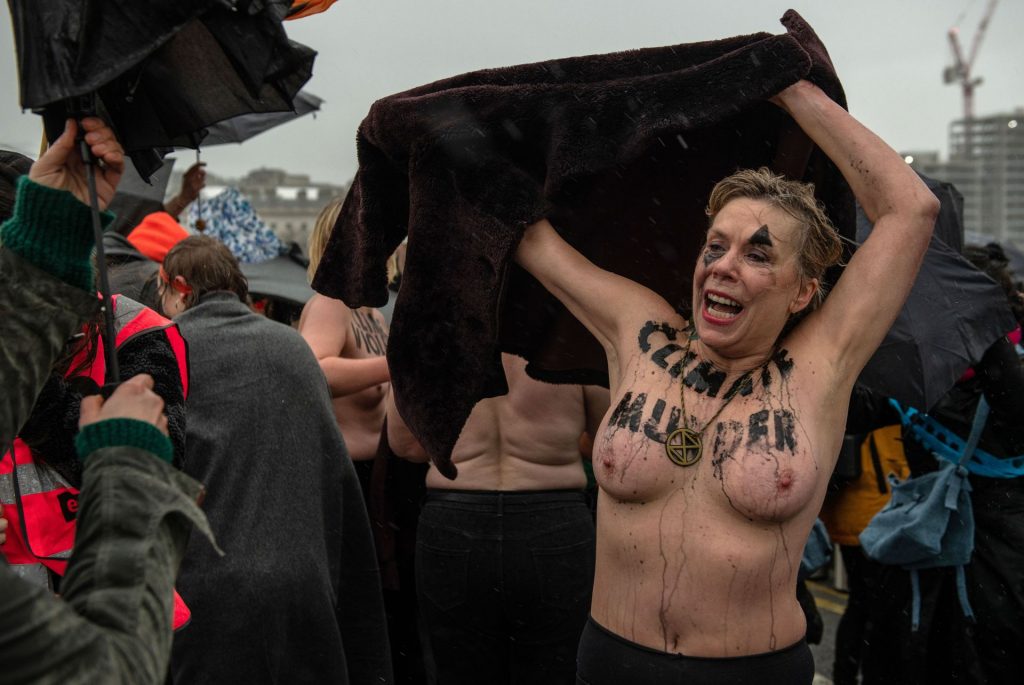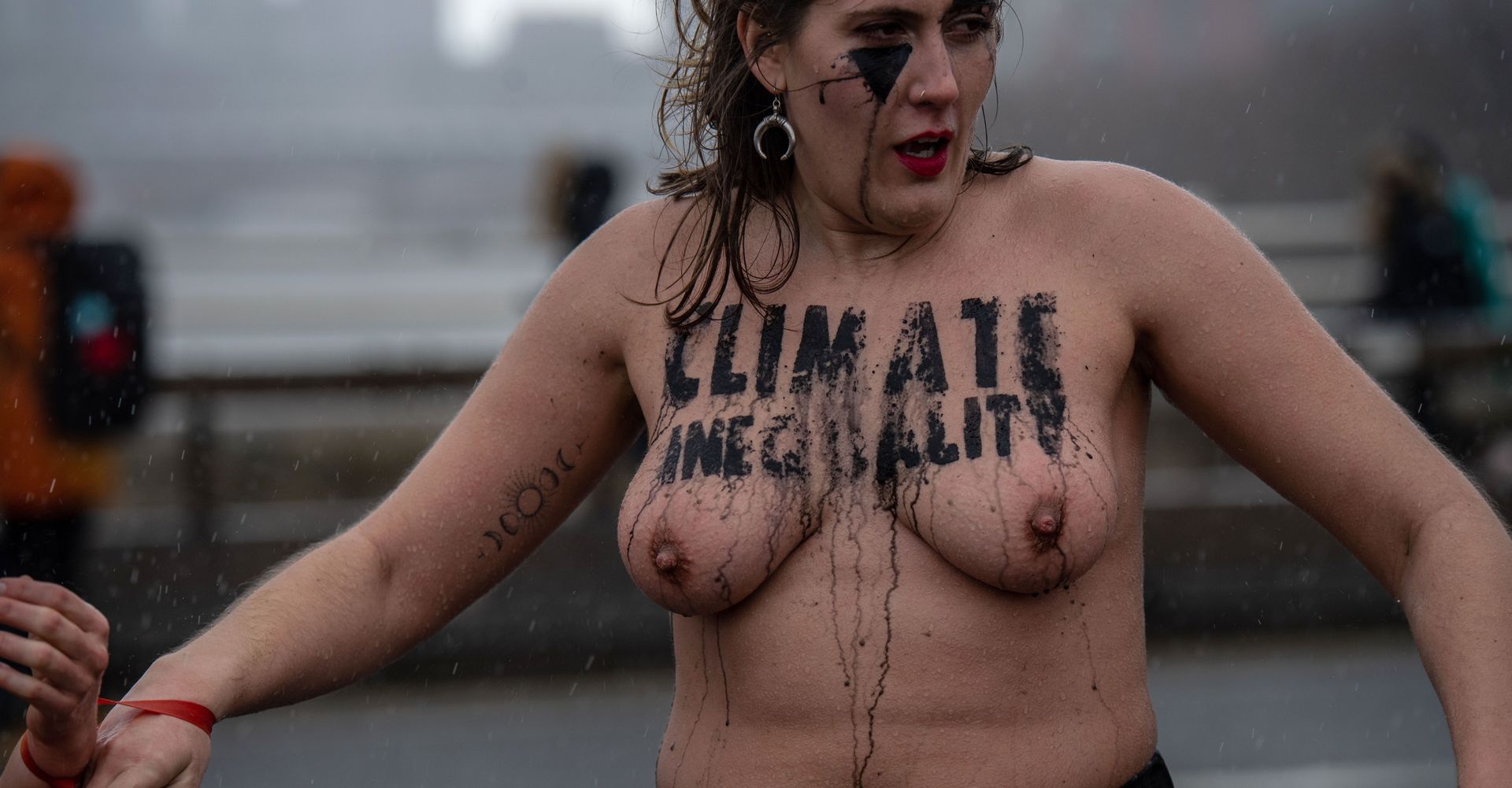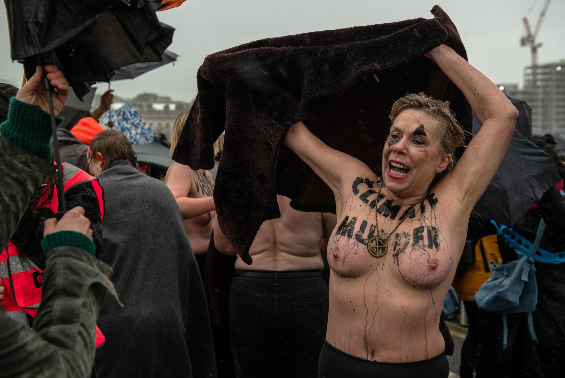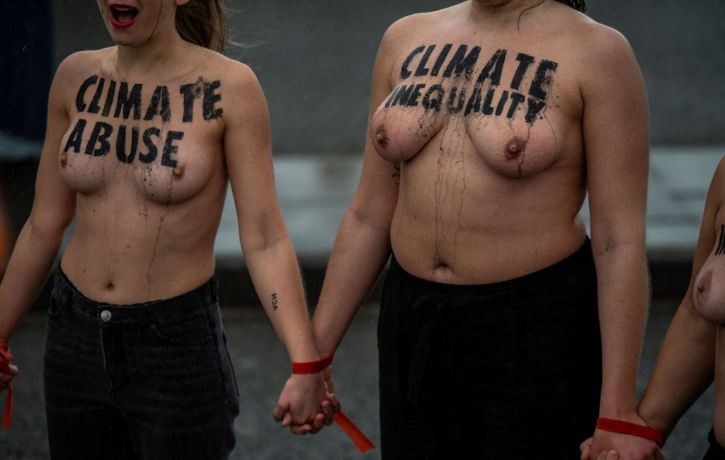 Женщины-активистки группы Extinction Rebellion Climate Crisis протестуют топлесс, блокируя весь транспорт в знак солидарности с женщинами по всему миру, которые непропорционально пострадали от климатического и экологического кризиса. С надписями на груди, включая Climate Justice, Climate Rape, Climate Murder и Climate inequality, акция является одной из многих по всему миру сегодня, включая действия в Колумбии, Испании, Турции, Гамбии, Пакистане, Нигерии, Уганде, ДРК, Бельгии, Израиле, Швеции и Аргентине.