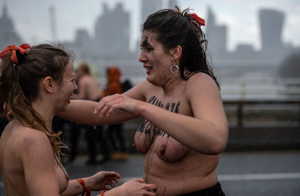 Обнажённые активистки Extinction Rebellion блокируют мост Ватерлоо в демонстрации в Международный женский день 8 марта 2020 года в Лондоне, Англия. Международный женский день отмечается 8 марта каждого года и является глобальным днём, посвящённым социальным, экономическим, культурным и политическим достижениям женщин, а также служит точкой фокуса для прав женщин.