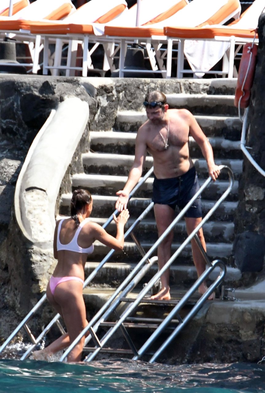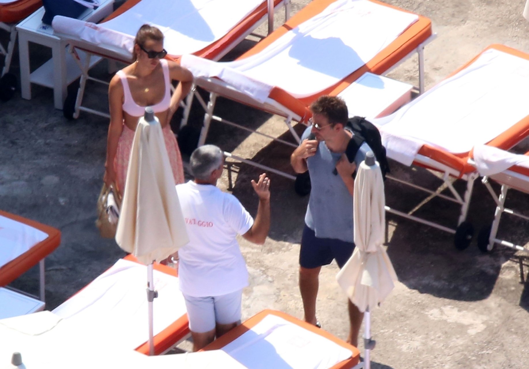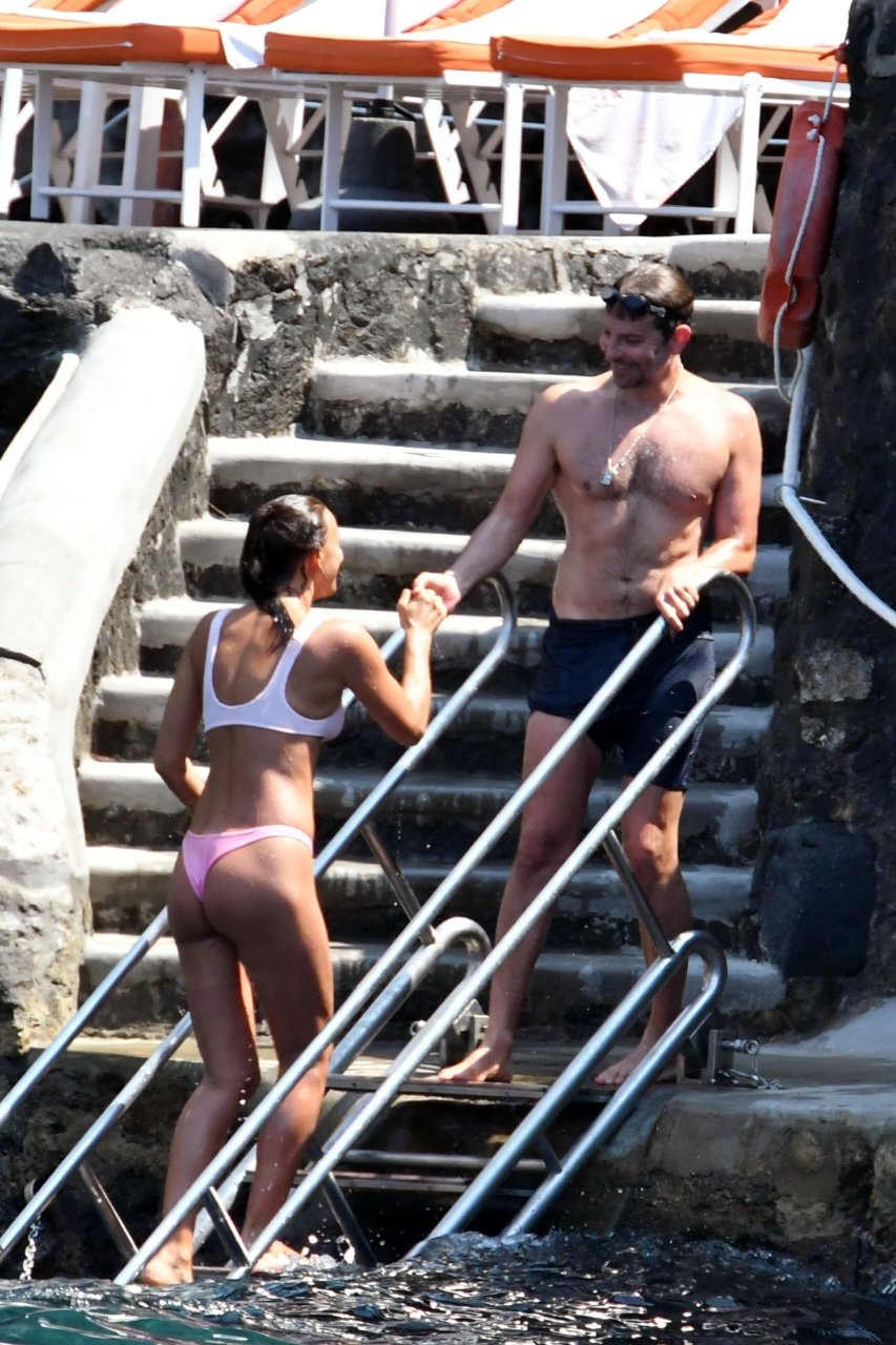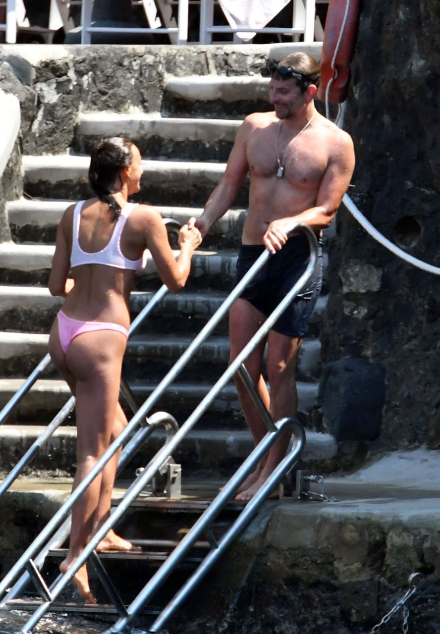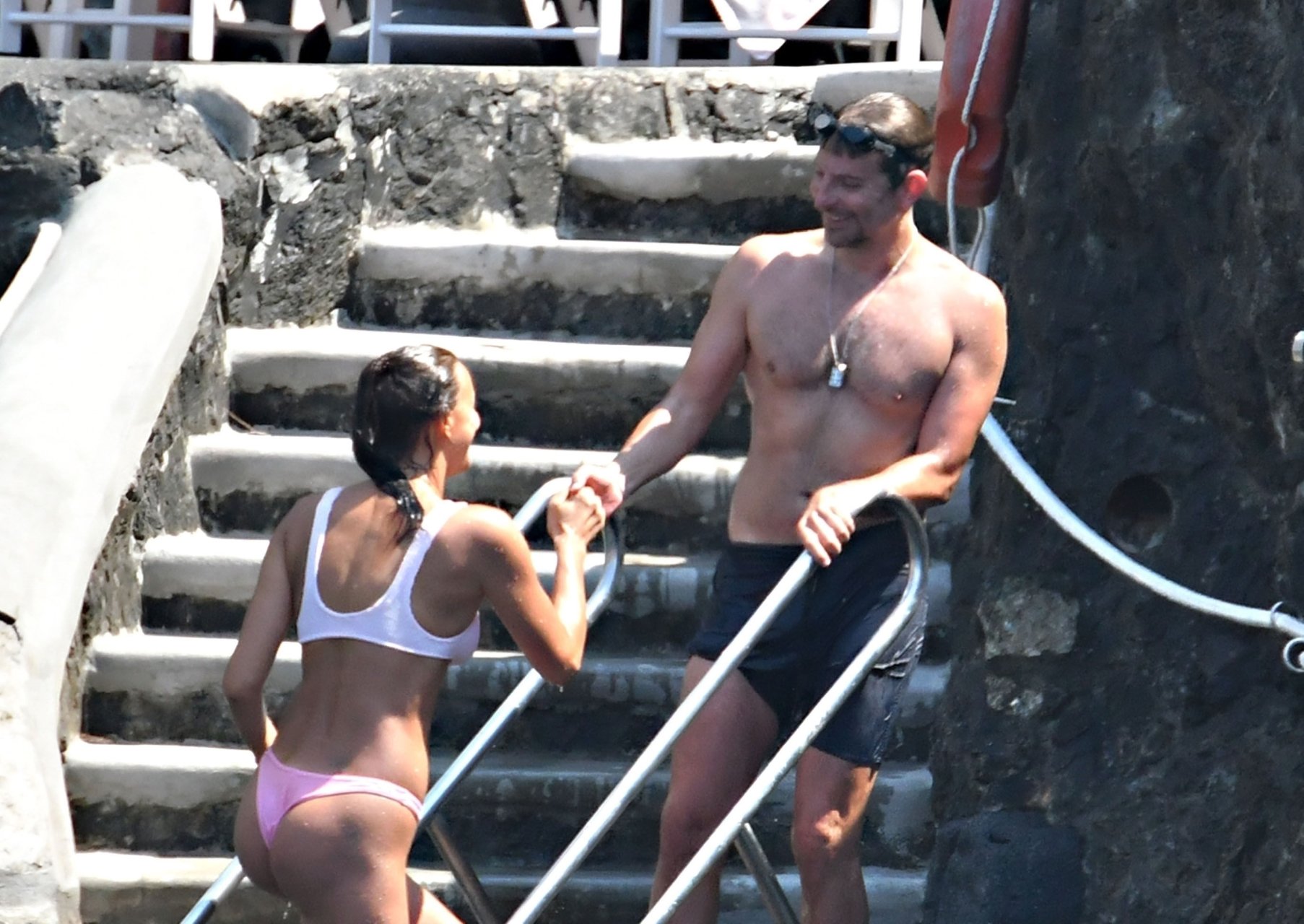Голливудский актер Брэдли Купер и его модельная девушка Ирина Шейк запечатлены в очень ласковых и влюбленных позах, когда пара демонстрирует свои подтянутые тела во время совместного отпуска в Позитано, Италия, 08/04/2018.