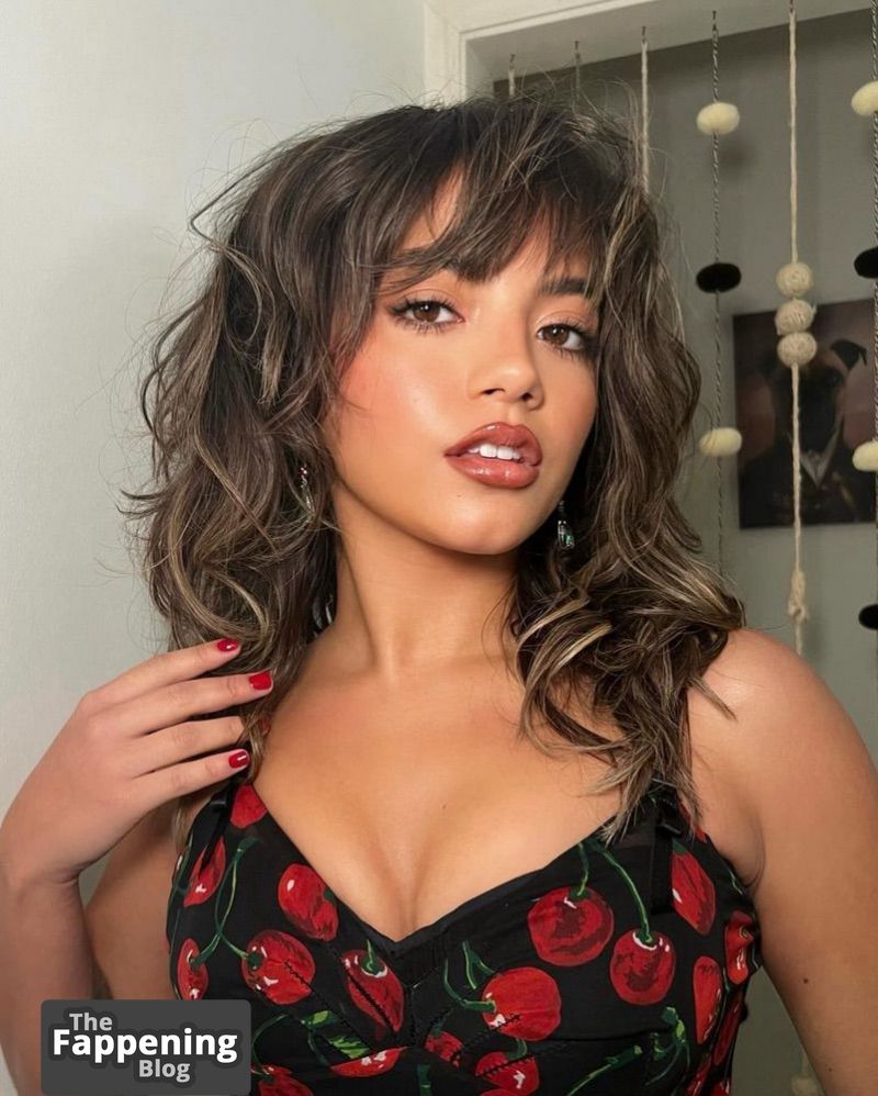 Изабела Мерсед в обтягивающем черном платье, демонстрирует серьезное декольте с выпирающей грудью.