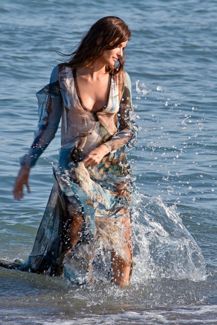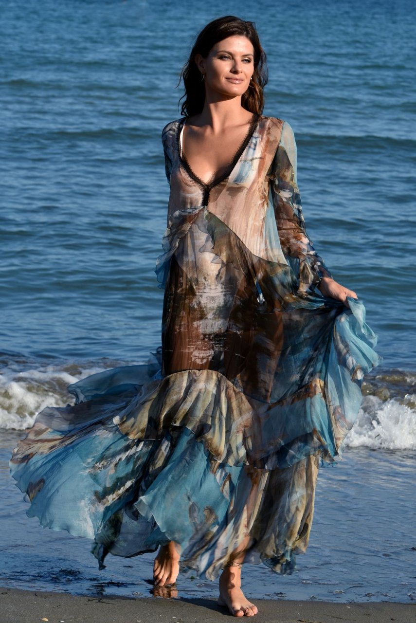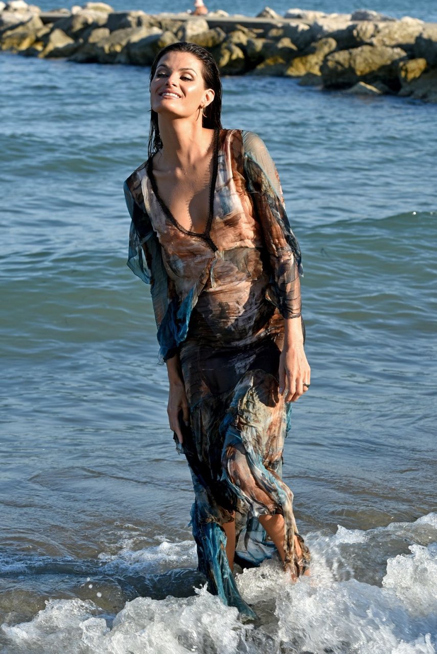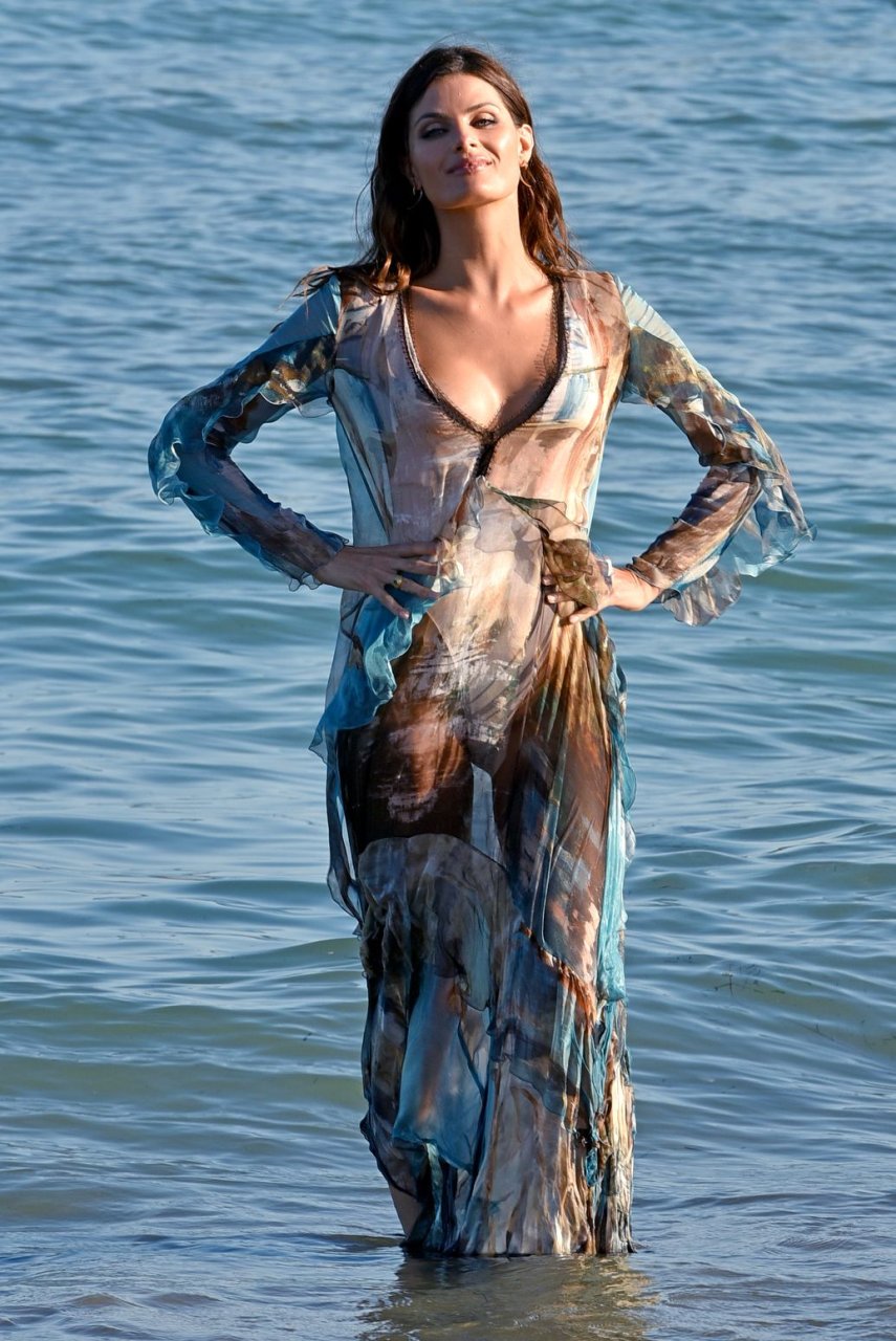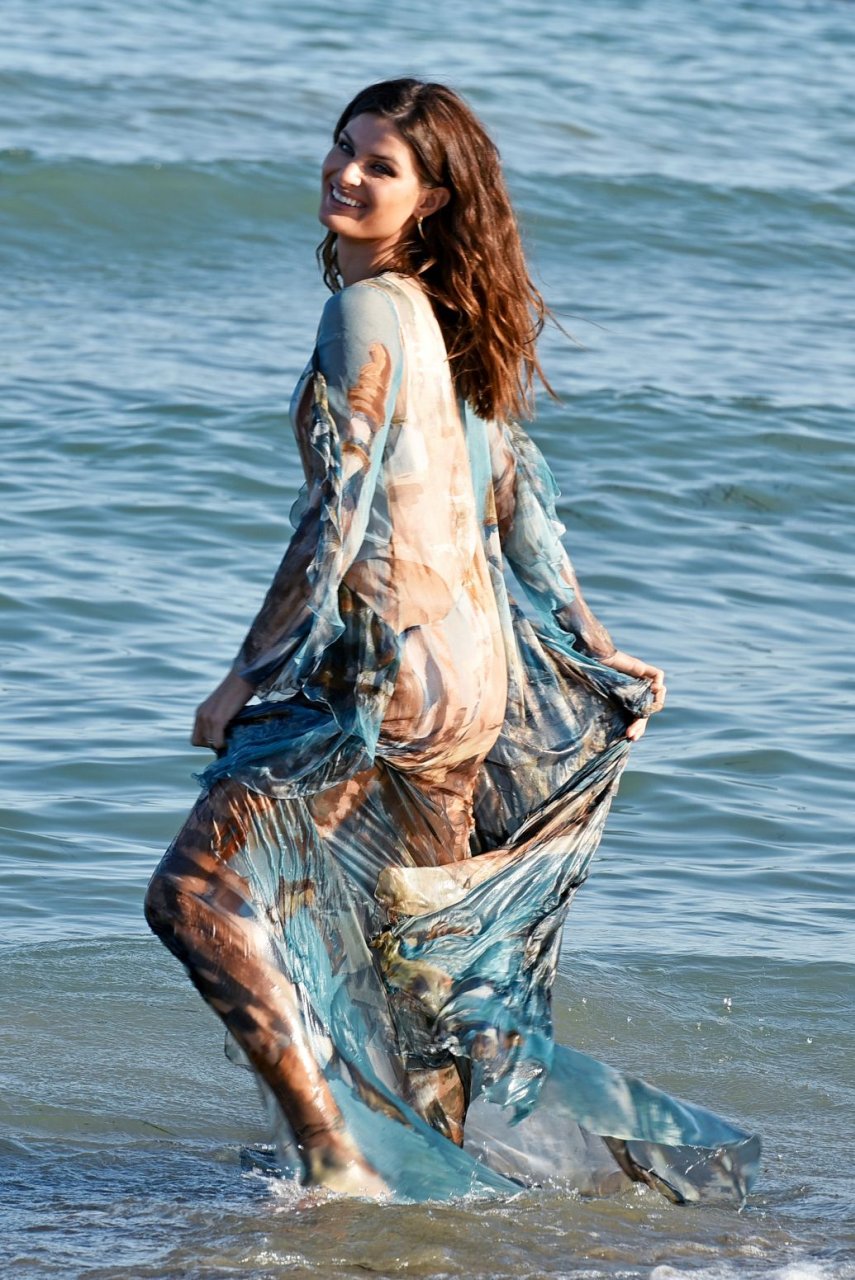 Модель Изабели Фонтана (34) без бюстгальтера позирует фотографам на пляже в Венеции, 29.08.2017.