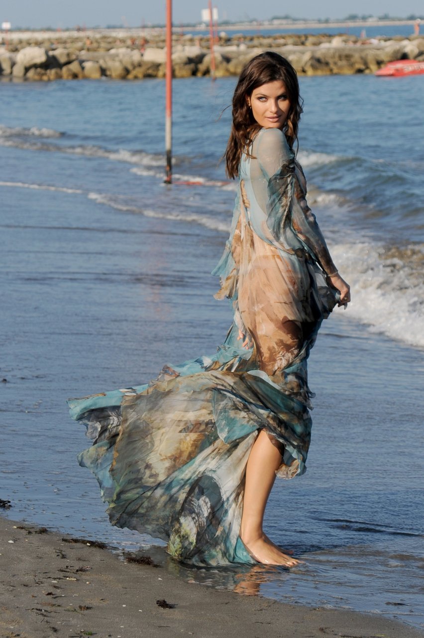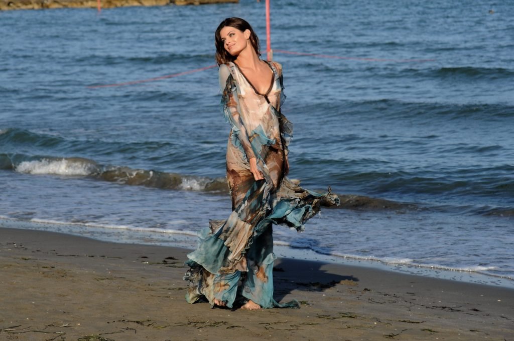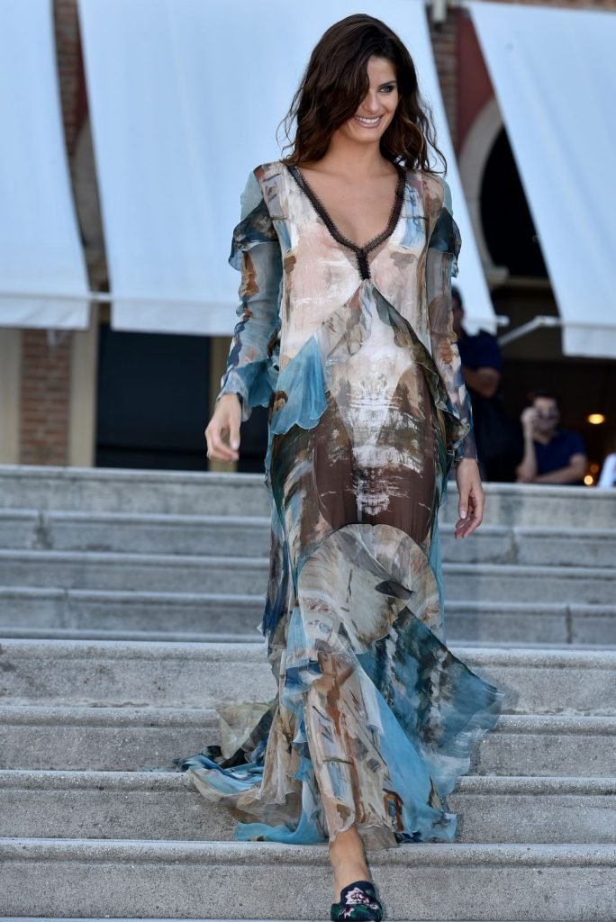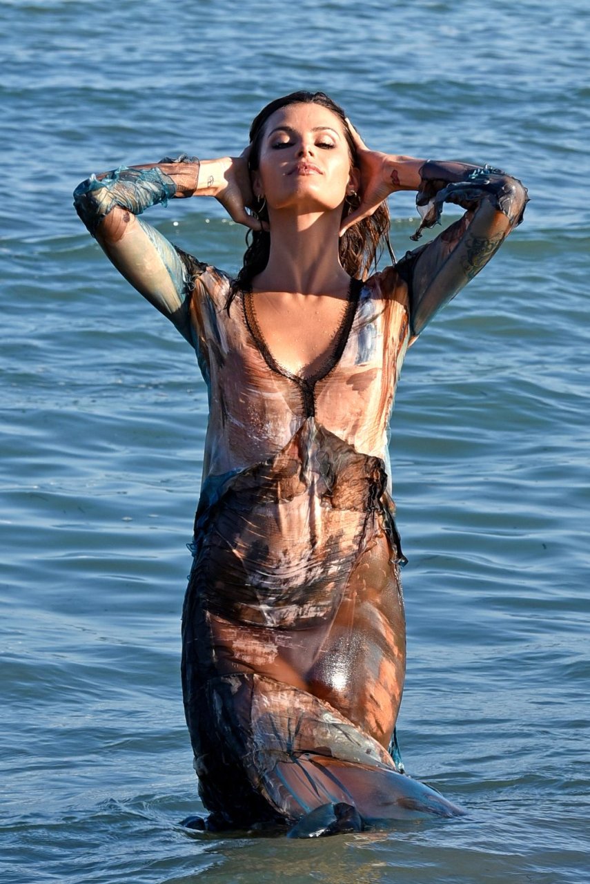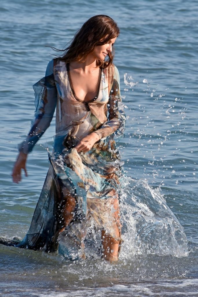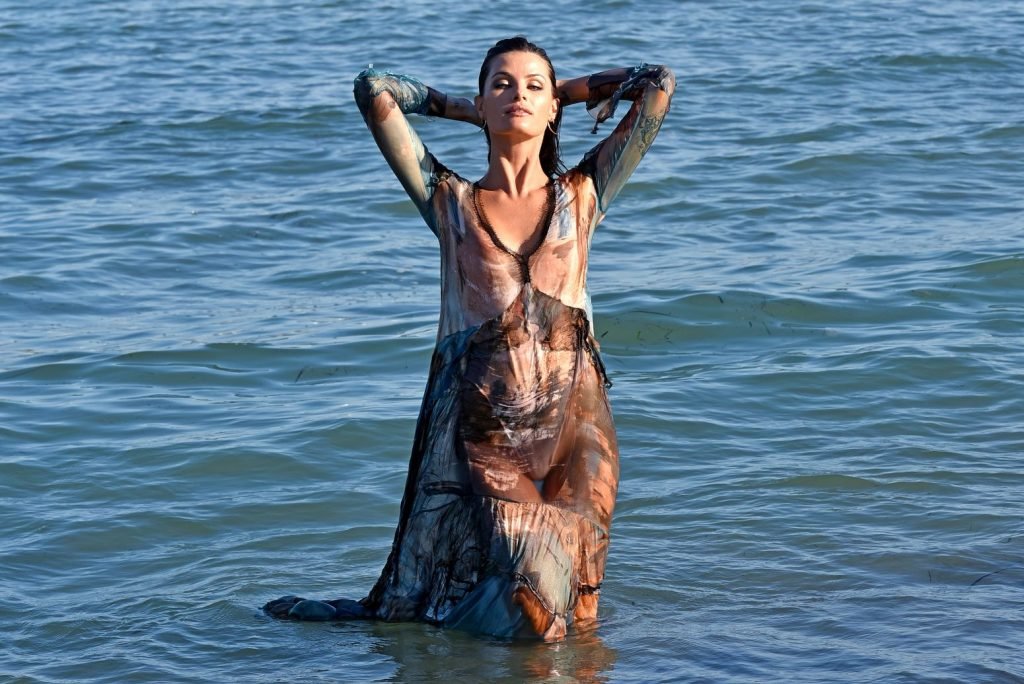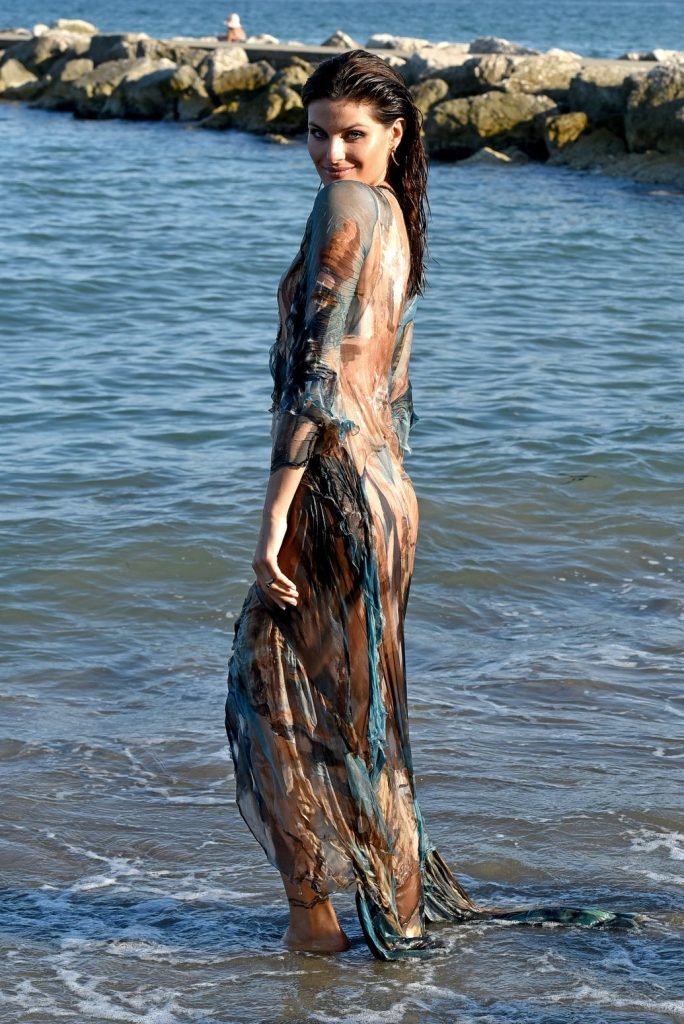 Модель Изабели Фонтана (34) без бюстгальтера позирует фотографам на пляже в Венеции, 29.08.2017.