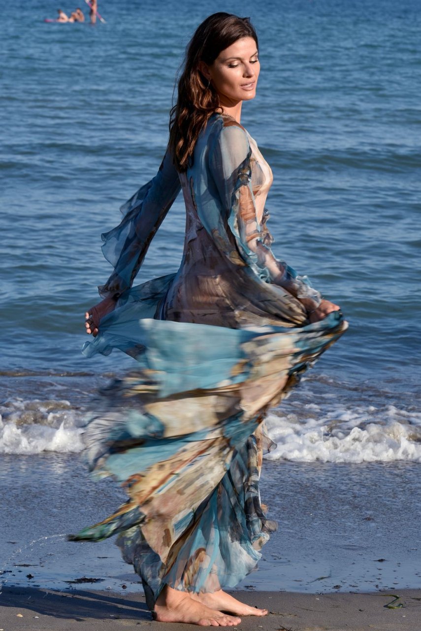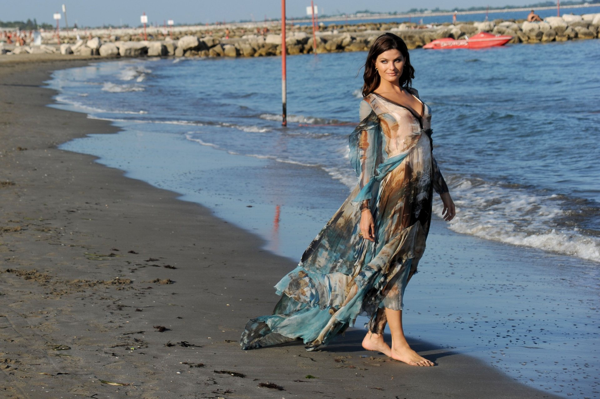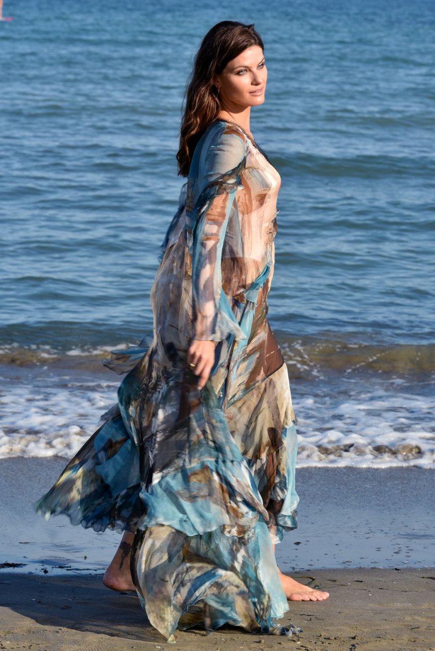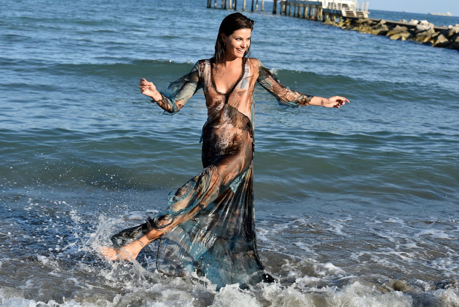 Модель Изабели Фонтана (34) без бюстгальтера позирует фотографам на пляже в Венеции, 29.08.2017.