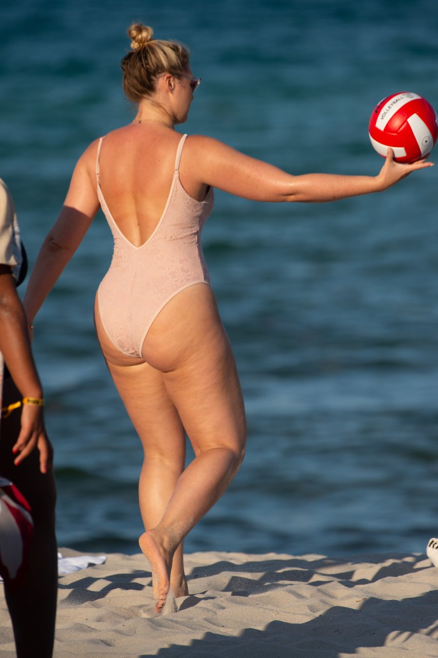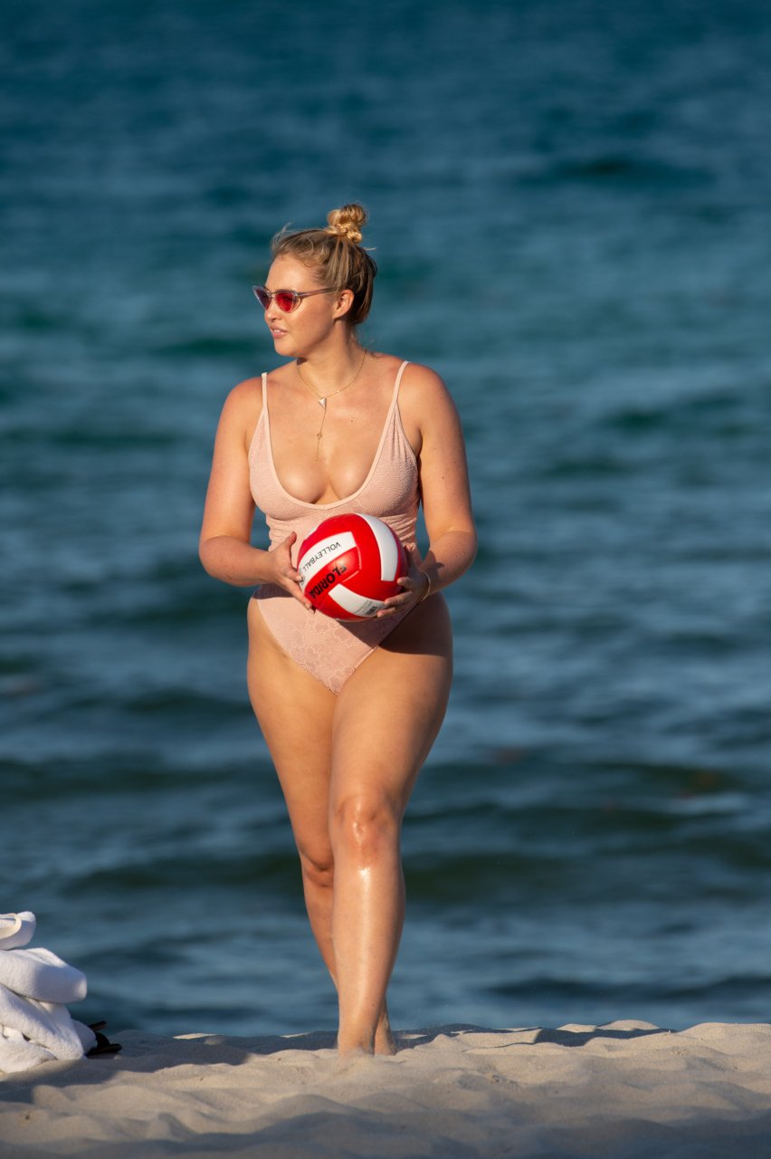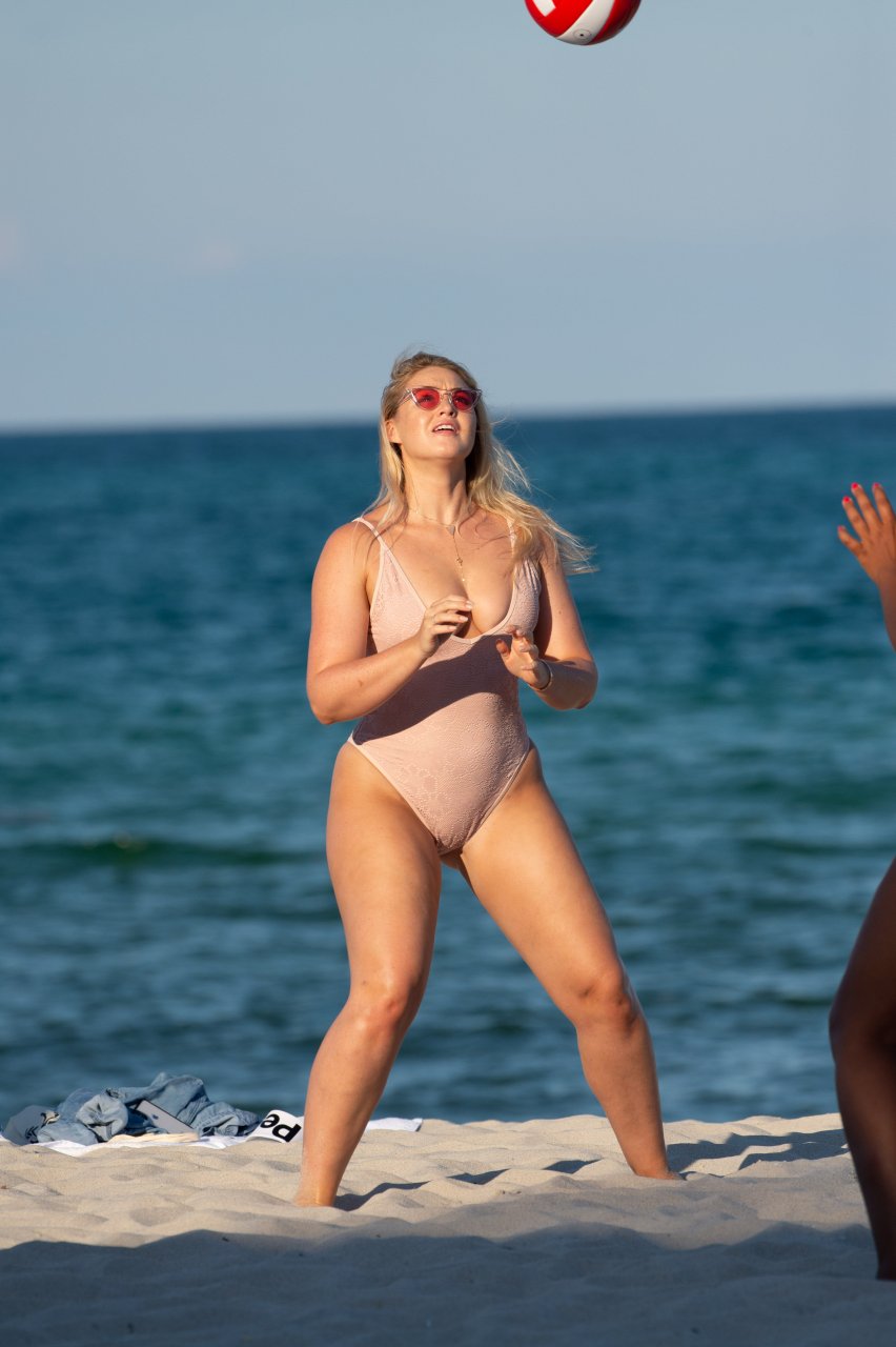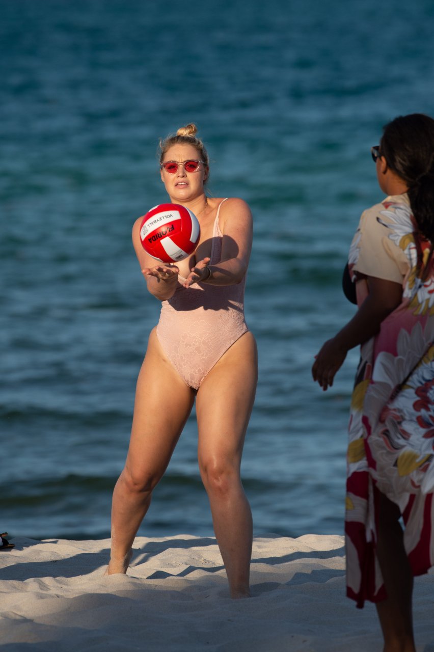 Модель Искра Лоренс (27) была замечена, наслаждаясь летним солнцем и игрой в волейбол в розовом цельном купальнике на Майами-Бич, 14.07.2018.