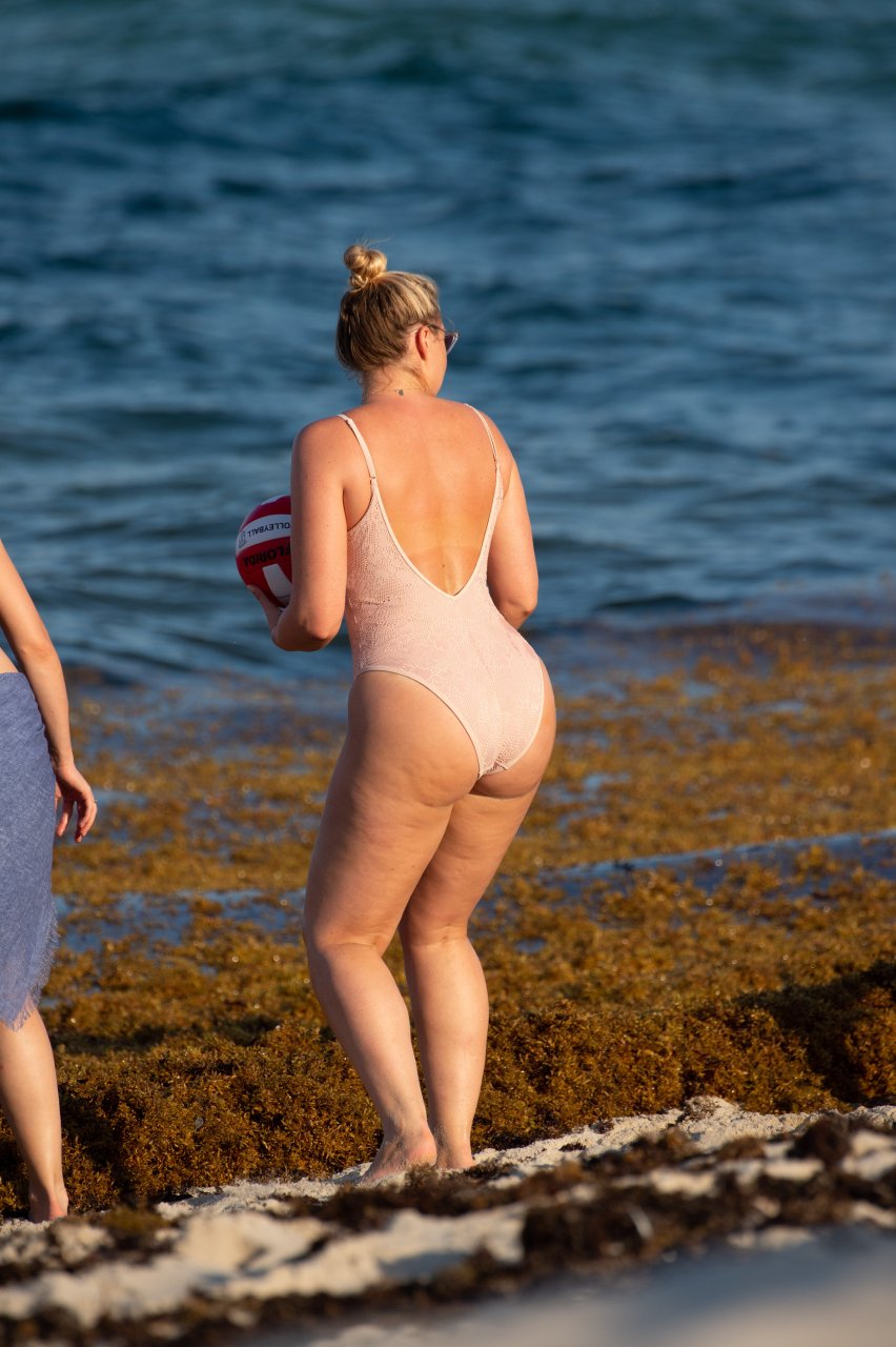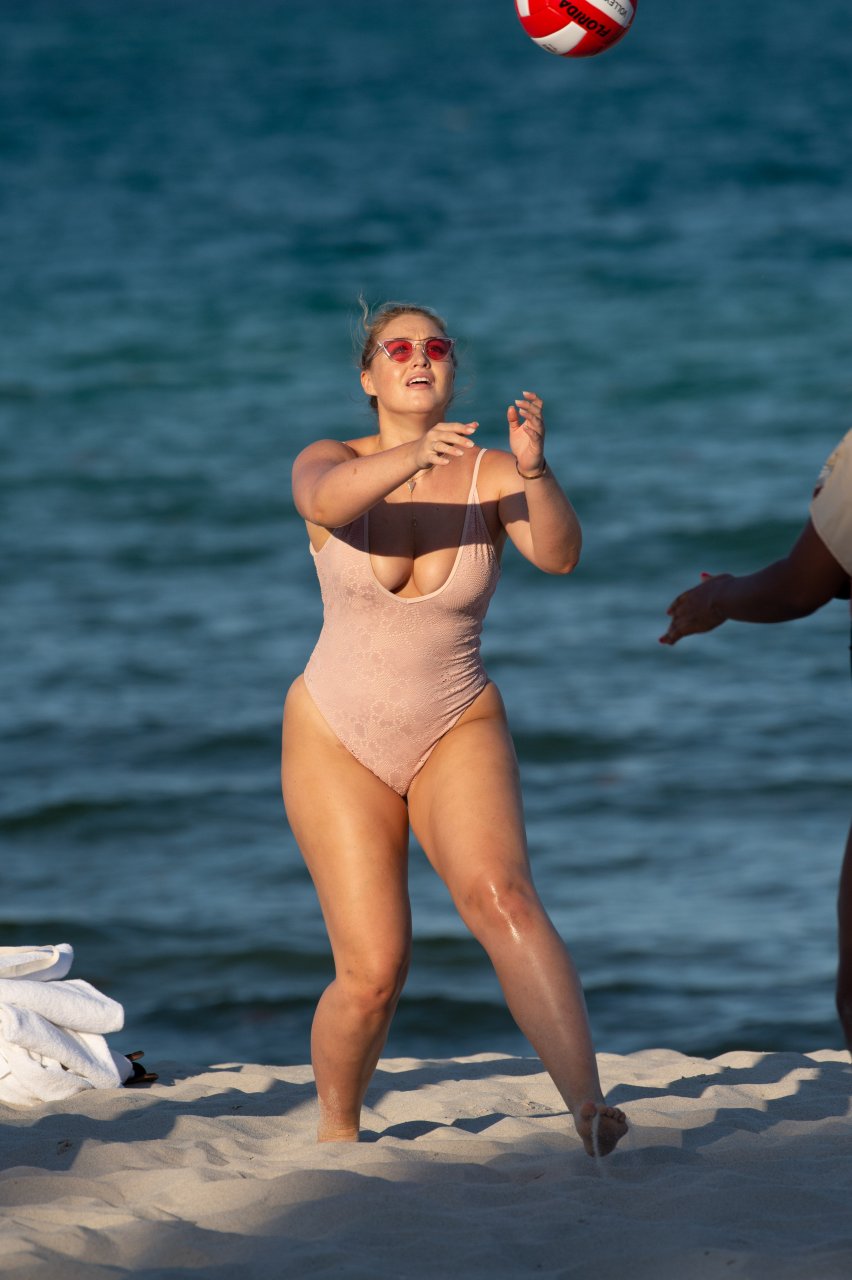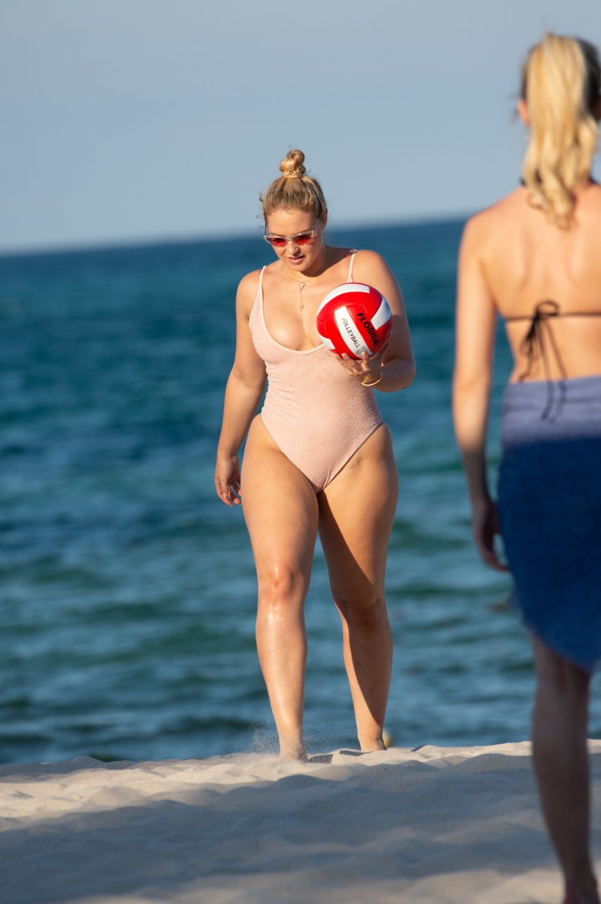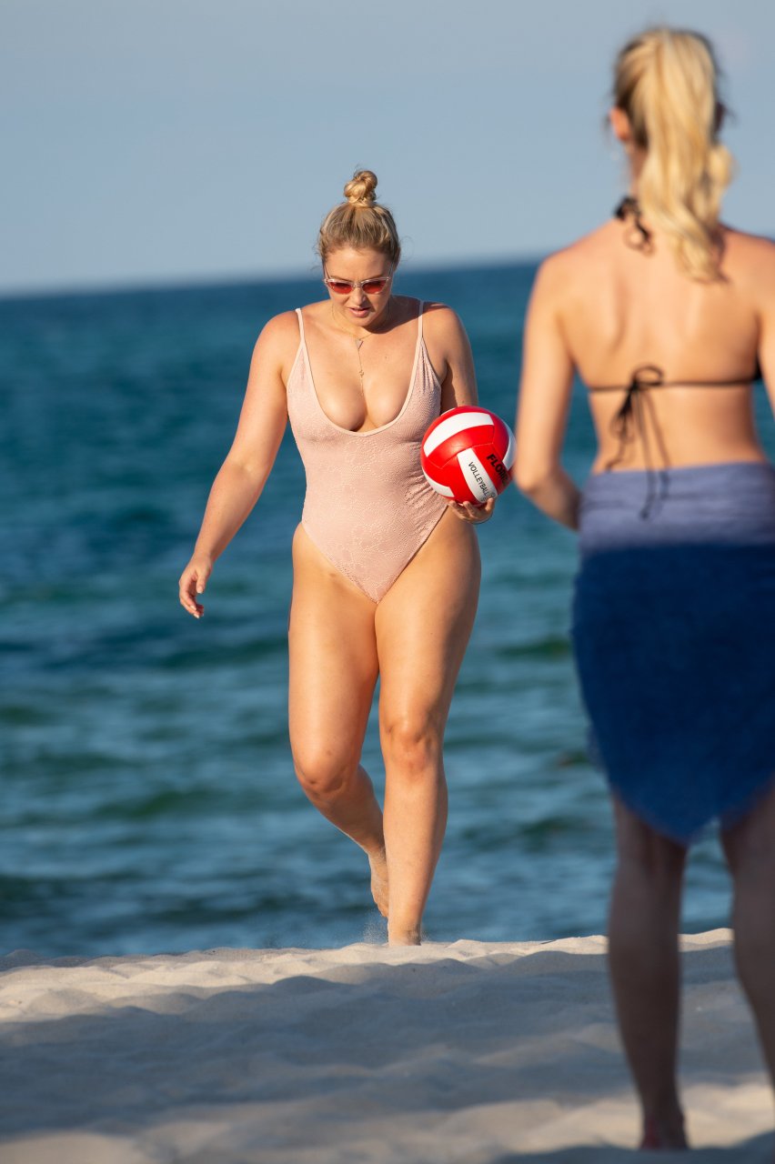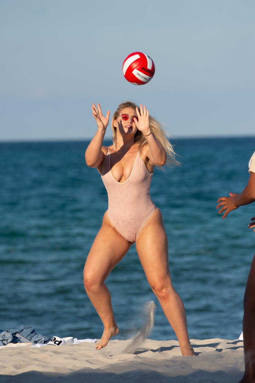 Модель Искра Лоренс (27) была замечена, наслаждаясь летним солнцем и игрой в волейбол в розовом цельном купальнике на Майами-Бич, 14.07.2018.