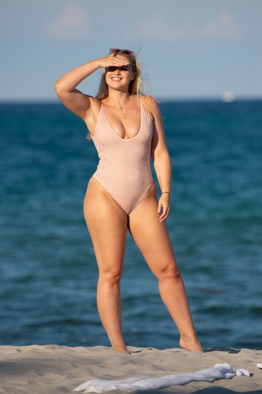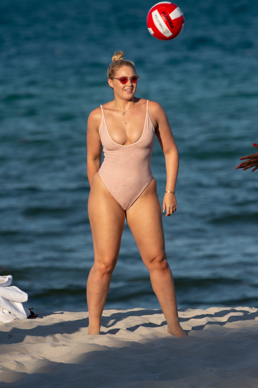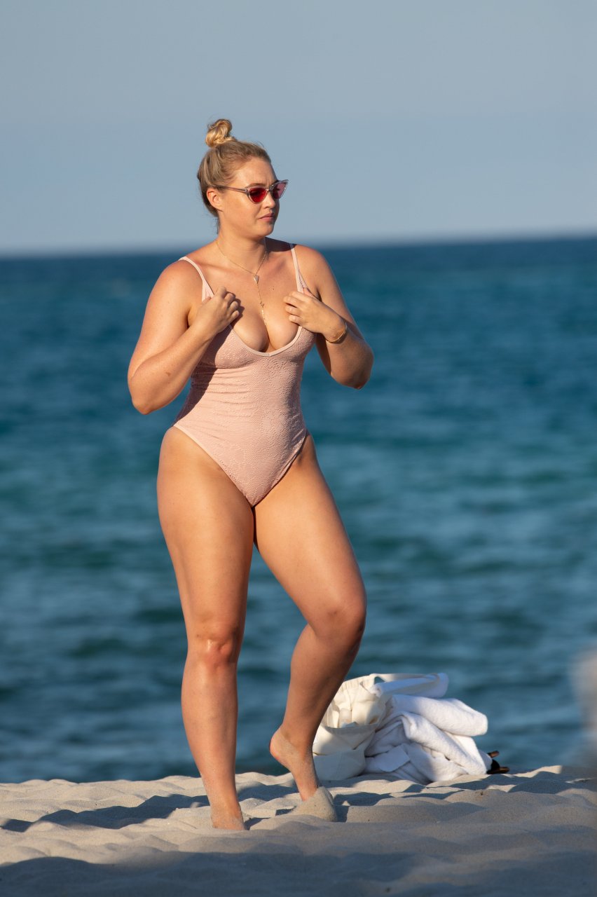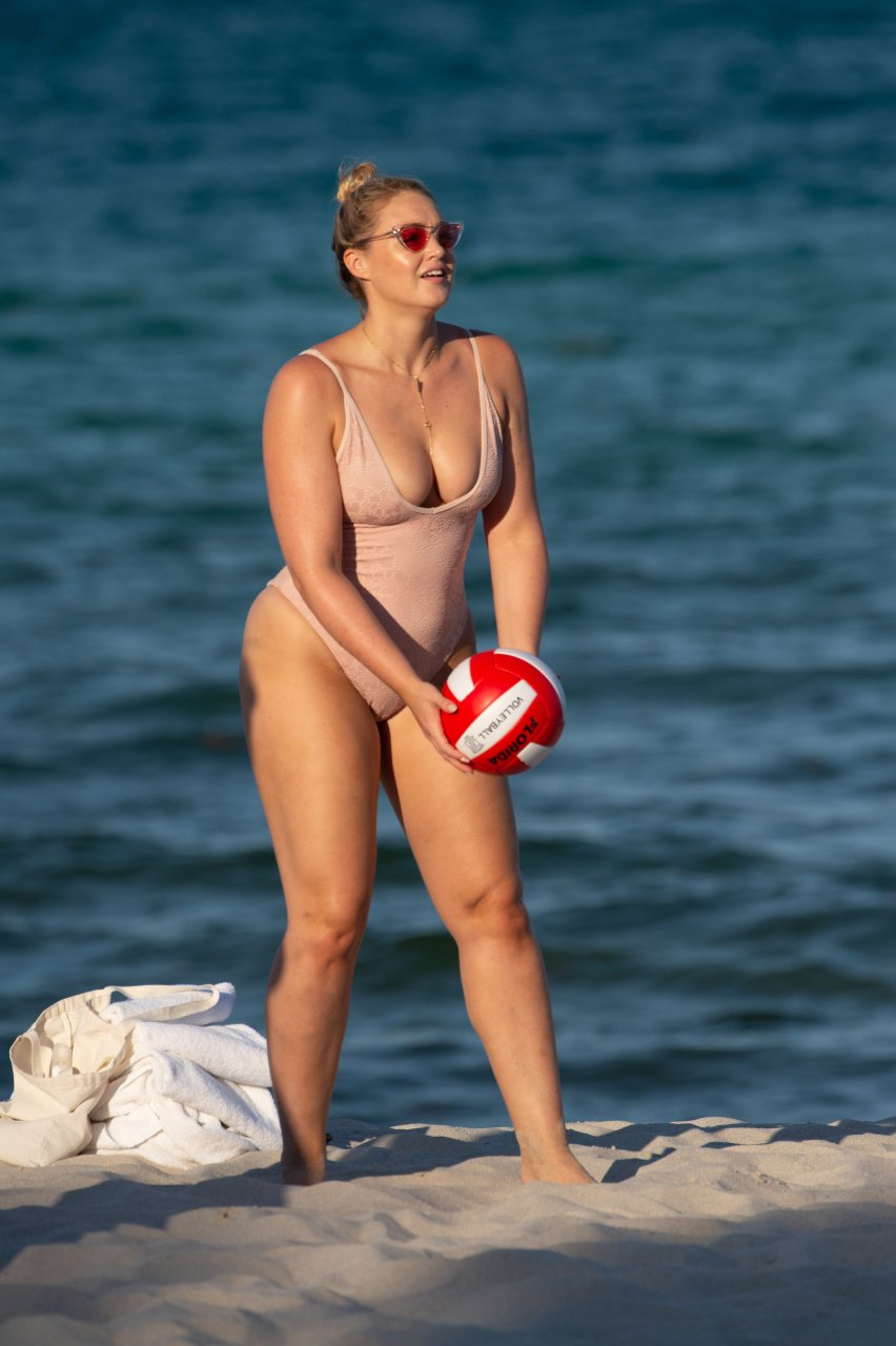 Модель Искра Лоренс (27) была замечена, наслаждаясь летним солнцем и игрой в волейбол в розовом цельном купальнике на Майами-Бич, 14.07.2018.