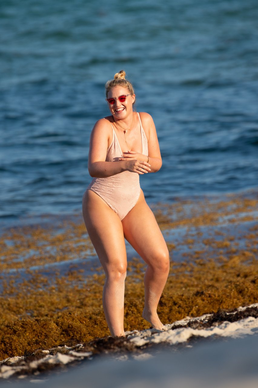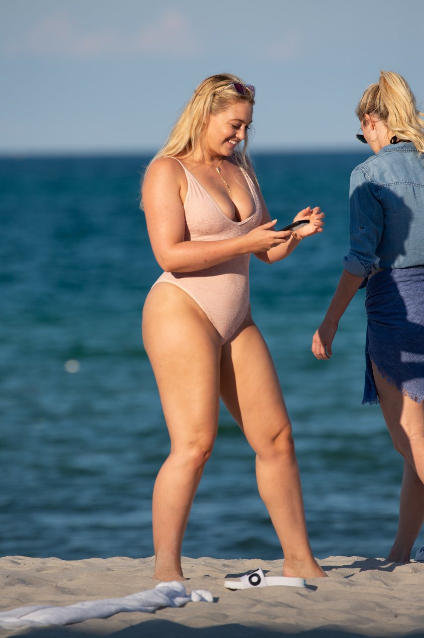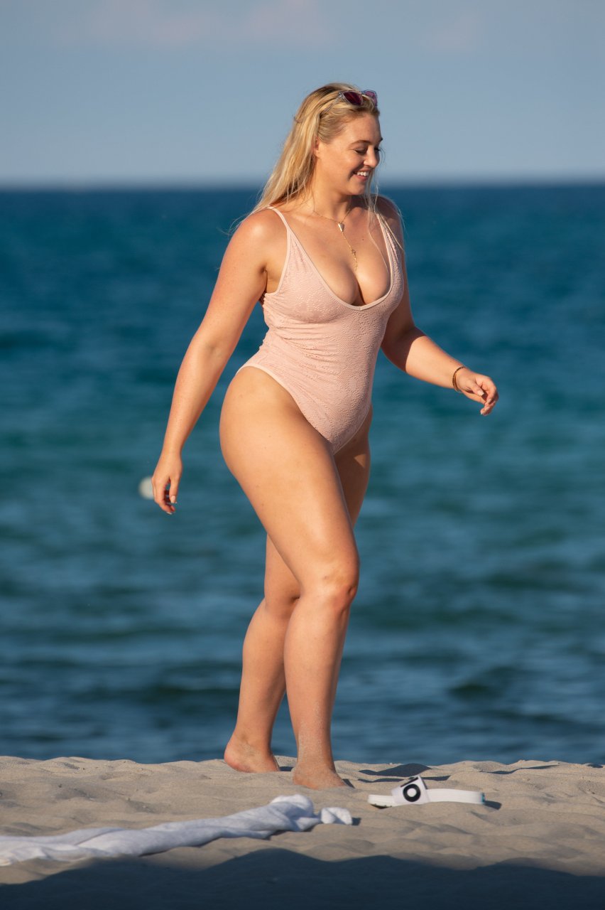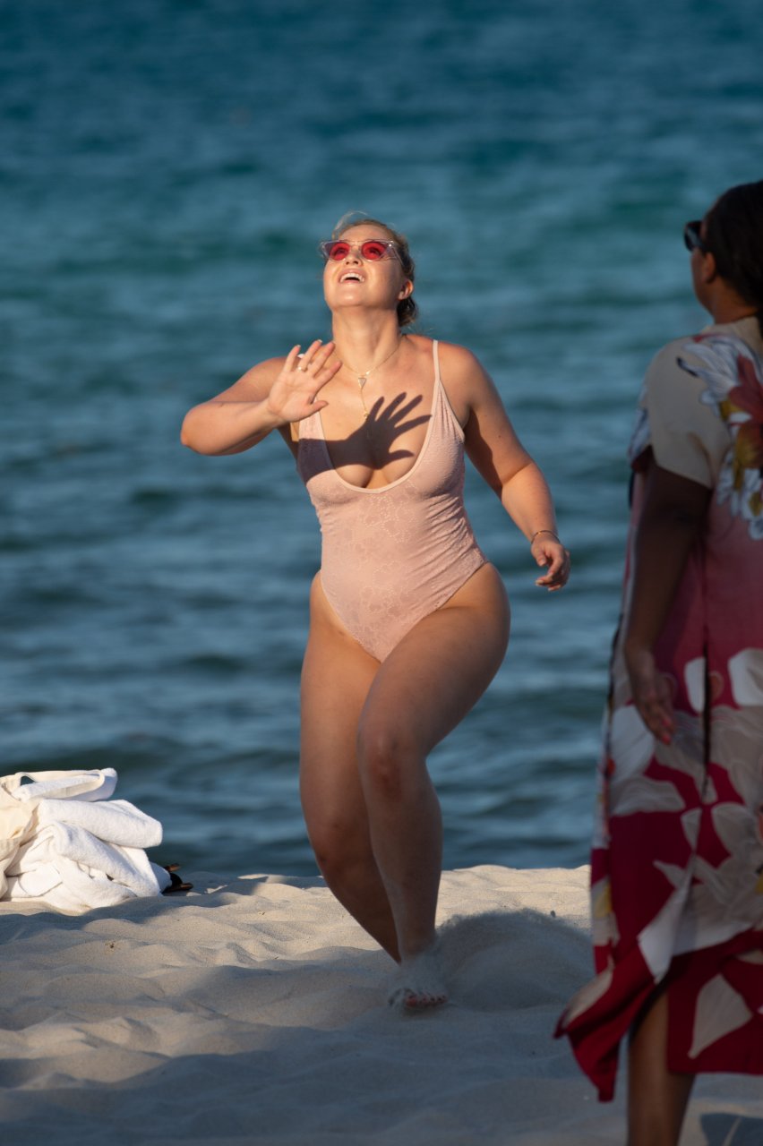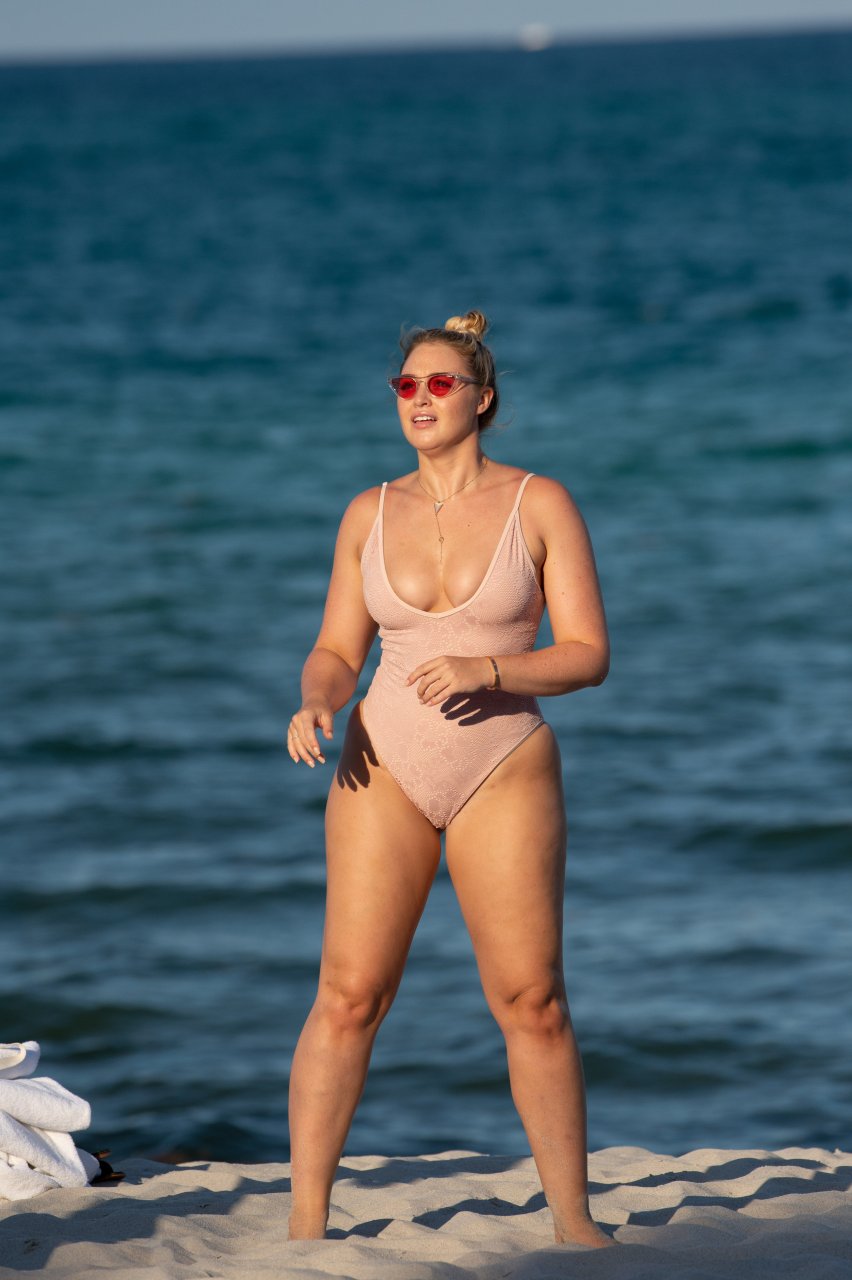 Модель Искра Лоренс (27) была замечена, наслаждаясь летним солнцем и игрой в волейбол в розовом цельном купальнике на Майами-Бич, 14.07.2018.
