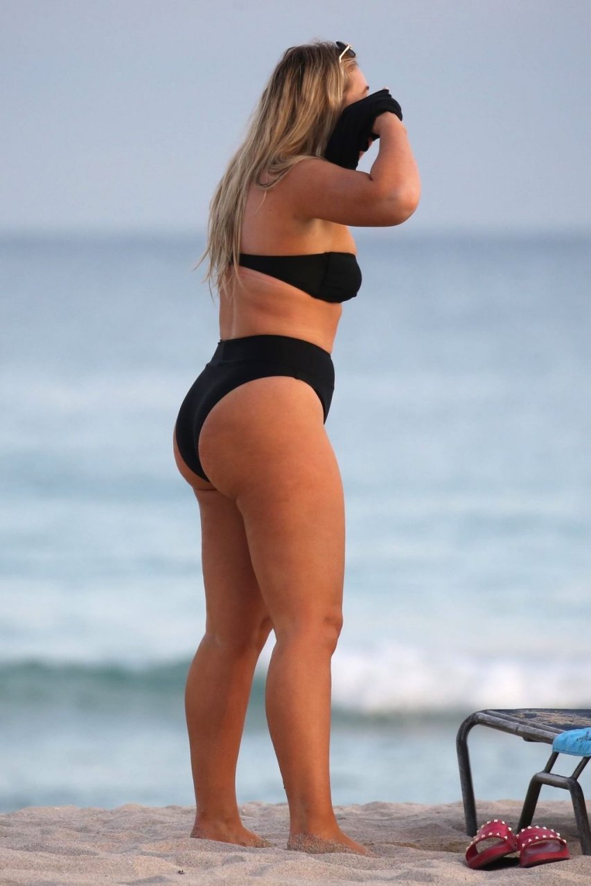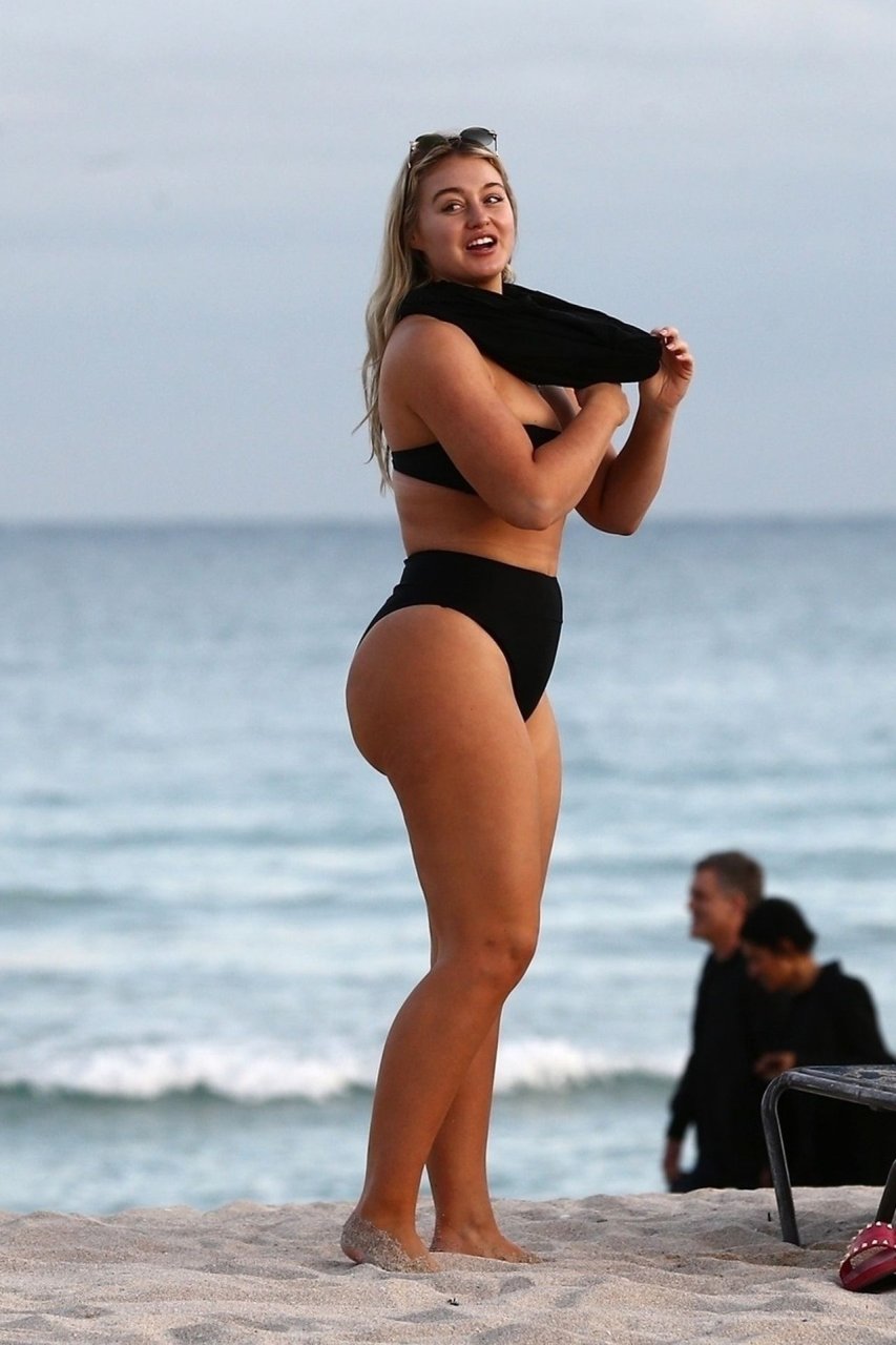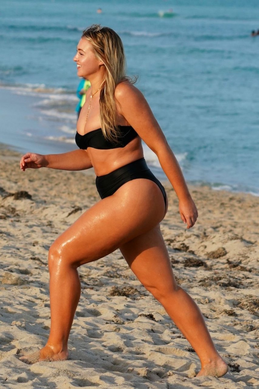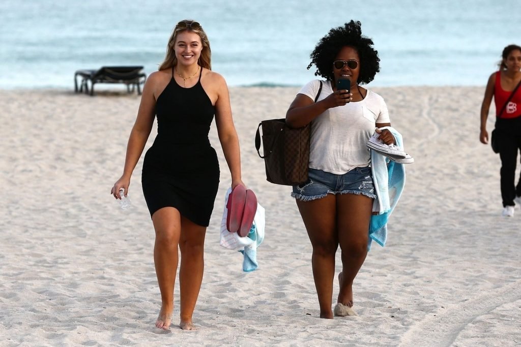Iskra Lawrence демонстрирует свою фигуру, наслаждаясь очередным днем на пляже в Майами, 12/09/2018. Плюс-сайз модель была замечена с друзьями, когда она укрывается после дня на пляже и направляется обратно в отель.
