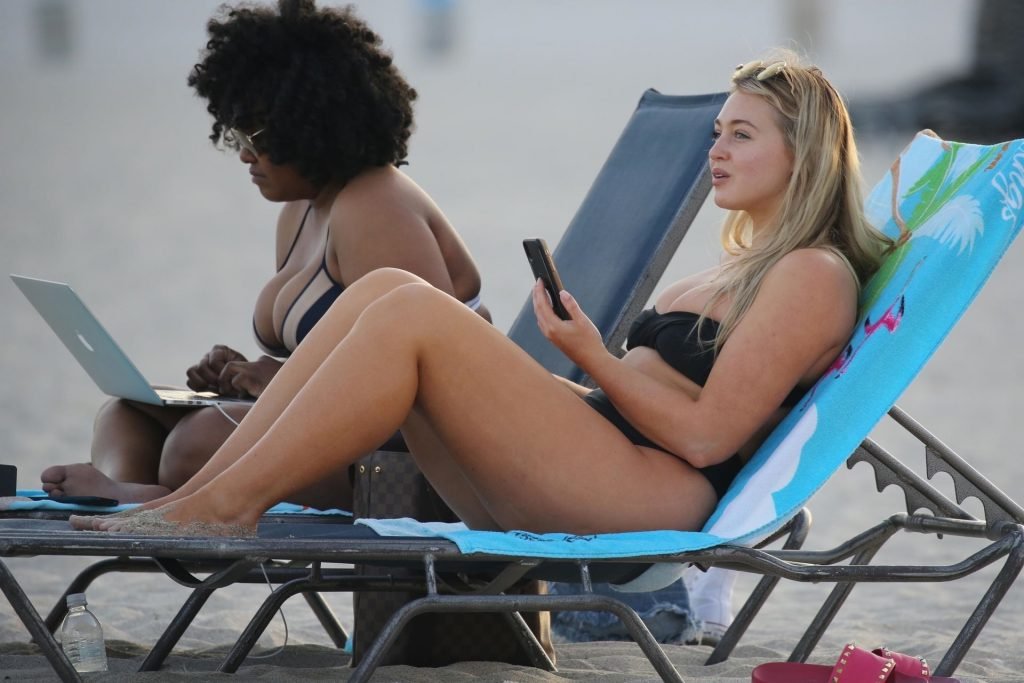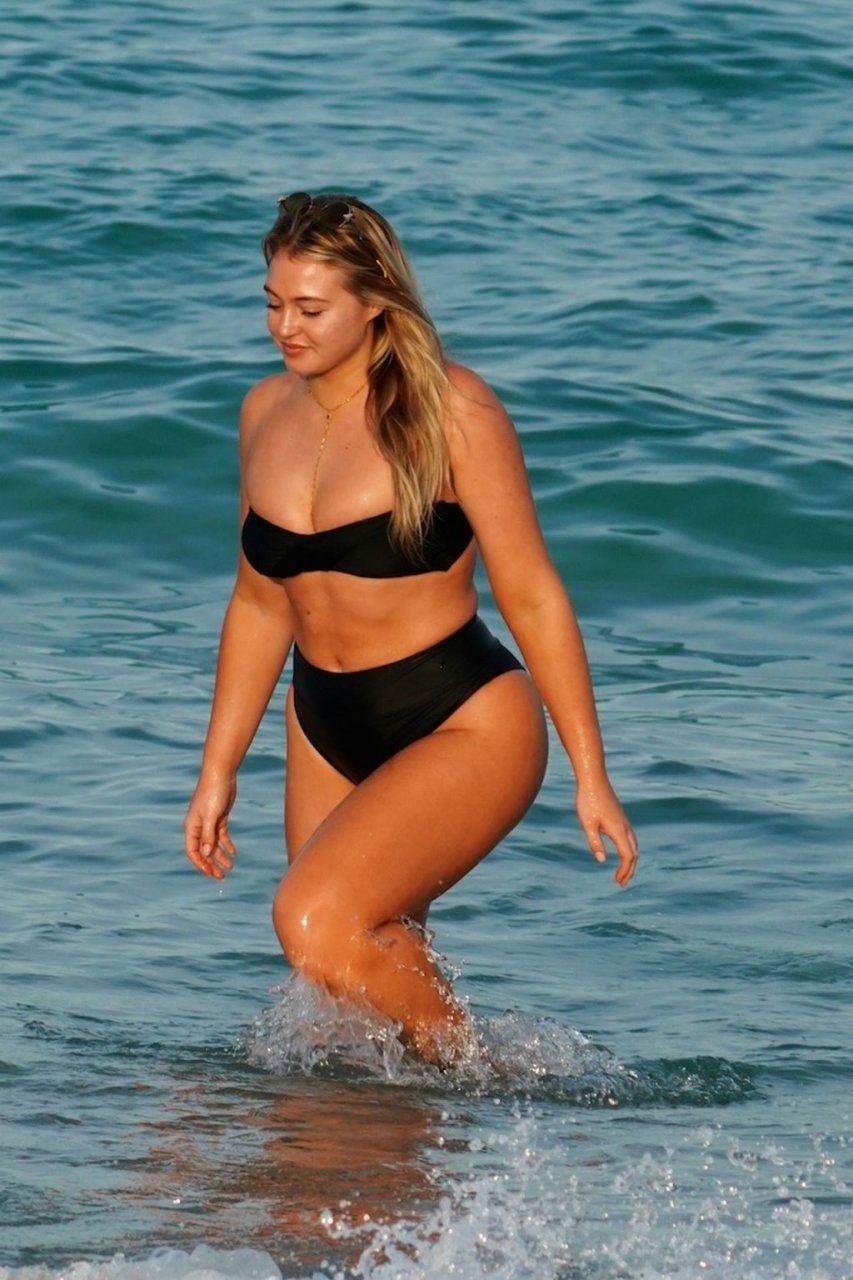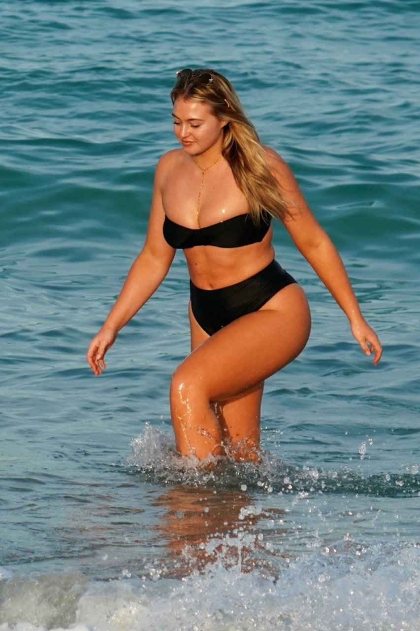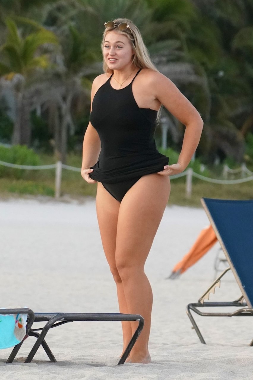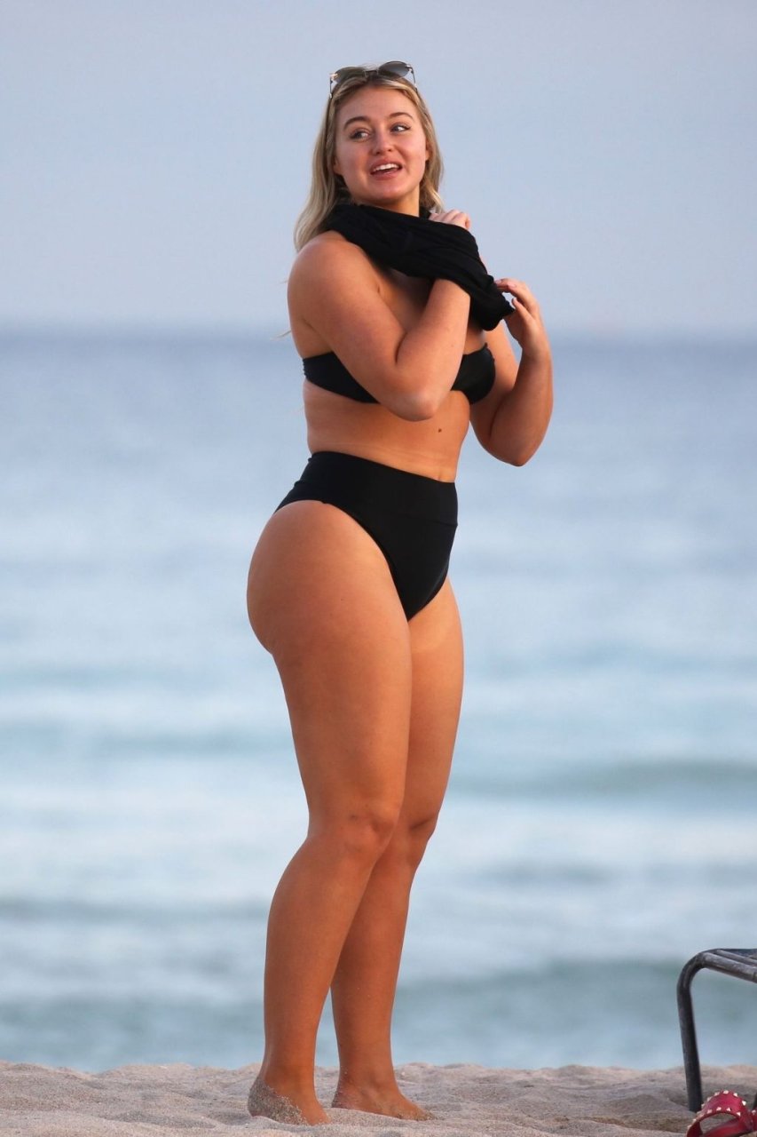 Iskra Lawrence демонстрирует свою фигуру, наслаждаясь очередным днем на пляже в Майами, 12/09/2018. Плюс-сайз модель была замечена с друзьями, когда она укрывается после дня на пляже и направляется обратно в отель.