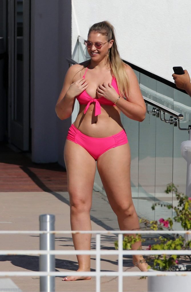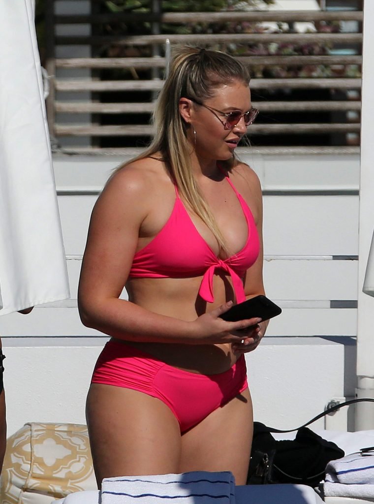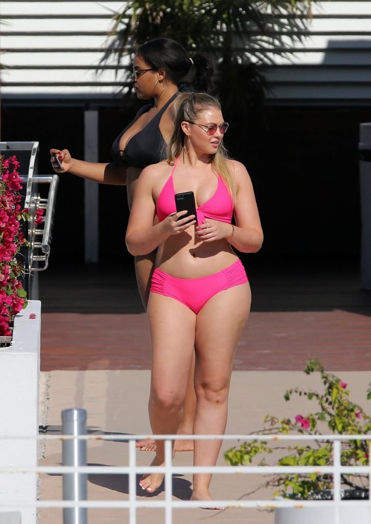 Модель Искра Лоуренс (27) наслаждается днем в розовом бикини с друзьями в Майами, 12/12/2017.