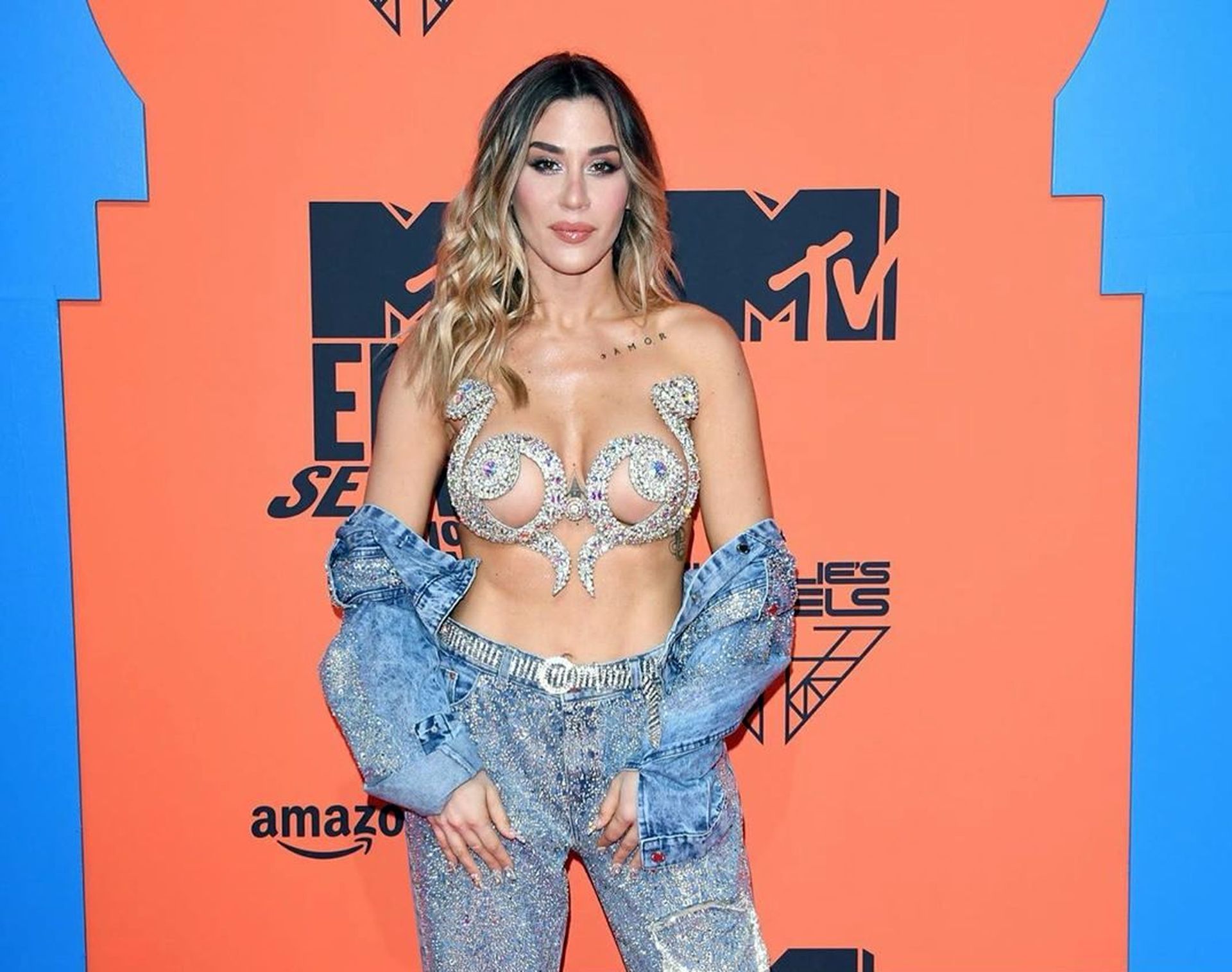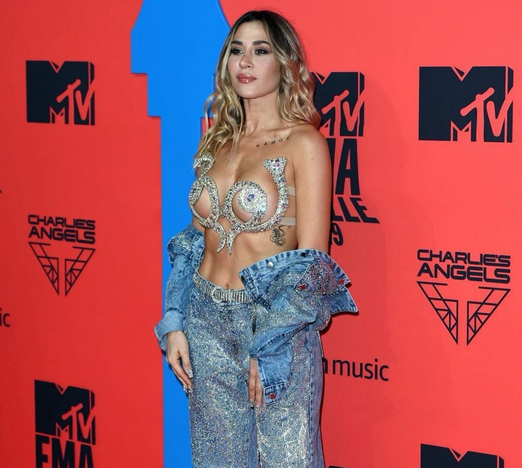 J Mena позирует на красной дорожке, прибывая на церемонию MTV Europe Music Awards 2019 в Конференц-центре и выставочном комплексе FIBES в Севилье, Испания, 3 ноября 2019 года. Она продемонстрировала свои груди, надев интересный бюстгальтер. Химена Барон (известная как J Mena) — аргентинская актриса и певица. Она сестра актера Федерико Барона.