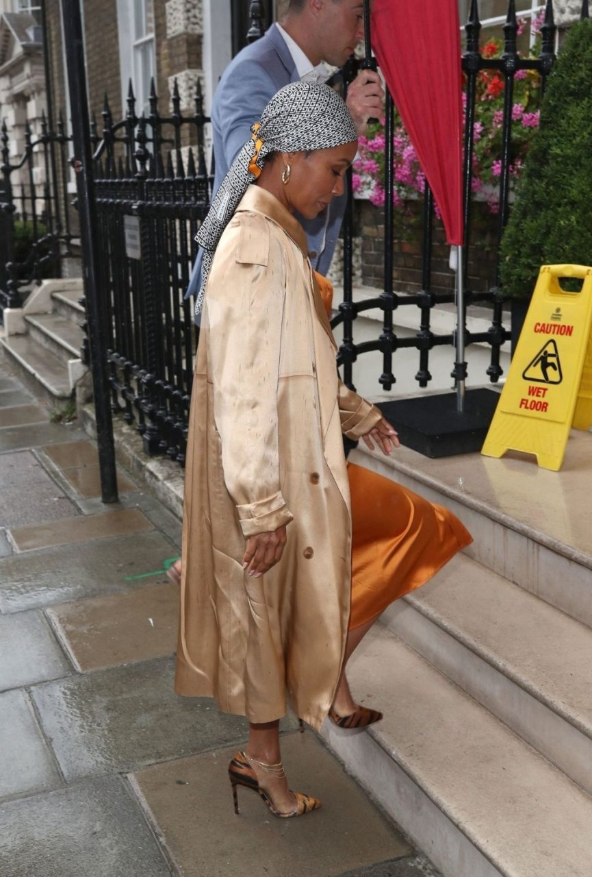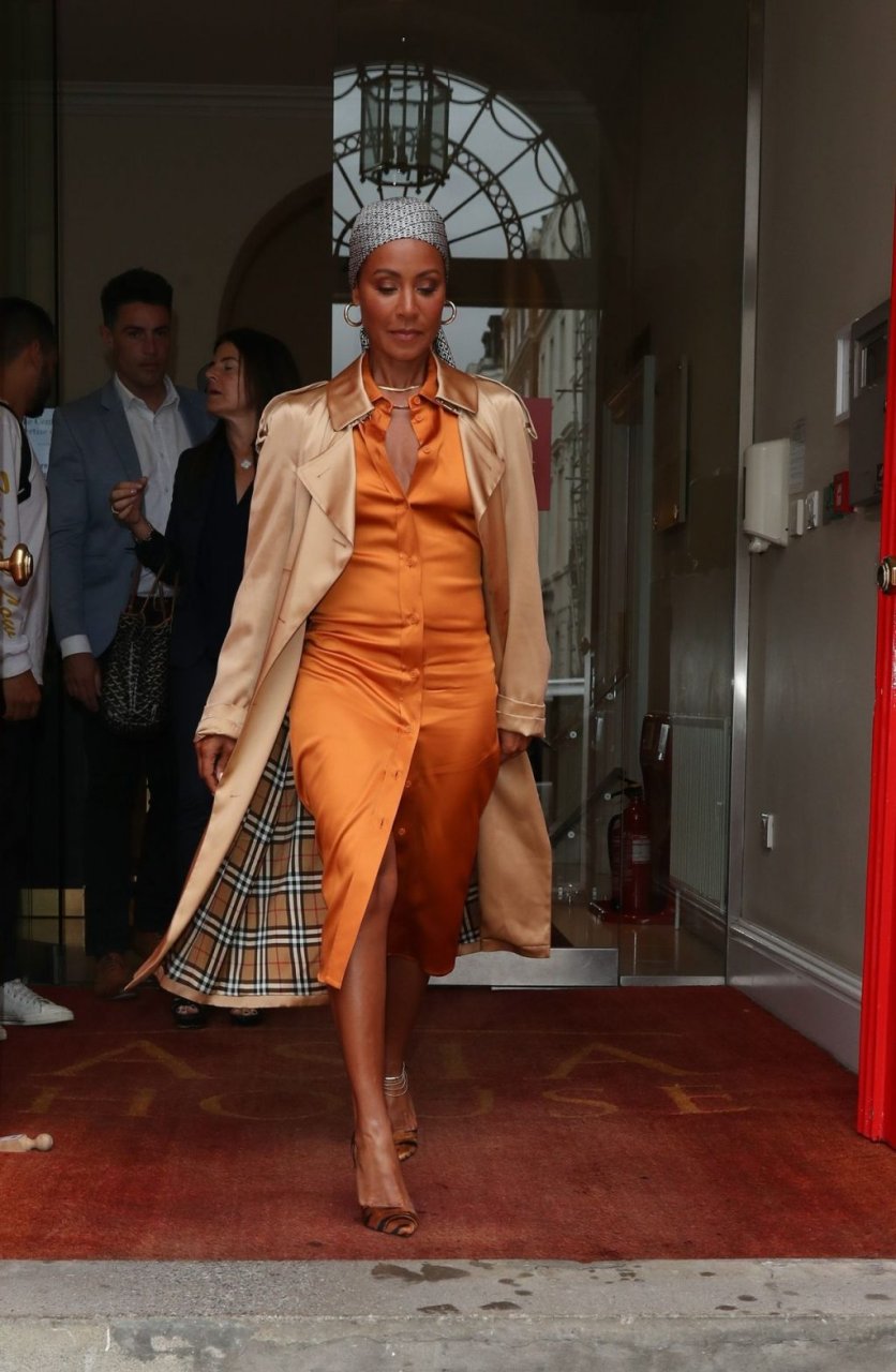 Американская актриса Джада Пинкетт Смит прибывает в Asia House в бежевом тренч-коте в Лондоне, 30.07.2019.
