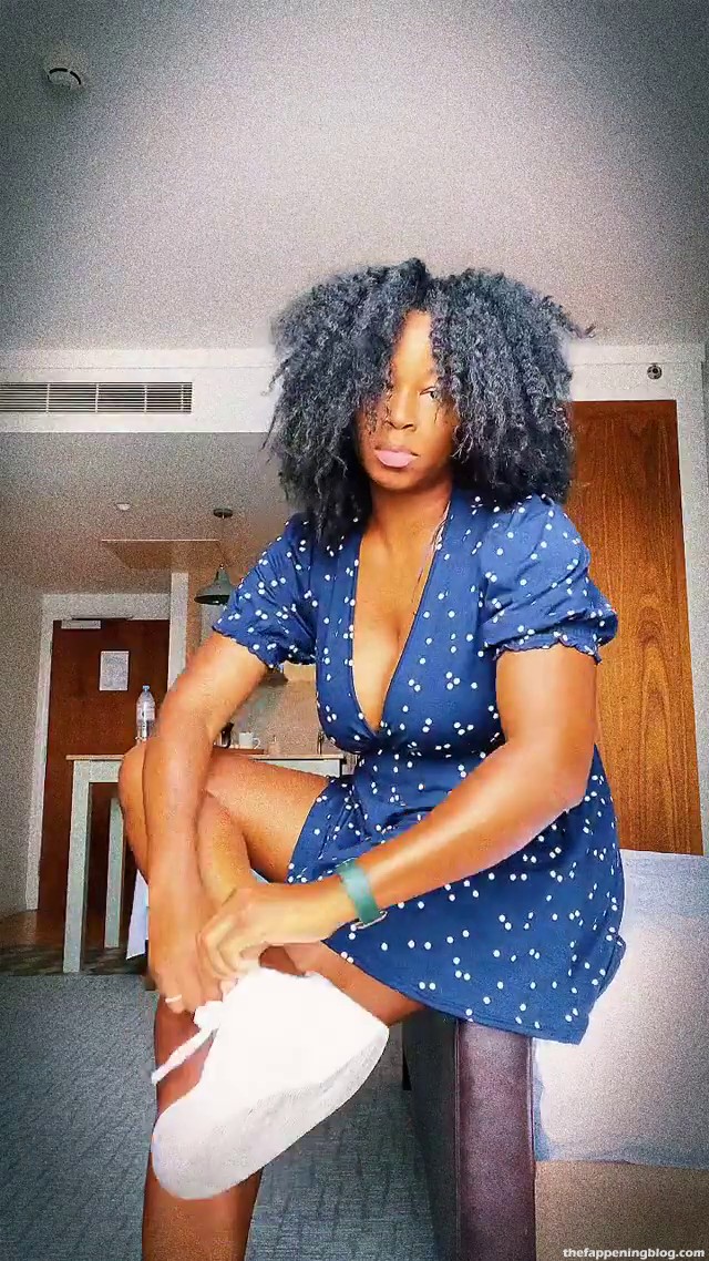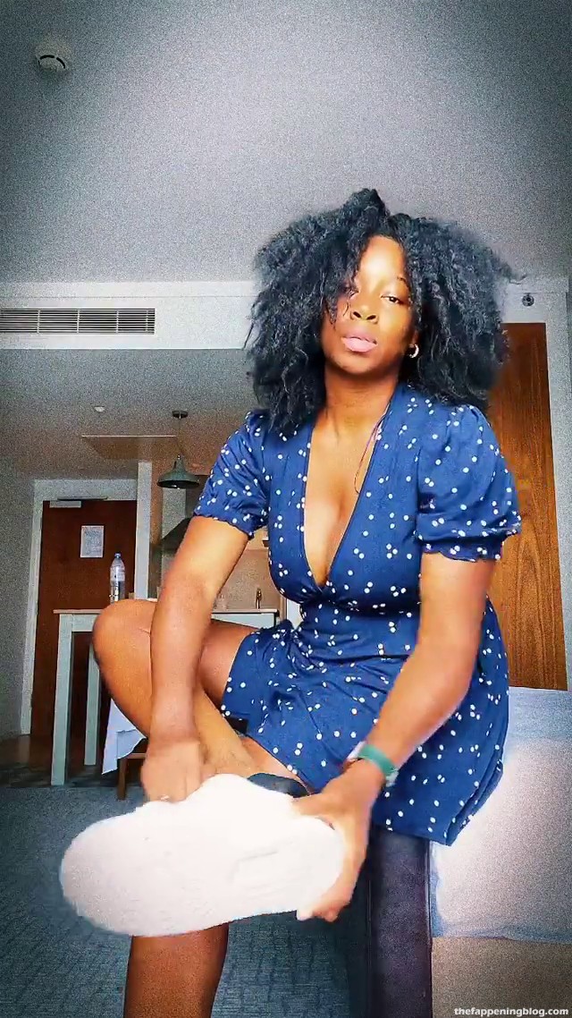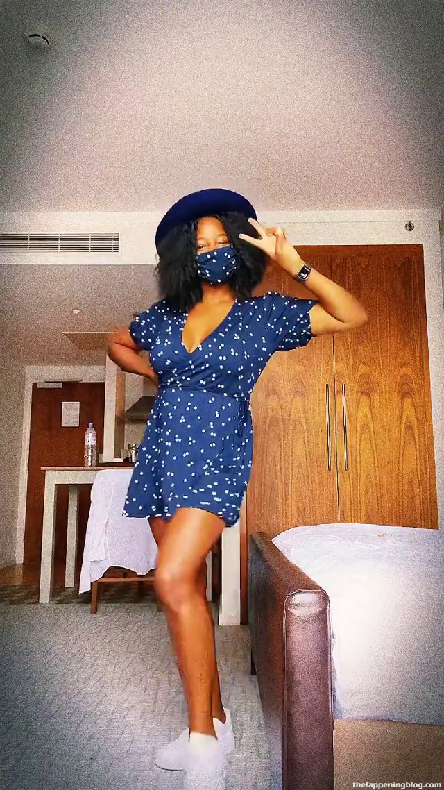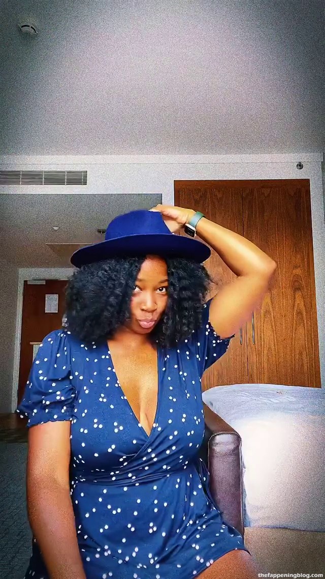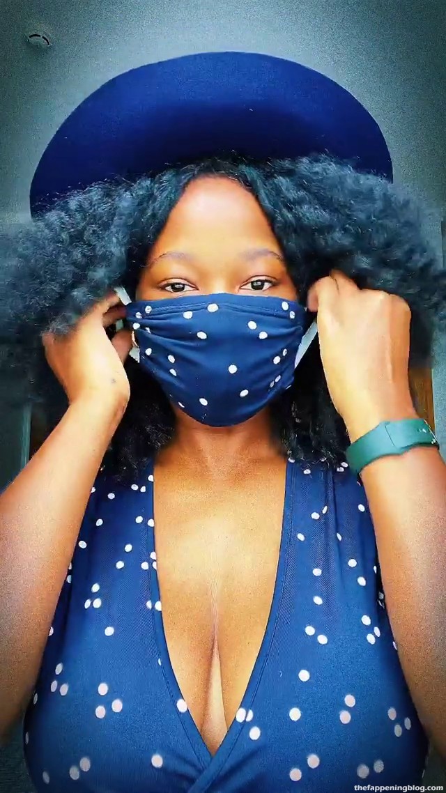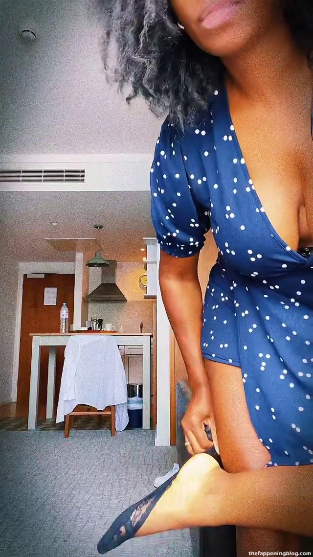 Певица, телеведущая и актриса Джемелия Нила Дэвис демонстрирует свои груди в новом видео в социальных сетях ниже (июнь 2021). Она показывает свои сексуальные ноги, красивое декольте и соски, надевая прозрачное белье и синее платье.