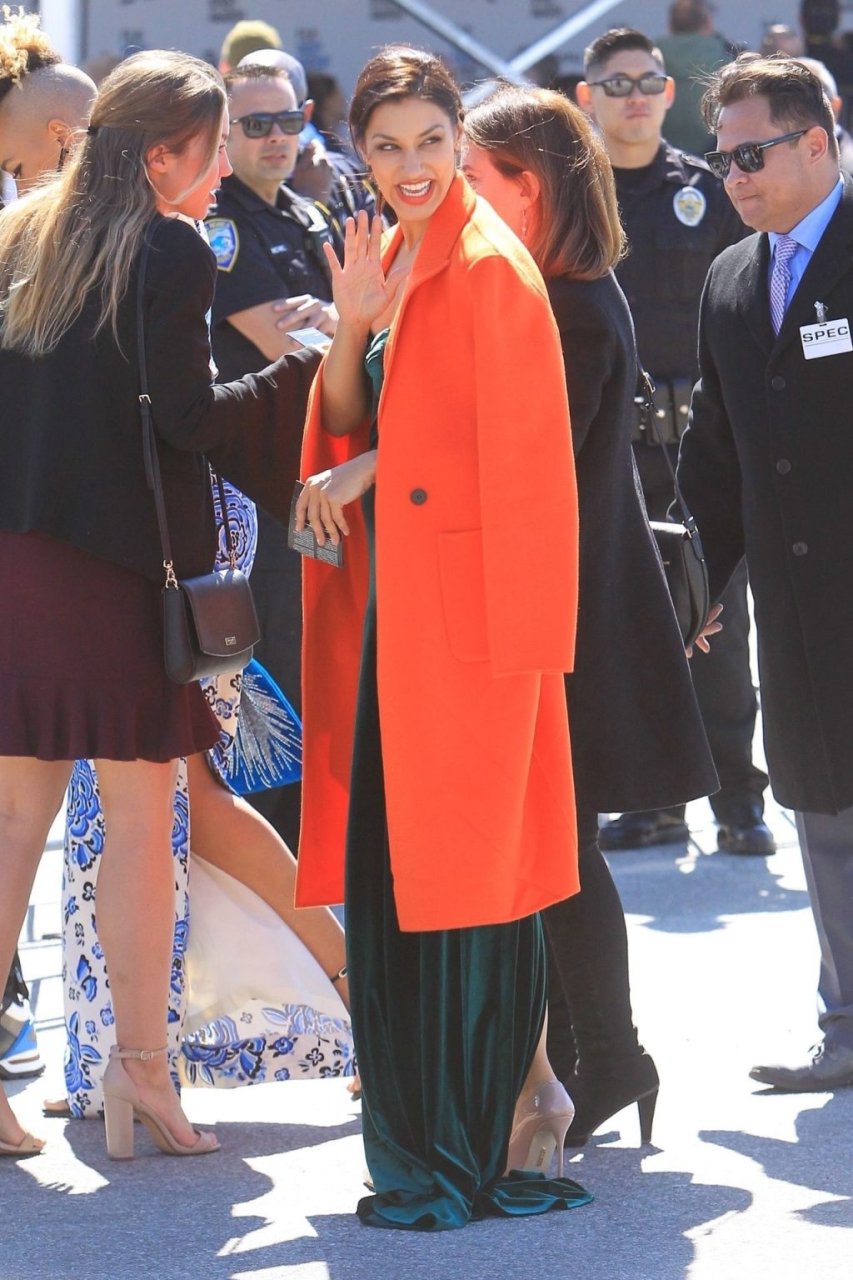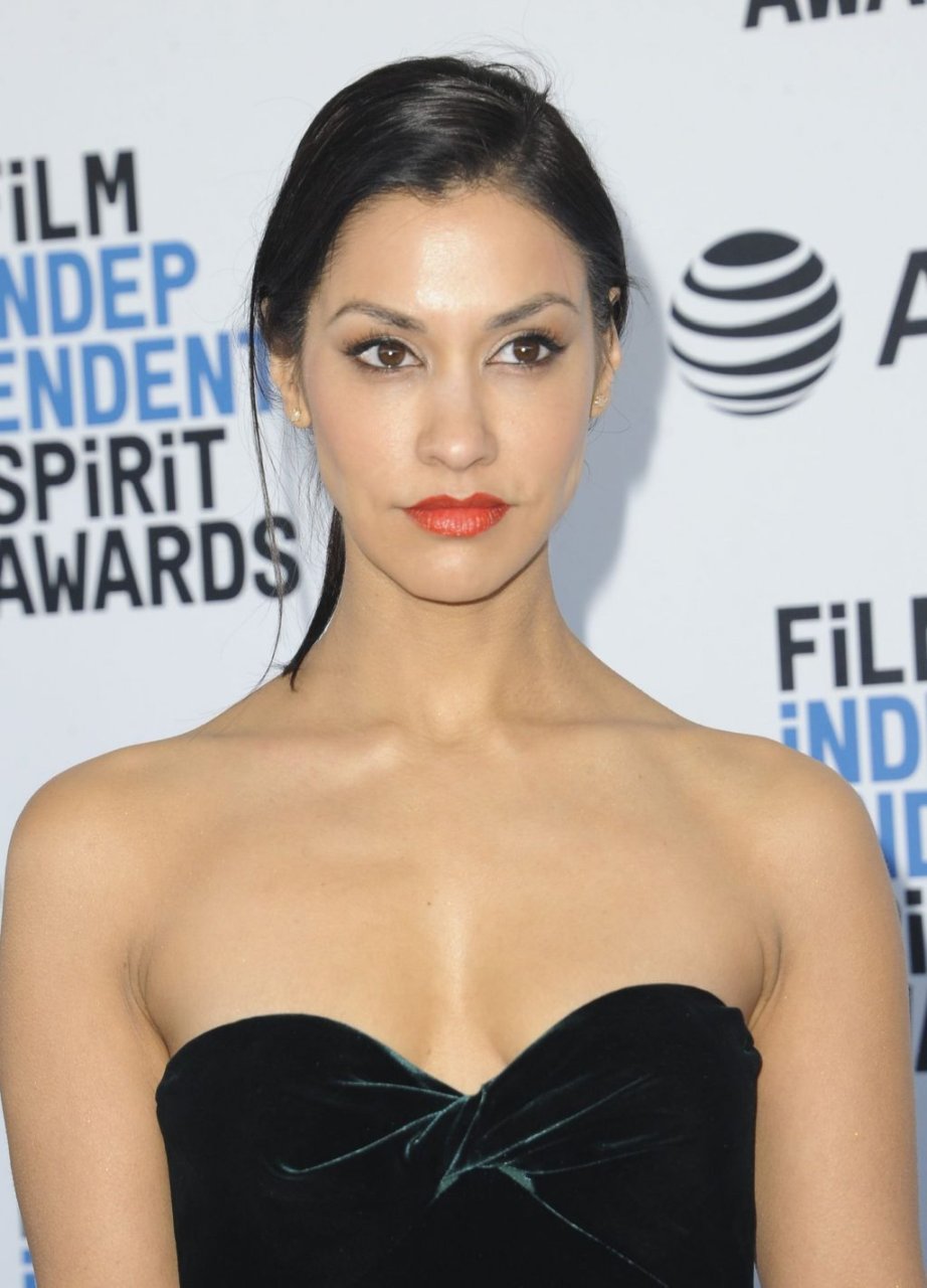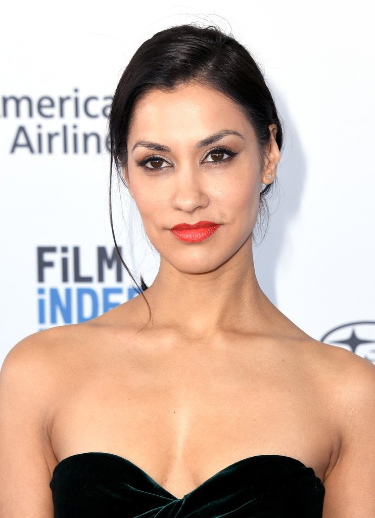 Янина Гаванкар в Санта-Монике на церемонии Independent Spirit Awards, которую вела Обри Плаза, 23.02.2019. 38-летняя актриса надела яркое неоново-оранжевое пальто поверх атласного темно-зеленого платья. Янина выбрала туфли нюдового цвета, чтобы завершить образ.