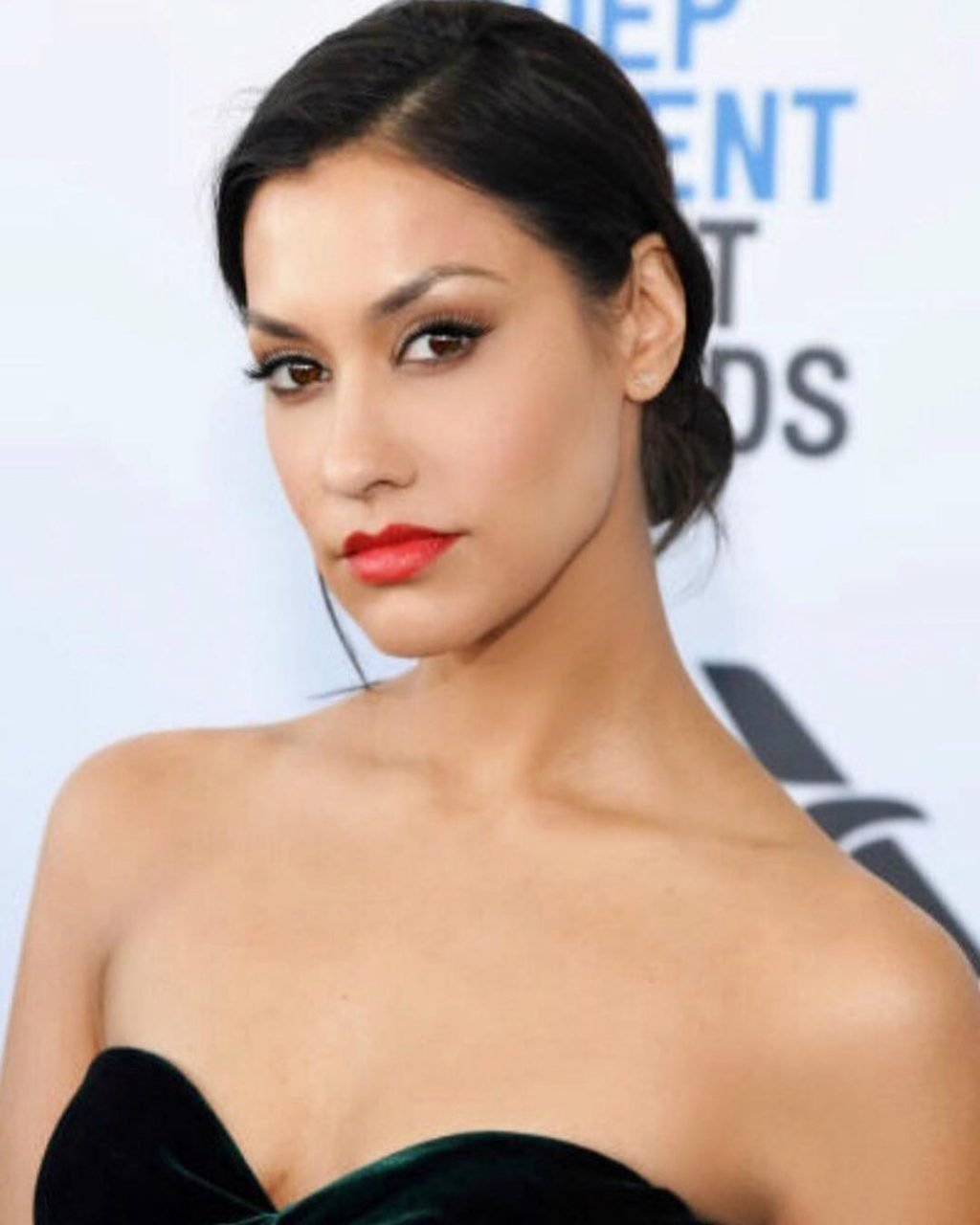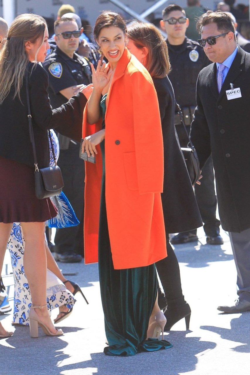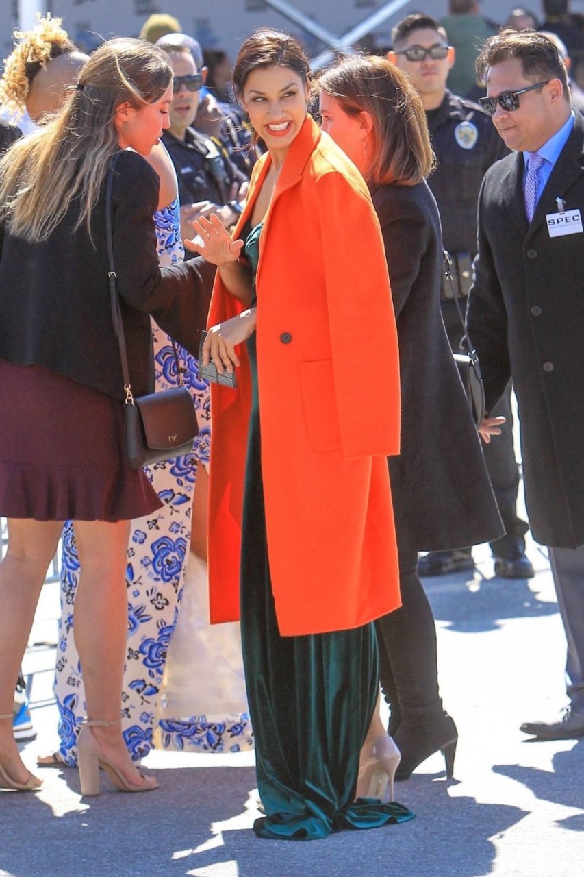 Янина Гаванкар в Санта-Монике на церемонии Independent Spirit Awards, которую вела Обри Плаза, 23.02.2019. 38-летняя актриса надела яркое неоново-оранжевое пальто поверх атласного темно-зеленого платья. Янина выбрала туфли нюдового цвета, чтобы завершить образ.
