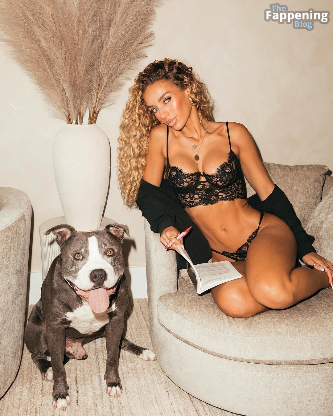 Джена Фрумс демонстрирует потрясающее декольте, показывая свои огромные груди, подтянутые ноги и спортивную фигуру в очень сексуальном черном кружевном белье.