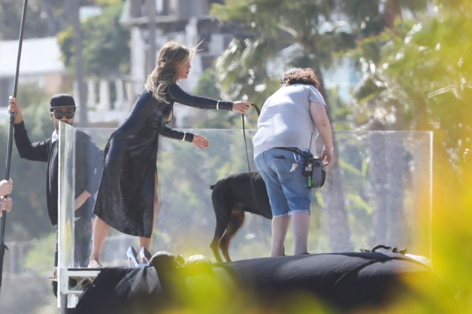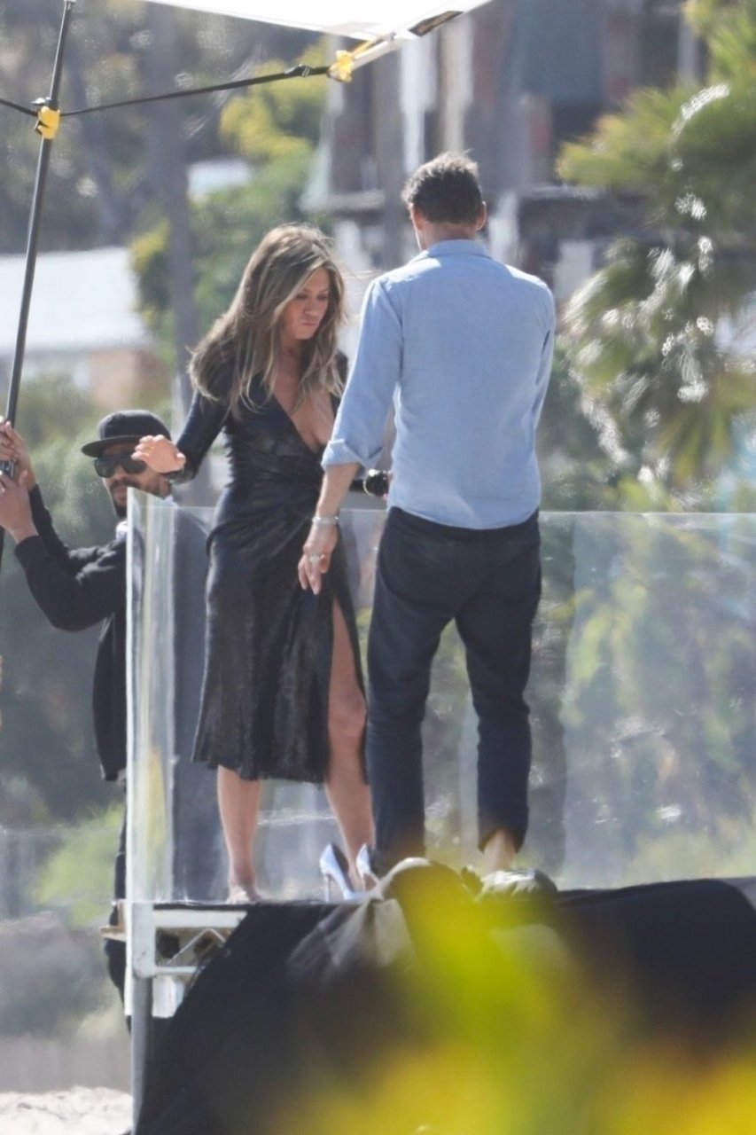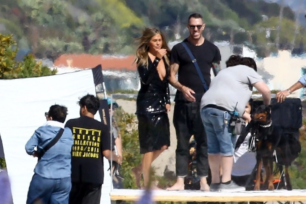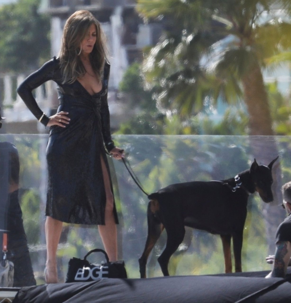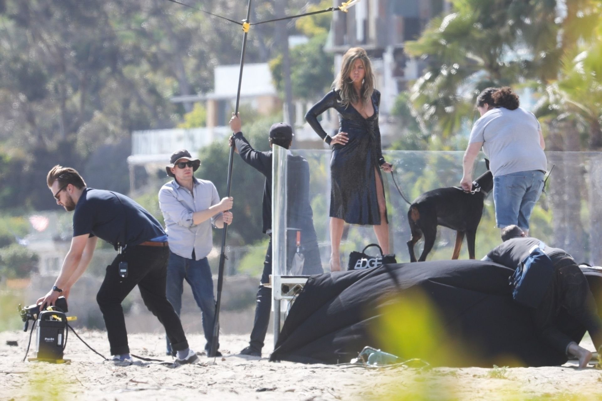 Дженнифер Энистон позирует для сексуальной фотосессии на пляже в Малибу, 27.03.2019. Энистон позировала с собакой в откровенном черном латексном платье с глубоким вырезом, а затем надела другое черное платье, которое также имело глубокий вырез.