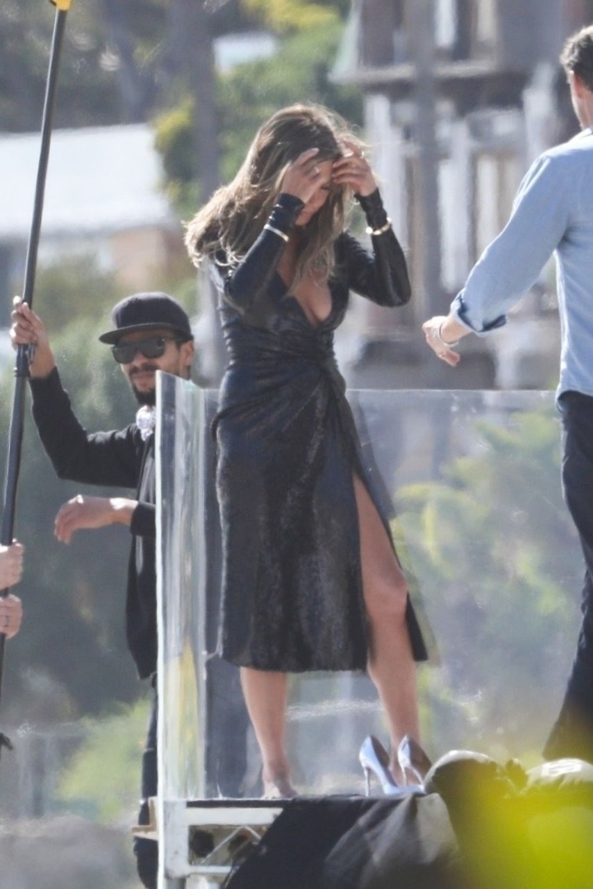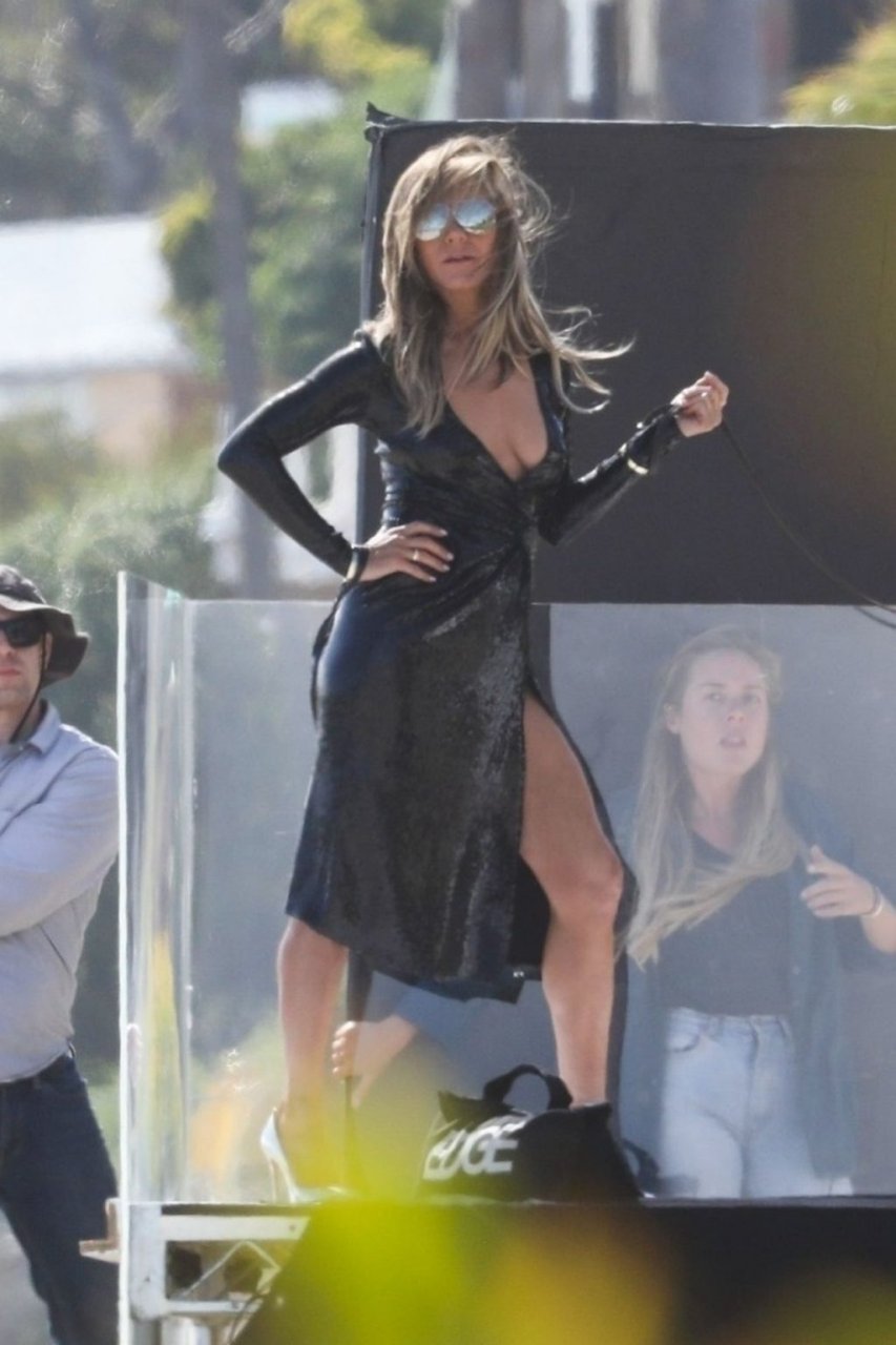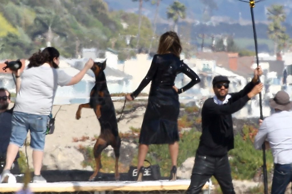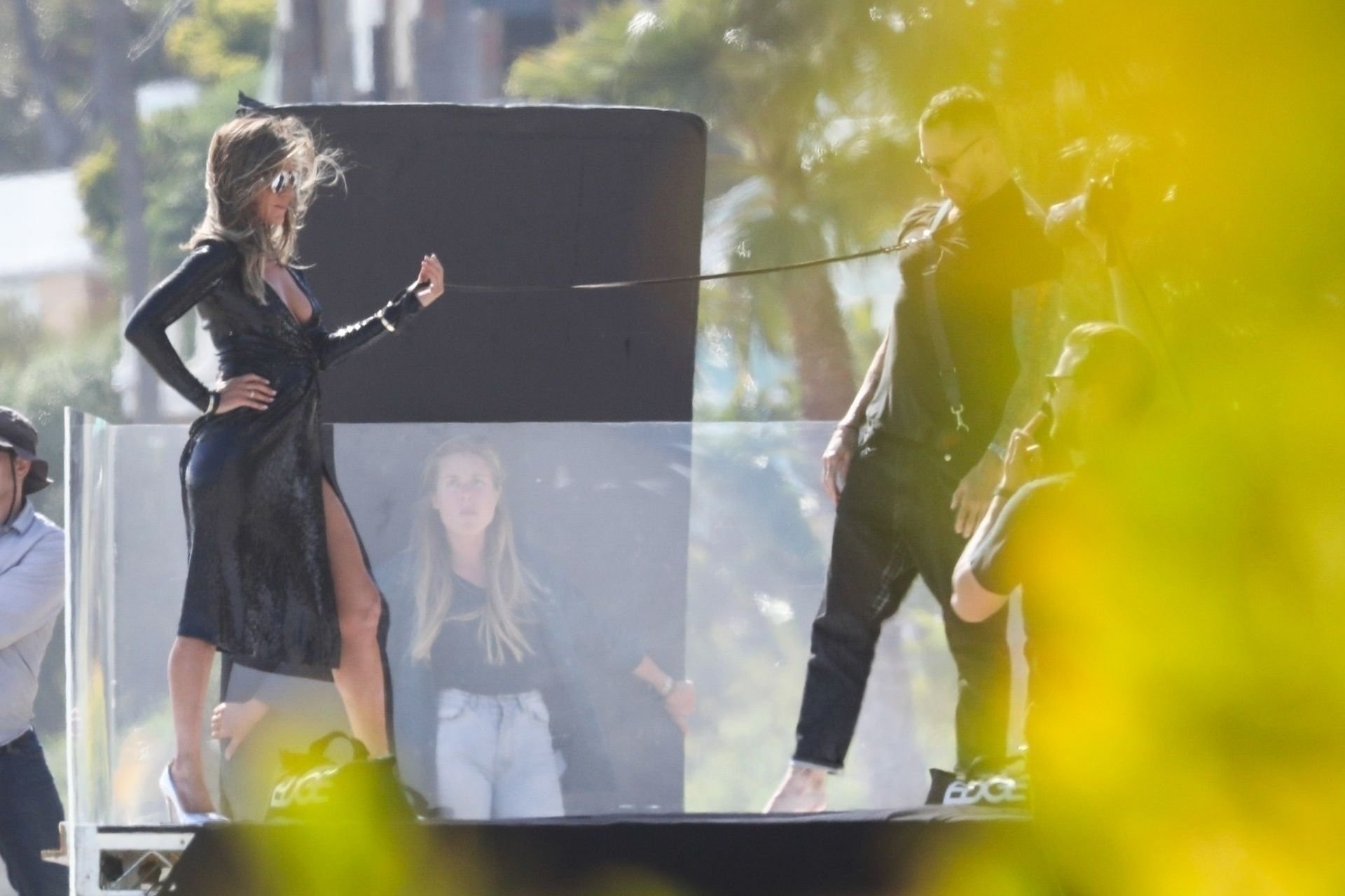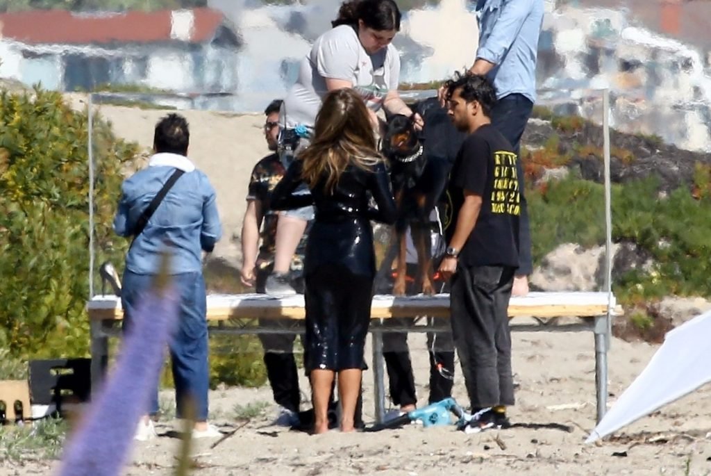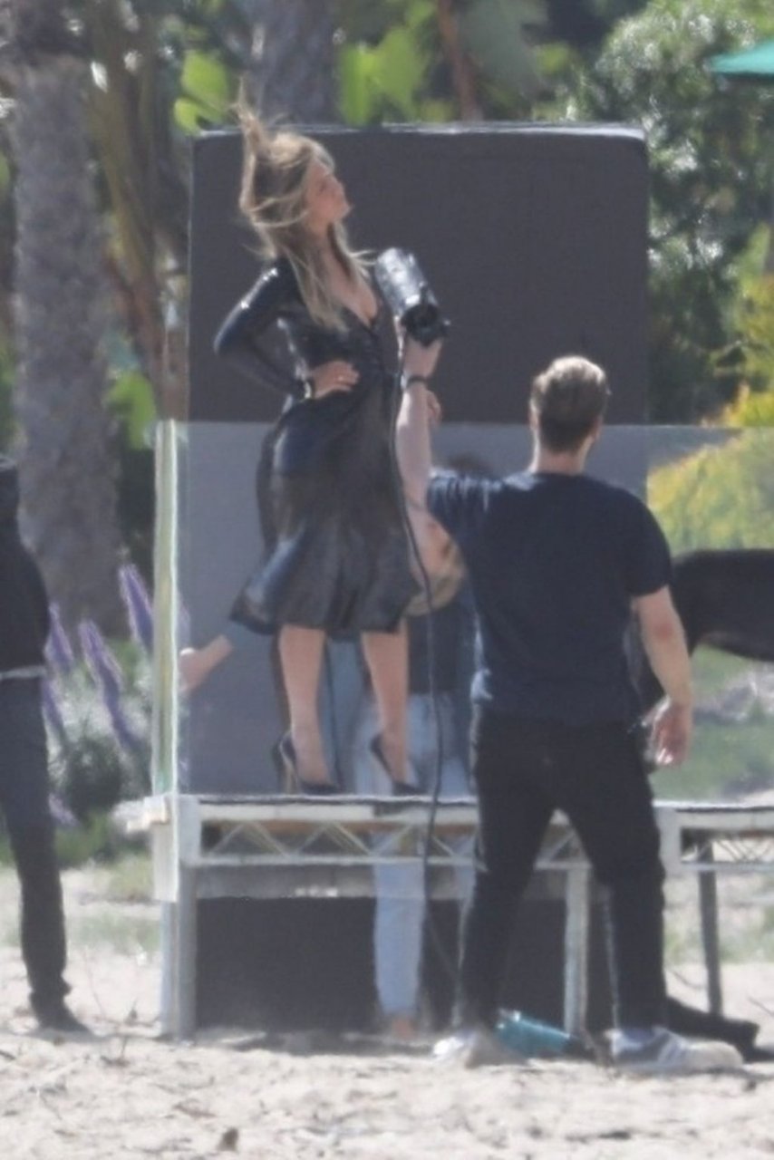 Дженнифер Энистон позирует для сексуальной фотосессии на пляже в Малибу, 27.03.2019. Энистон позировала с собакой в откровенном черном латексном платье с глубоким вырезом, а затем надела другое черное платье, которое также имело глубокий вырез.