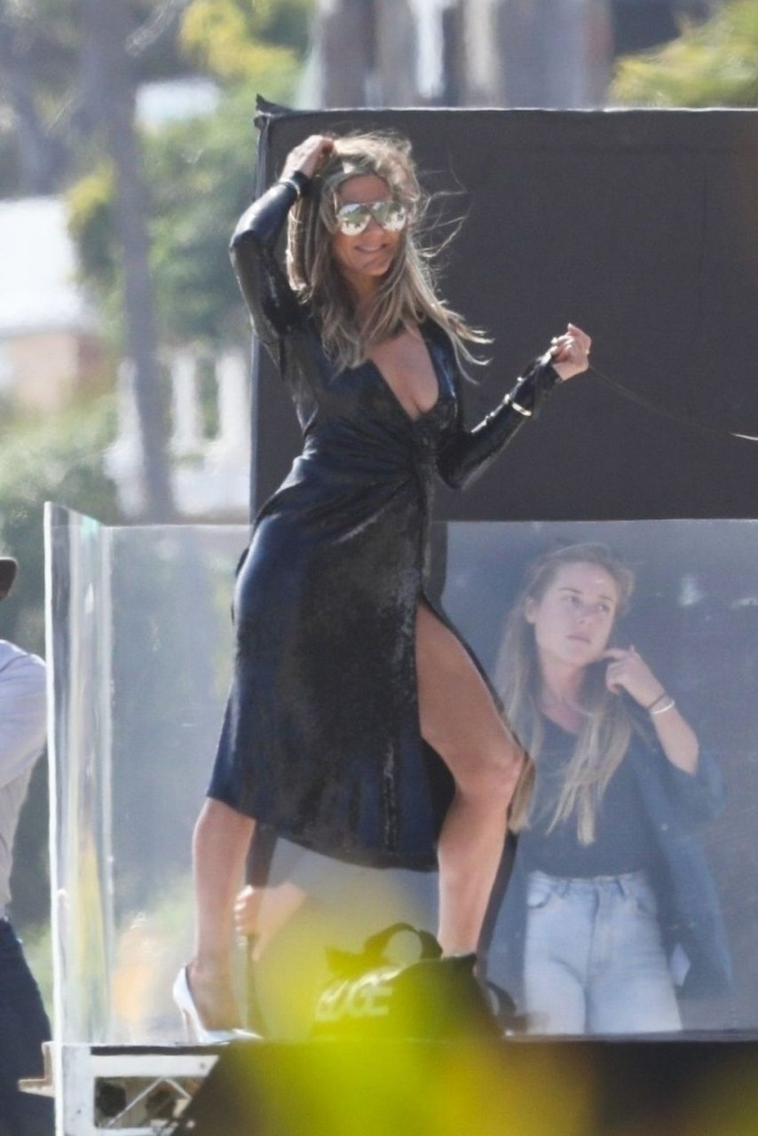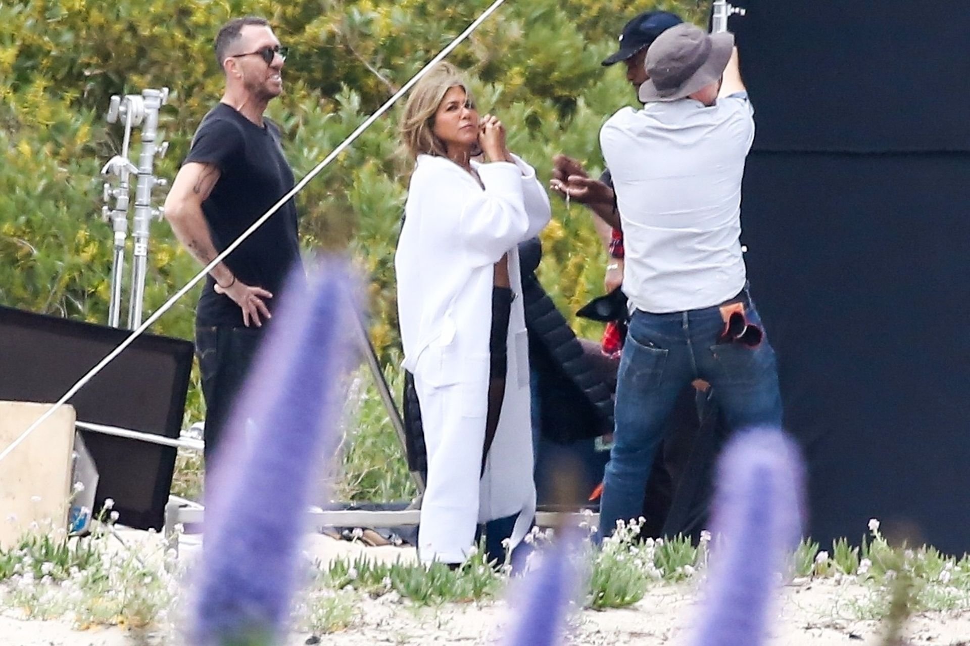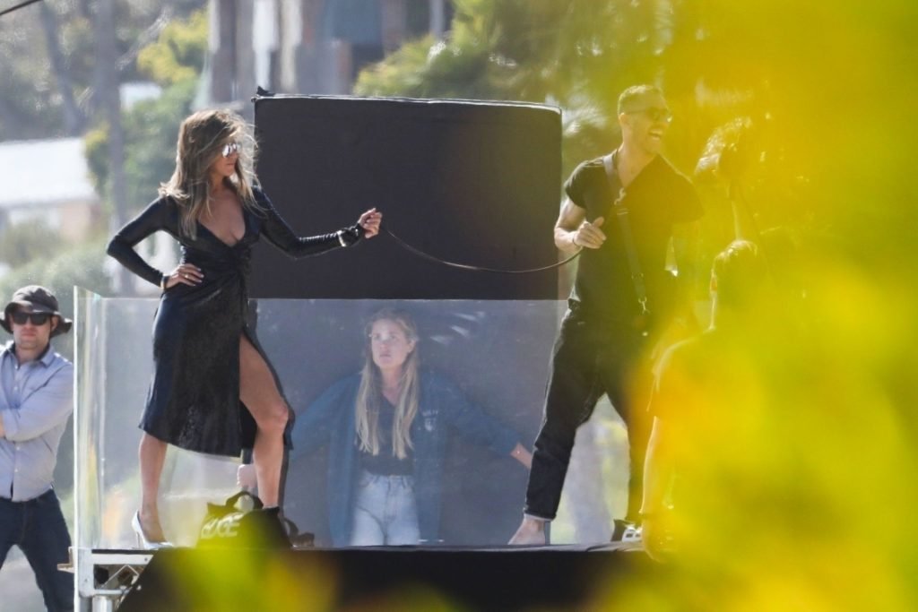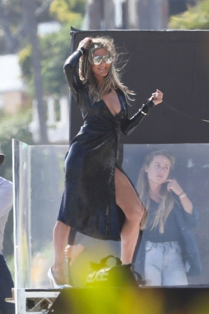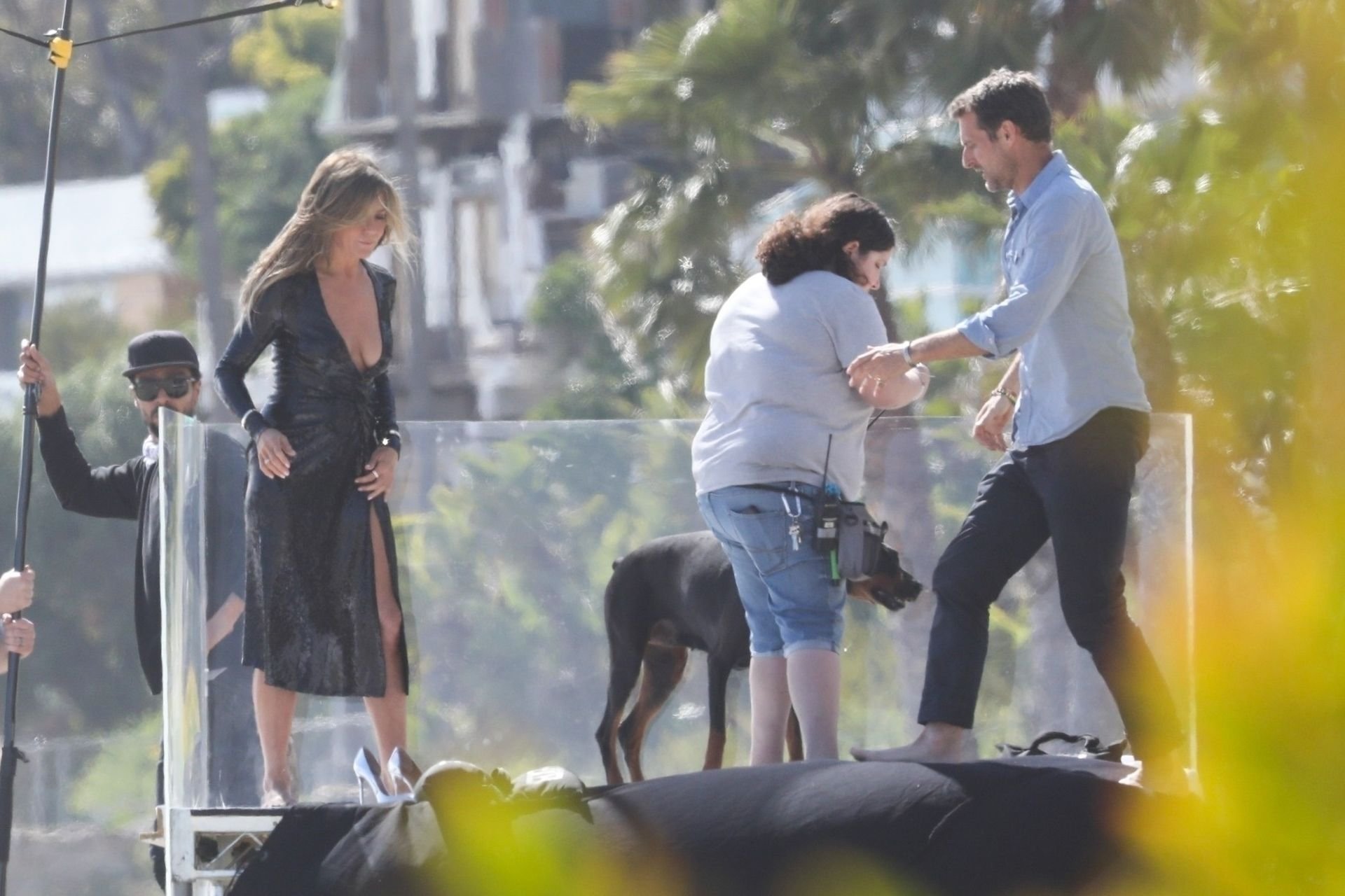 Дженнифер Энистон позирует для сексуальной фотосессии на пляже в Малибу, 27.03.2019. Энистон позировала с собакой в откровенном черном латексном платье с глубоким вырезом, а затем надела другое черное платье, которое также имело глубокий вырез.