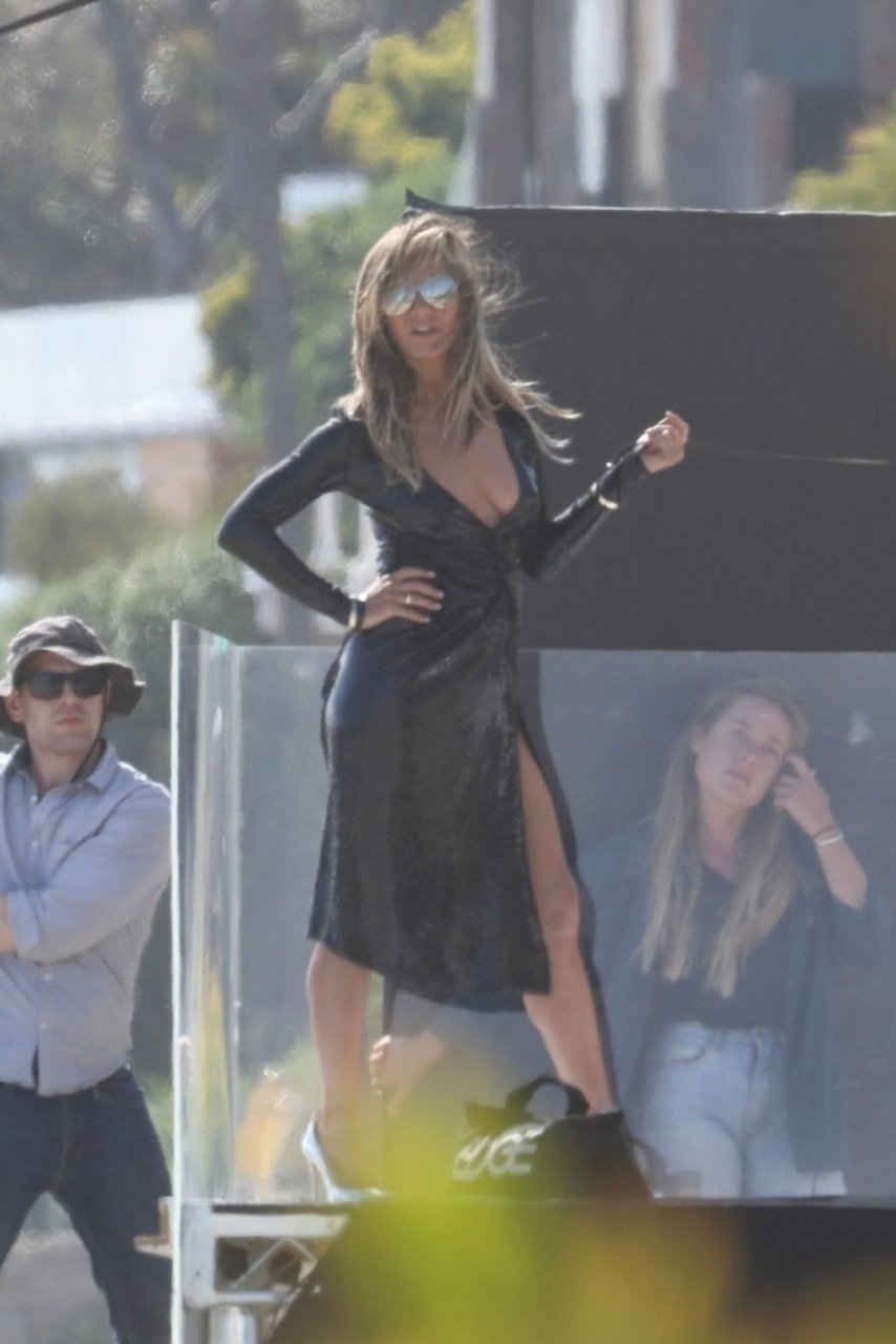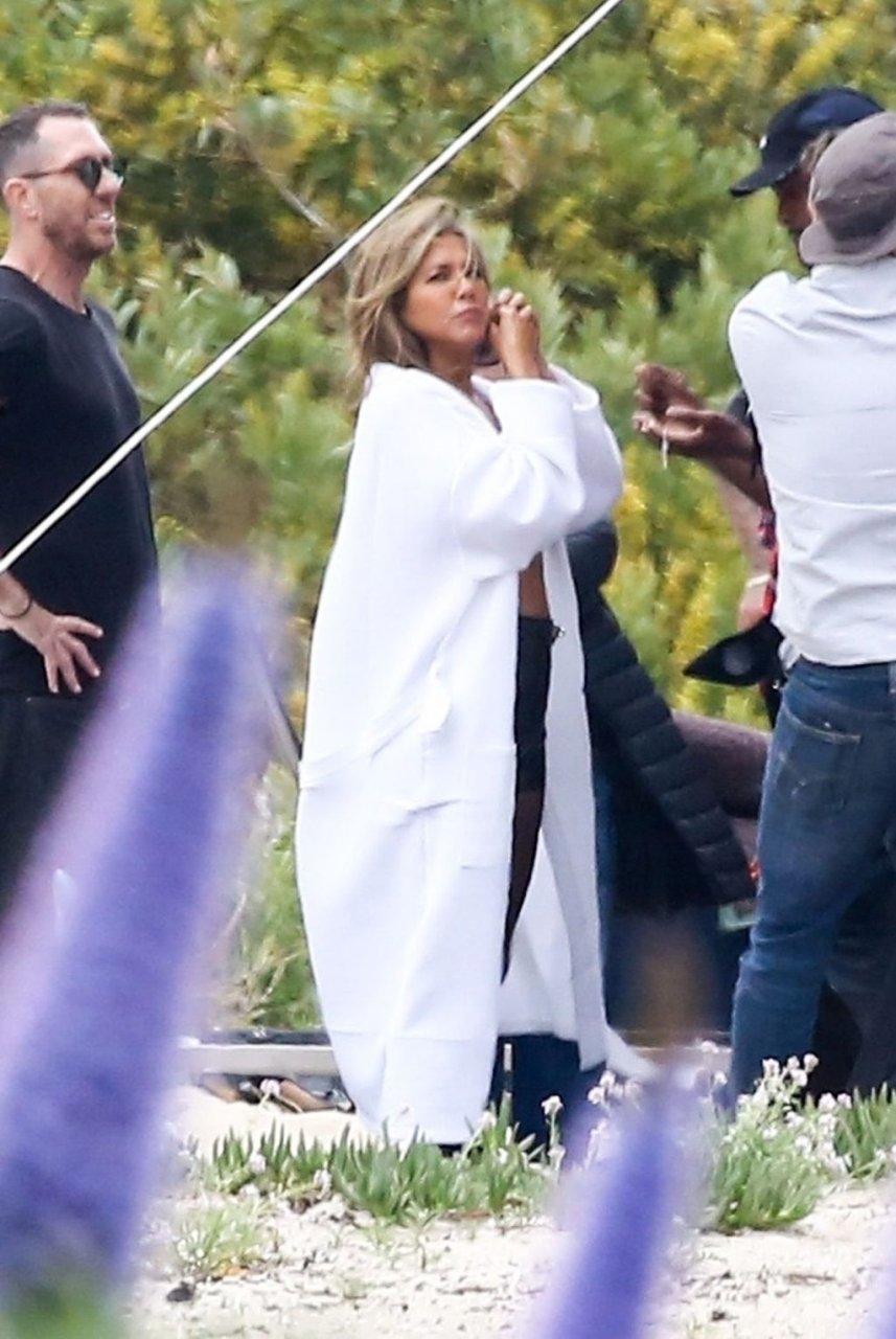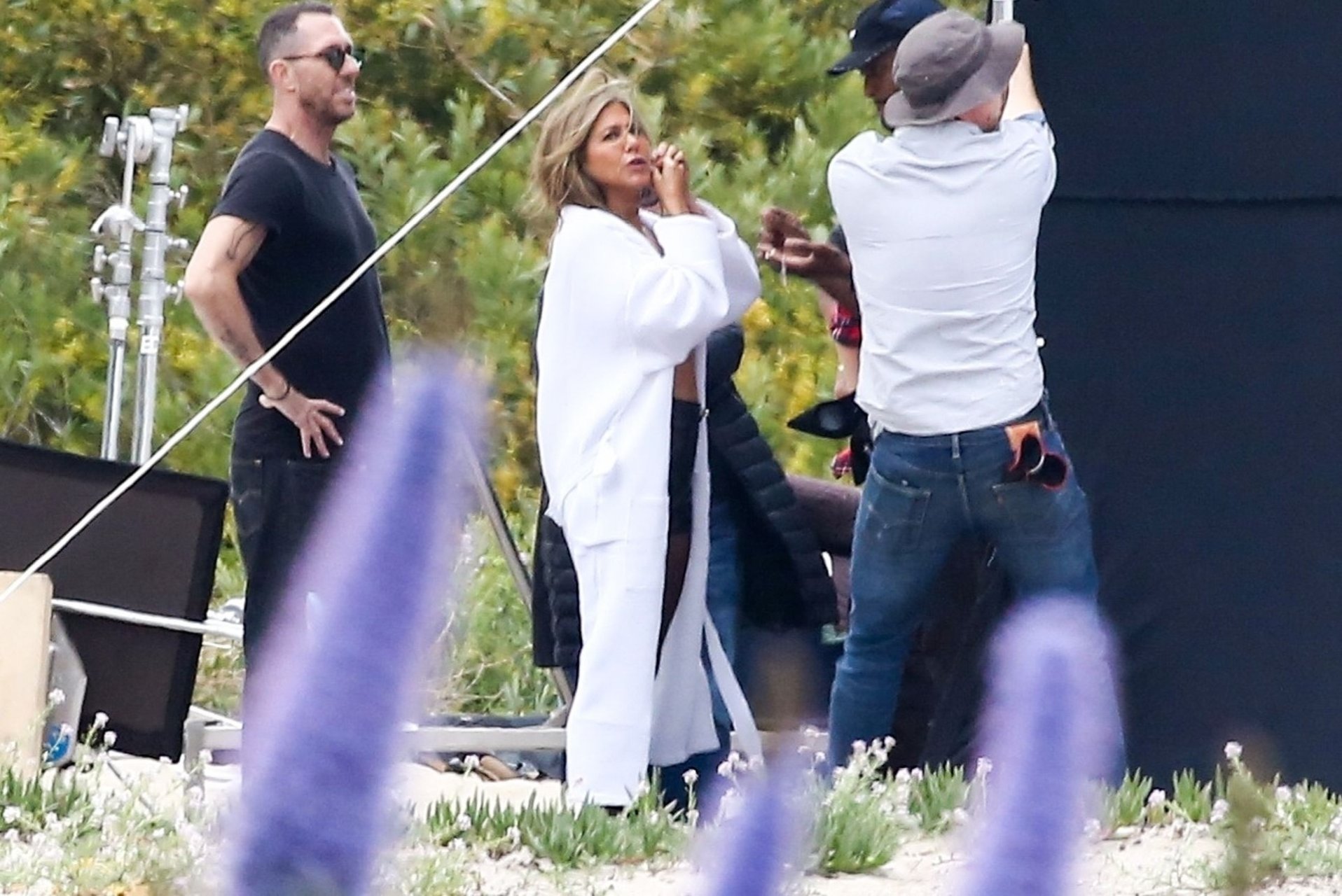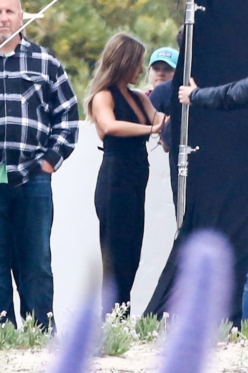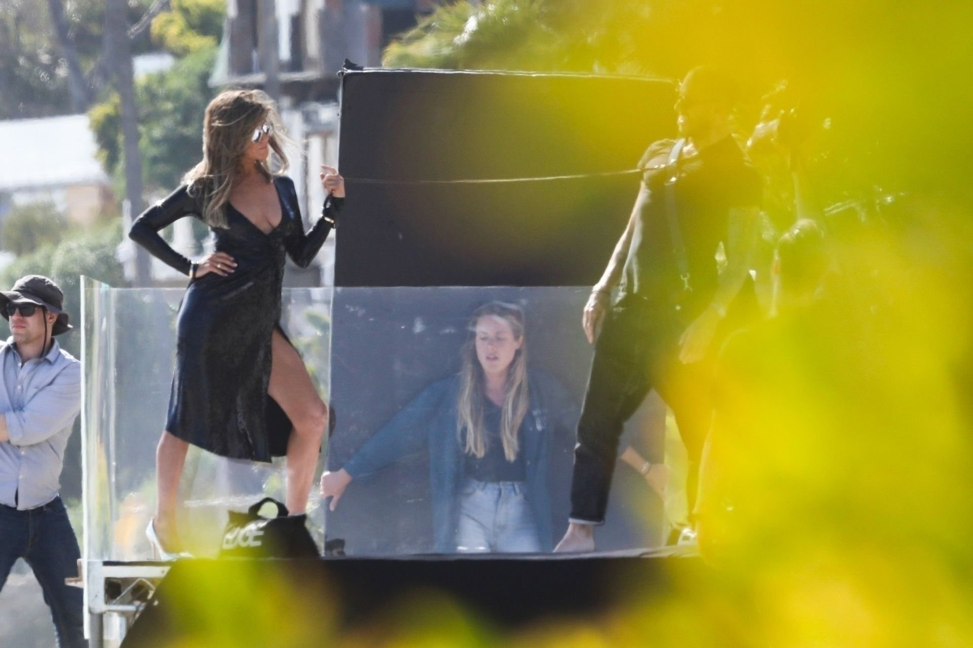 Дженнифер Энистон позирует для сексуальной фотосессии на пляже в Малибу, 27.03.2019. Энистон позировала с собакой в откровенном черном латексном платье с глубоким вырезом, а затем надела другое черное платье, которое также имело глубокий вырез.