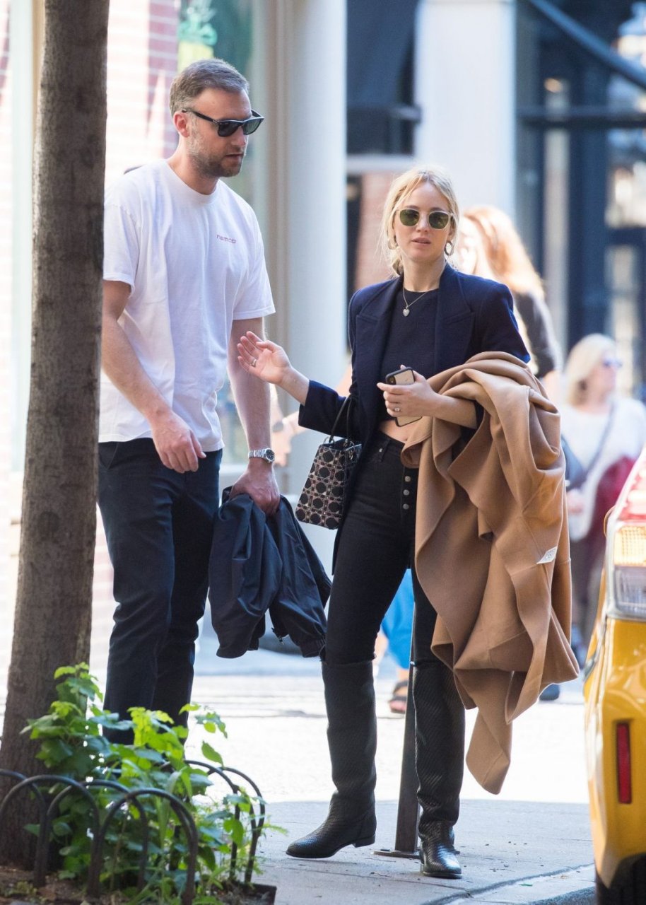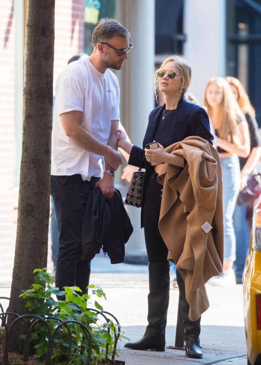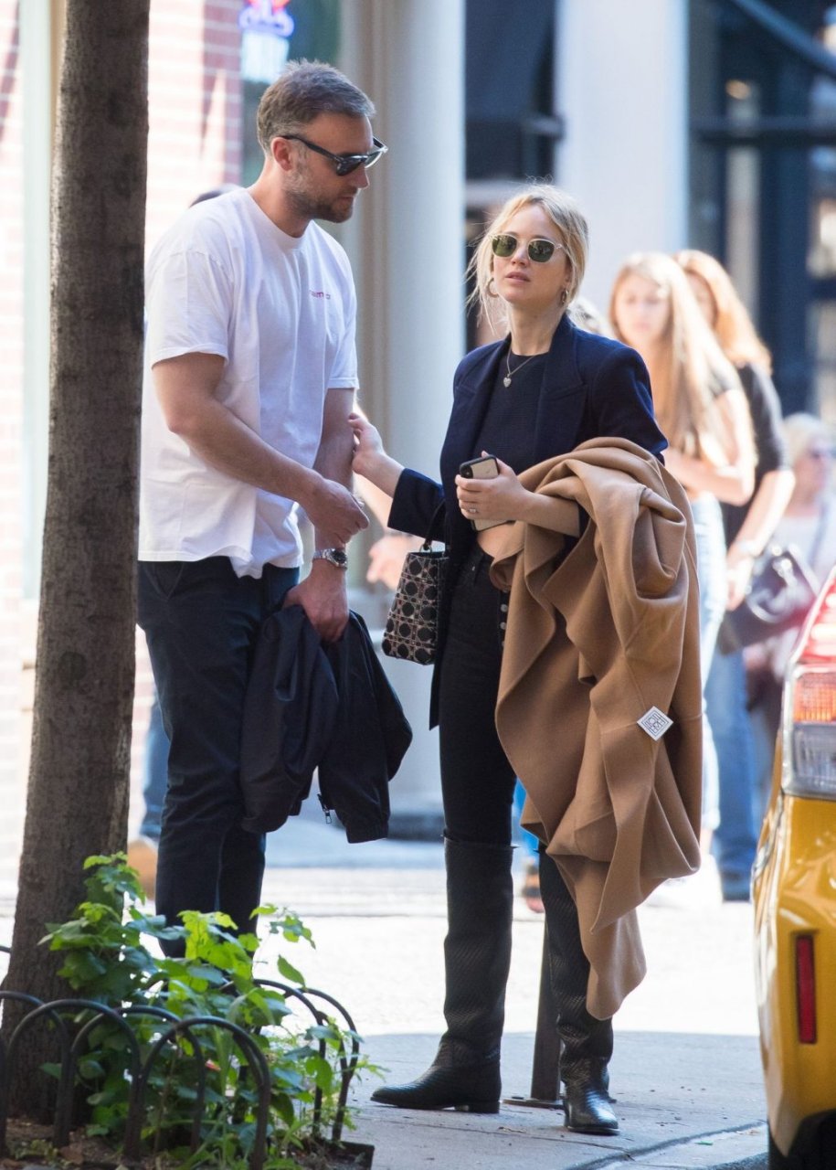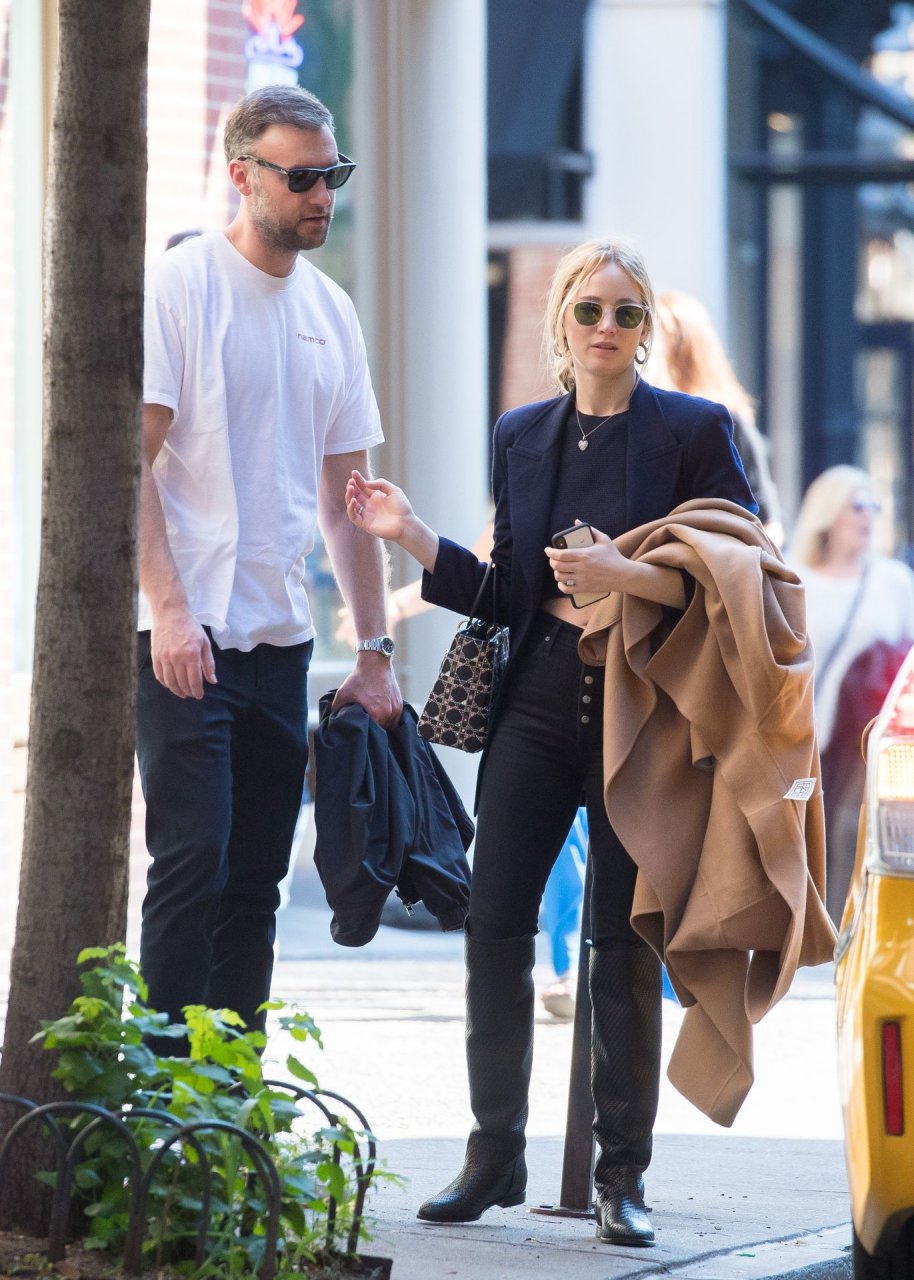 Дженнифер Лоуренс и Кук Мэрони долго целовались перед тем, как разойтись в Нью-Йорке, 14.10.2019. 29-летняя актриса несла сумку Dior и была одета в черный пиджак, кроп-топ, брюки с застежкой на пуговицы и высокие сапоги до колена.
